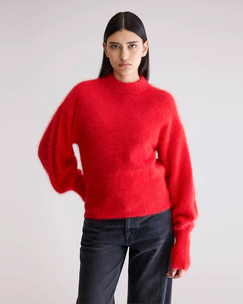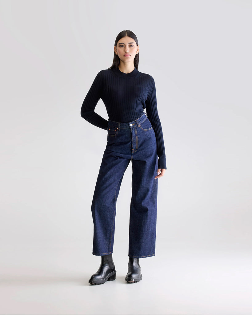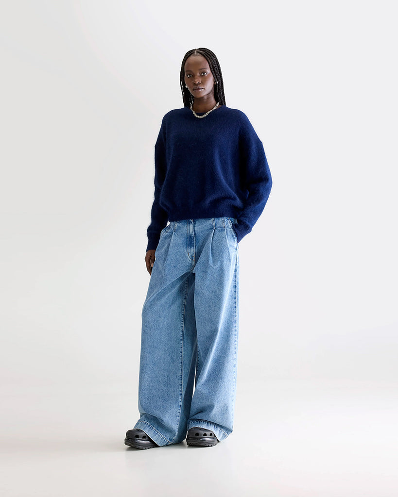 Gruby, luźny sweter Niby Blue Marl marki American Vintage z długim rękawem i golfem. Zakończony ściągaczami. Wykonany z ultraciepłej, miękkiej dzianiny z alpaką. Noś go z jeansami lub spódnicą, aby uzyskać swobodny look.