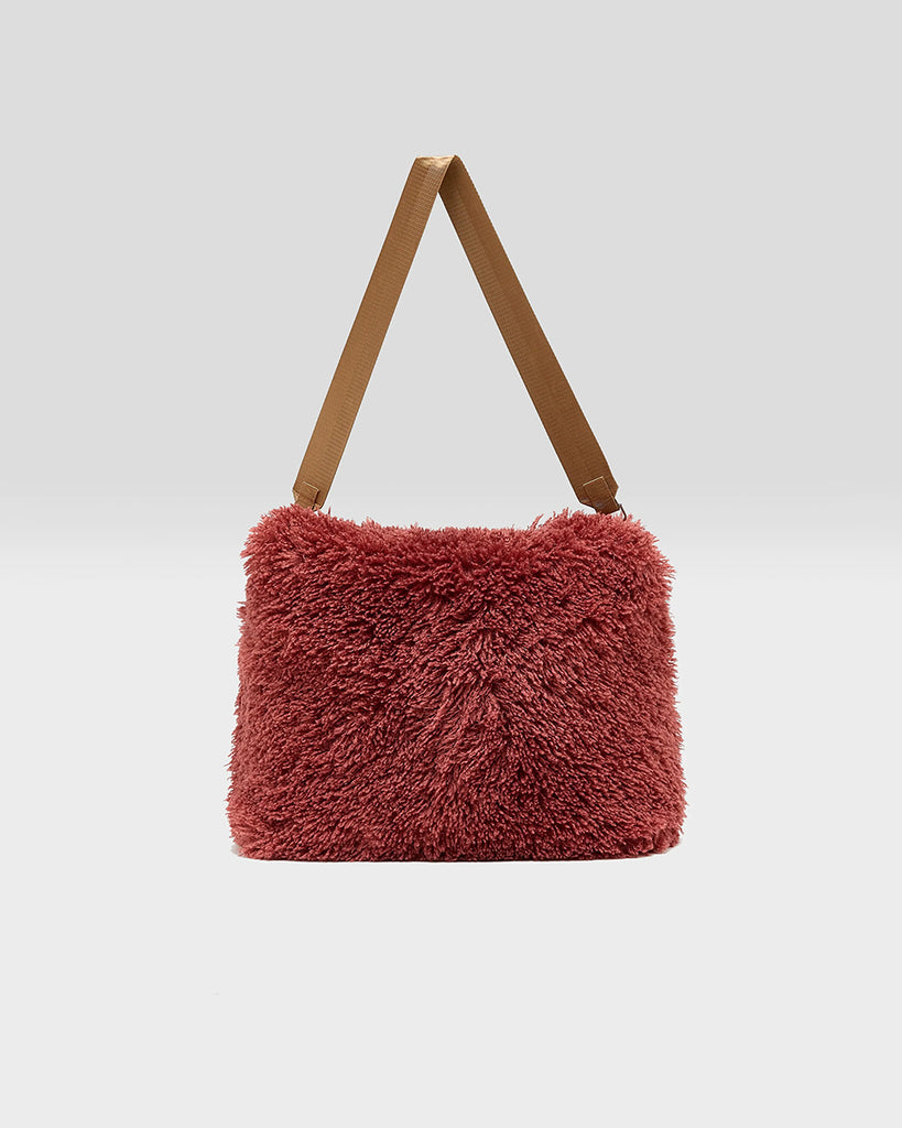 Zamszowa, brązowa torebka o średniej wielkości Big Rouje z zaokrąglonymi kątami i krótkim, regulowanym paskiem do wygodnego trzymania w dłoni i zawieszenia na ramieniu. Zapinana za pomocą magnesu. Wewnątrz obszyta różową, satynową podszewką.