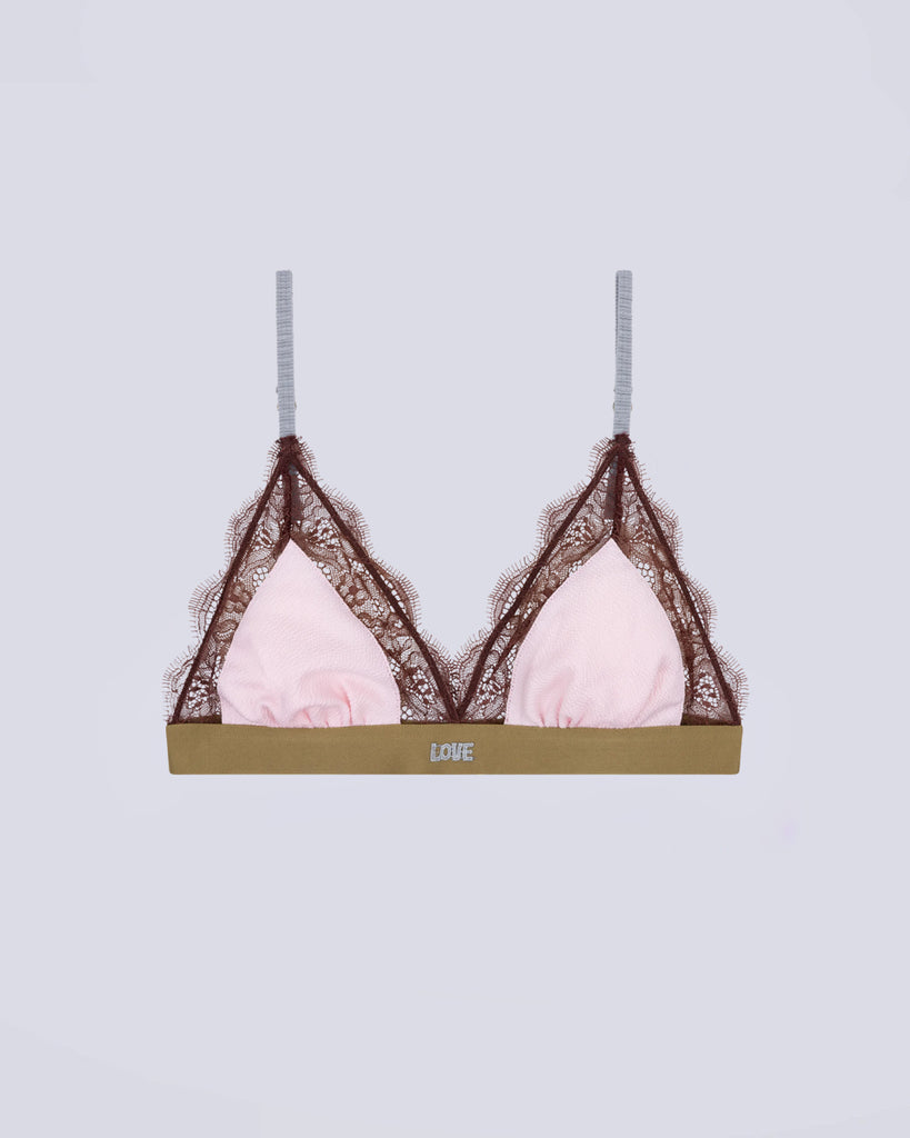 Delikatny, miękki stanik z trójkątnymi miseczkami Jane M Love Stories. Wykonany z miękkiej, satynowej tkaniny obszytej delikatną koronką. Posiada regulowane ramiączka i jest zapinany za pomocą haftek.