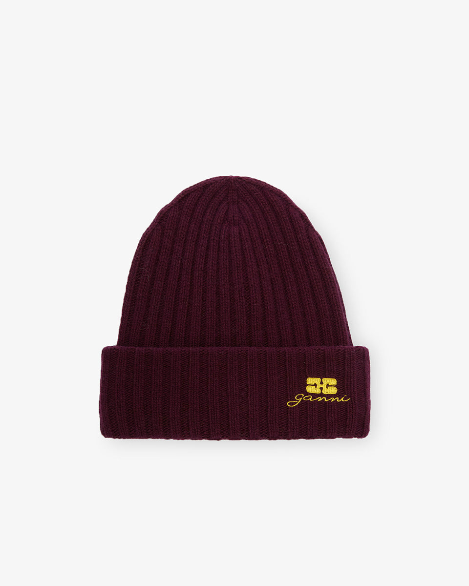 Burgundowa, prążkowana, wywijana czapka 6930 Burgundy marki GANNI z wyhaftowanym logo marki. Wykonana z dzianiny z wełną.