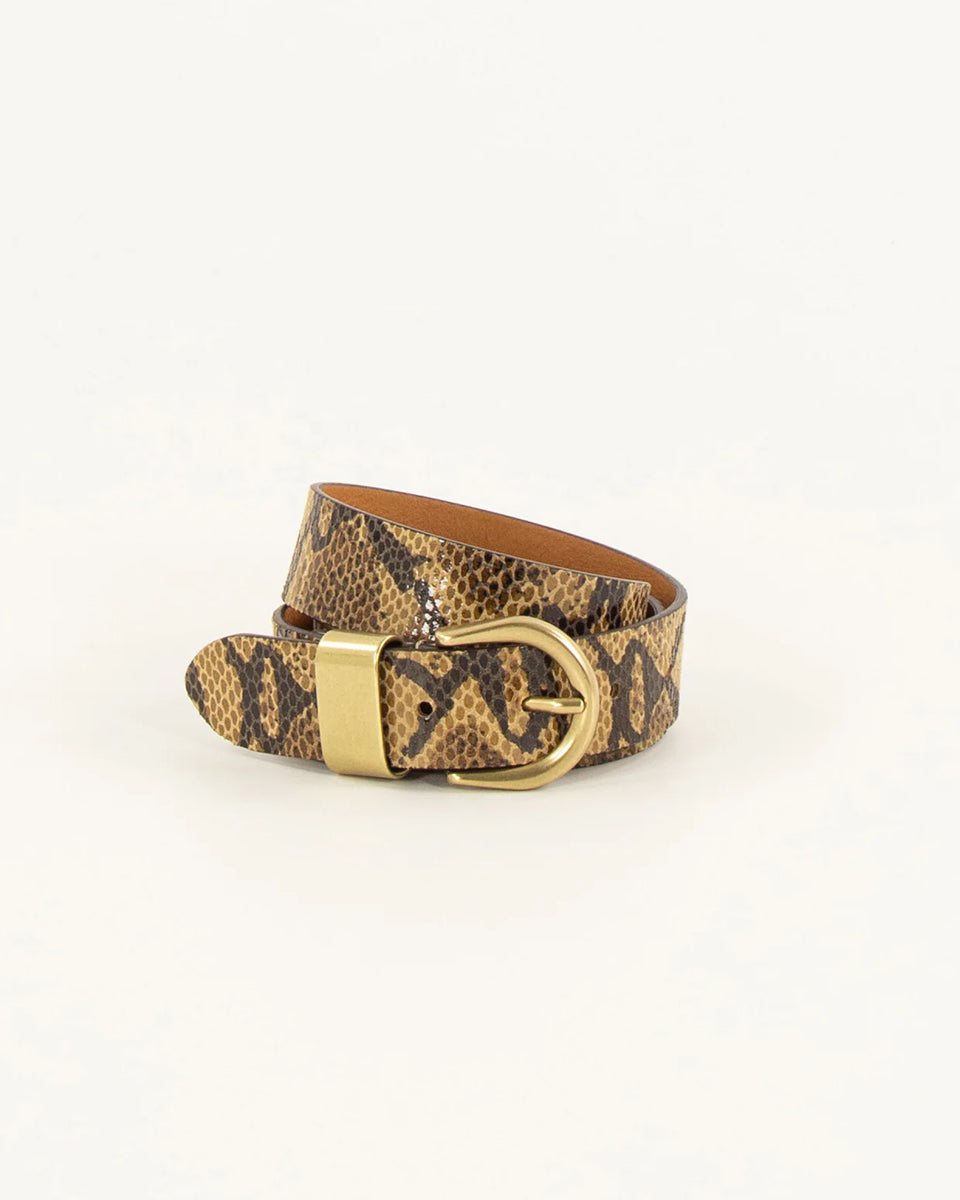 Pasek Miloa Sabana Pyth marki Sessun wykonany ze skóry krowiej zamszowej z nadrukiem węża, z grawerowaną klamrą i metalową szlufką.