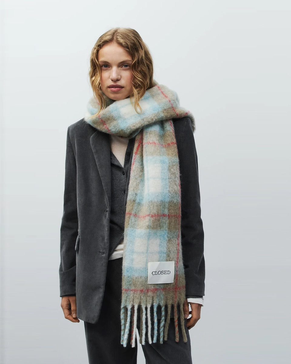 Ciepły, duży szalik w kratę CLOSED z frędzlami. Posiada dużą naszywkę z logo marki. Wykonany z miękkiej dzianiny z alpaką. Wykonany we Włoszech.