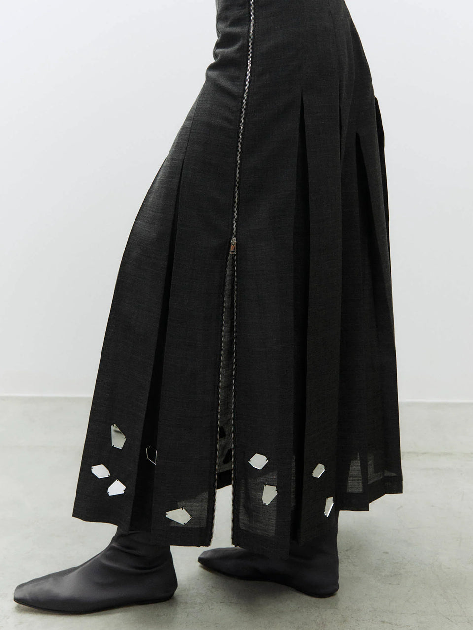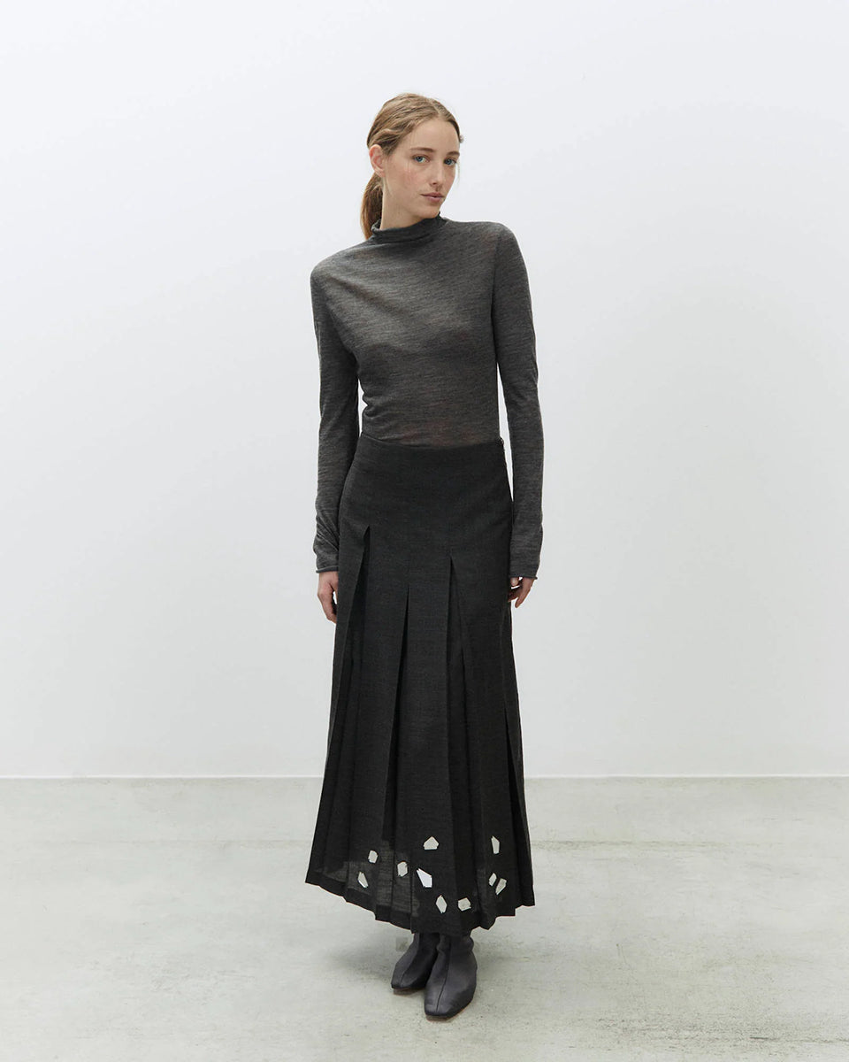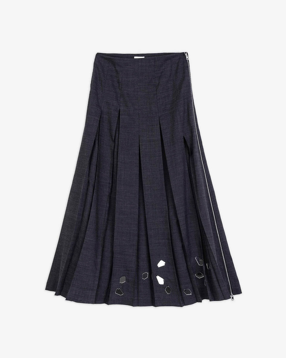 Długa, plisowana spódnica Gonna Carbone z rozkloszowanym dołem i dopasowaną talią z wysokim stanem. U dołu zdobiona jest ręcznie wyszywanym haftem. Zapinana z boku na zamek błyskawiczny. Wykonana jest z mieszanki z wełną.