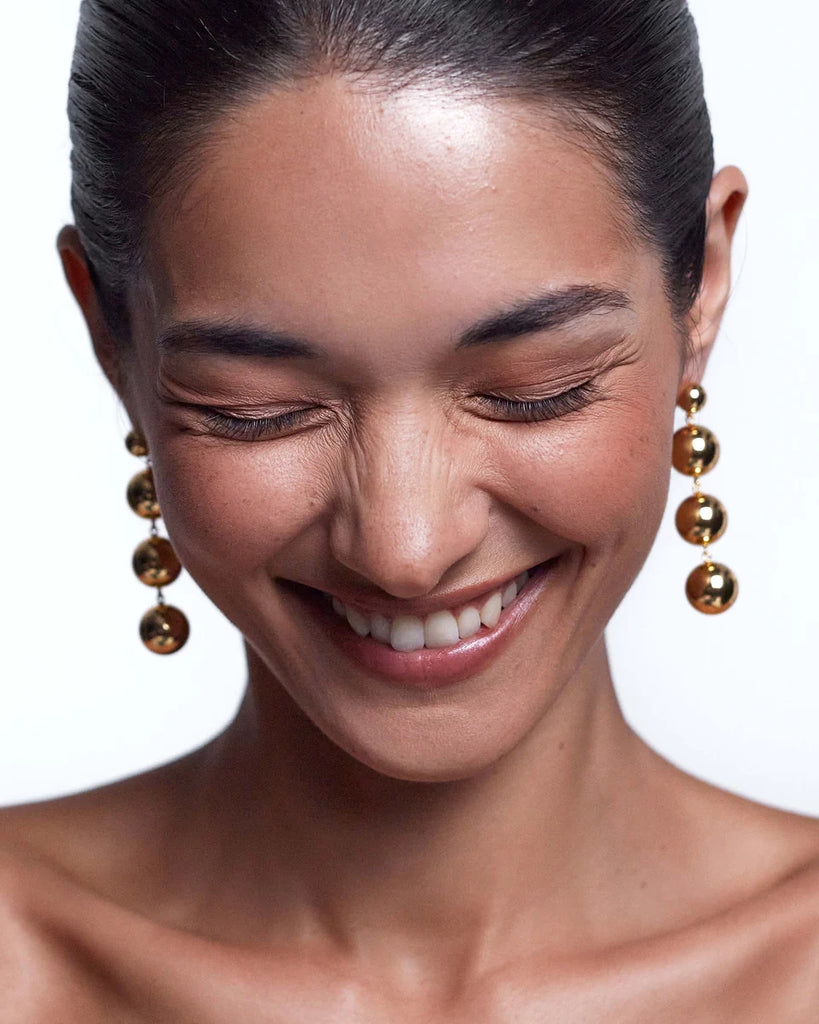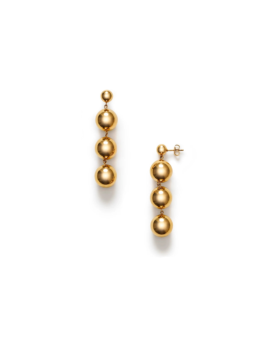 Efektowne, wiszące, pozłacane kolczyki z trzema kulami. Zapinane na sztyft.