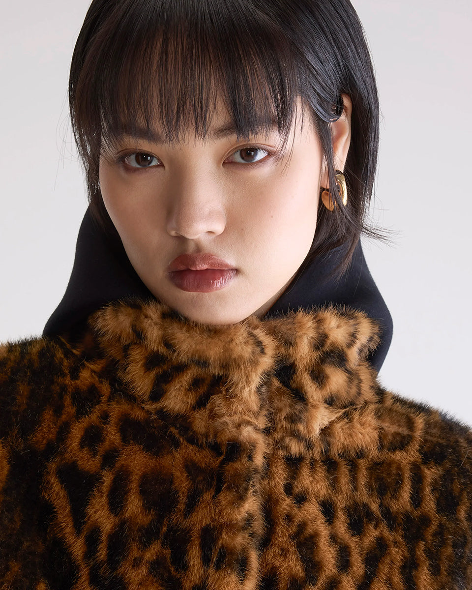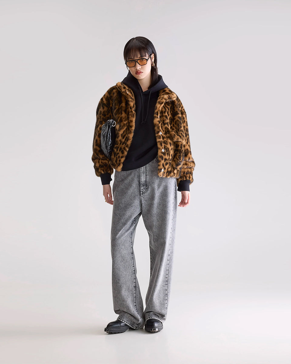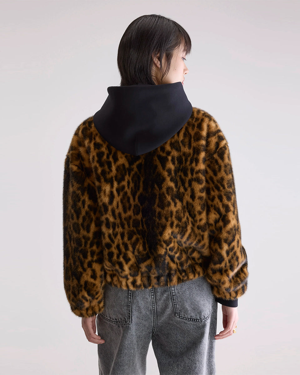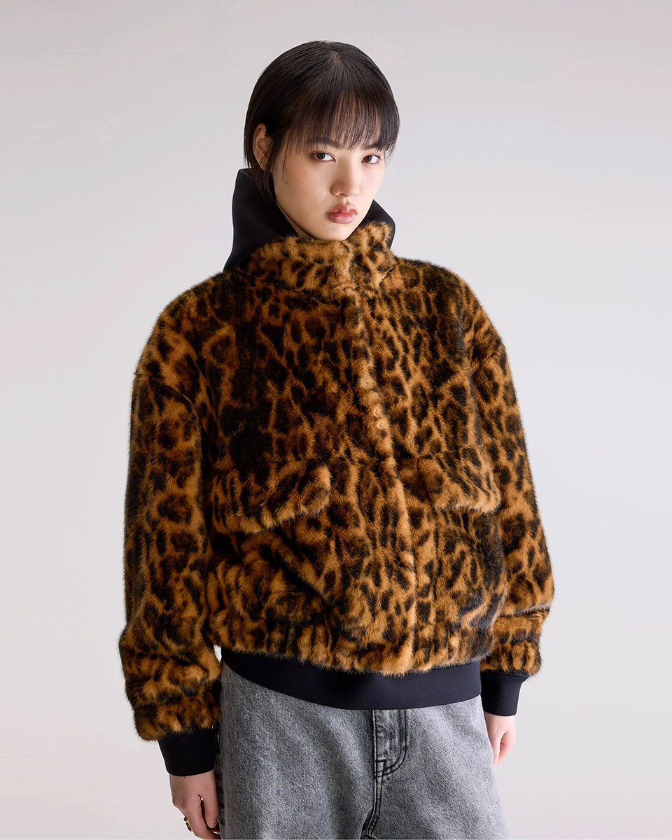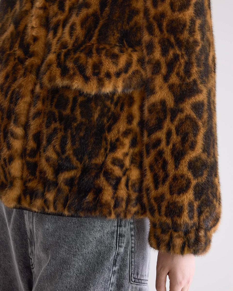 Krótka, luźna kurtka ze sztucznego futra w panterkę Enora Bellerose z wysokim, zapinanym pod szyję kołnierzem i luźnymi, reglanowymi rękawami zakończonymi elastycznymi ściągaczami. Kurtka ma z przodu dwie, duże kieszenie z klapkami. Jest zapinana na zatrzaskowe guziki.