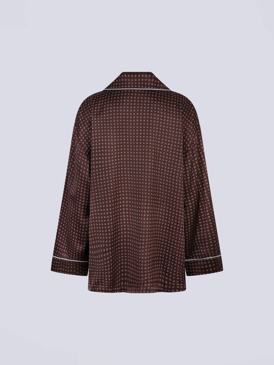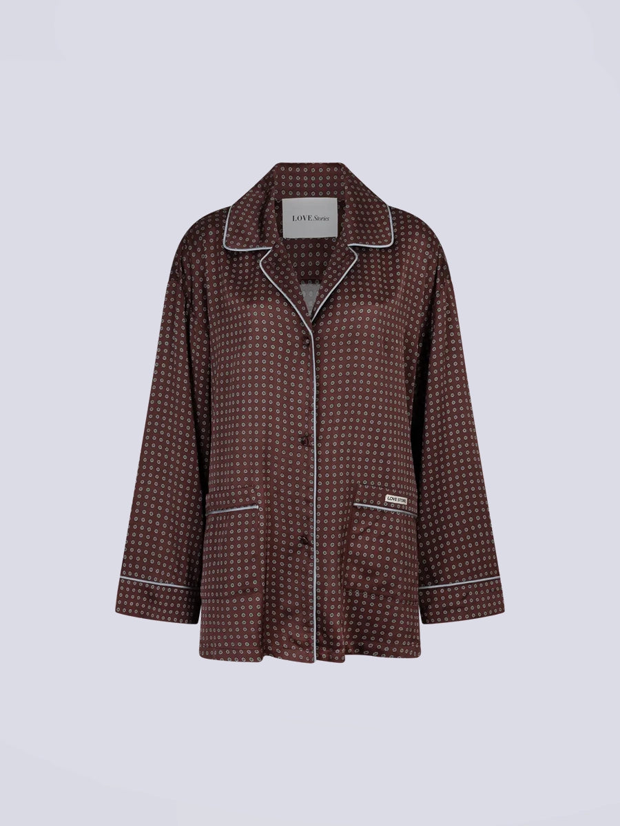 Oversizowa, piżamowa koszula Cedric Love Stories z lejącej, satynowej tkaniny w drobny, kwiatkowy print. Posiada dekolt w kształcie litery V, kołnierzyk i szerokie, długie rękawy. Zapinana na guziki. Obszyta cienką, błękitną lamówką. Koszula ma dwie, przednie kieszenie. Na prawej kieszeni znajduje się niewielka naszywka z logo marki.