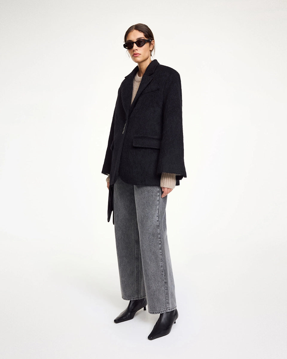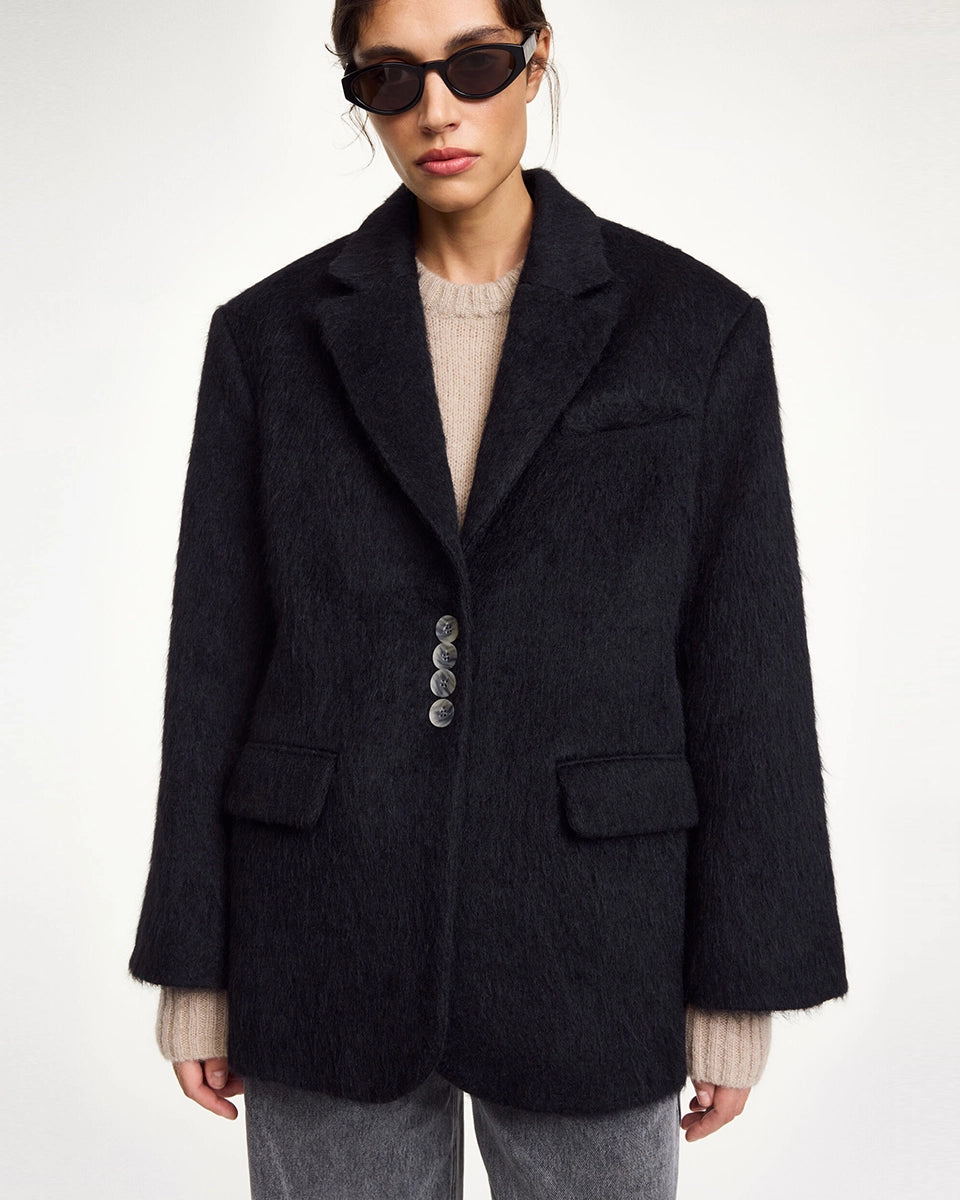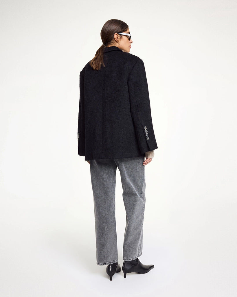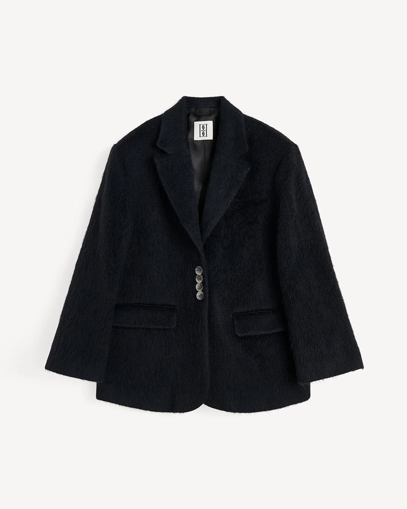 Luźna, gruba marynarka Biena By Malene Birger z szerokimi rękawami. Zapinana na jeden rząd guzików. Marynarka ma kołnierz i dekolt z z kształcie litery V. Wykonana z tkaniny z włosiem z wełną i alpaką. Posiada dwie, przednie kieszenie z klapkami i jedną, niewielką kieszonkę nad lewą piersią oraz podszewkę. Idealna na chłodniejsze dni. Załóż ją do jeansów i cienkiego swetra lub eleganckich spodni i cienkiego golfu.