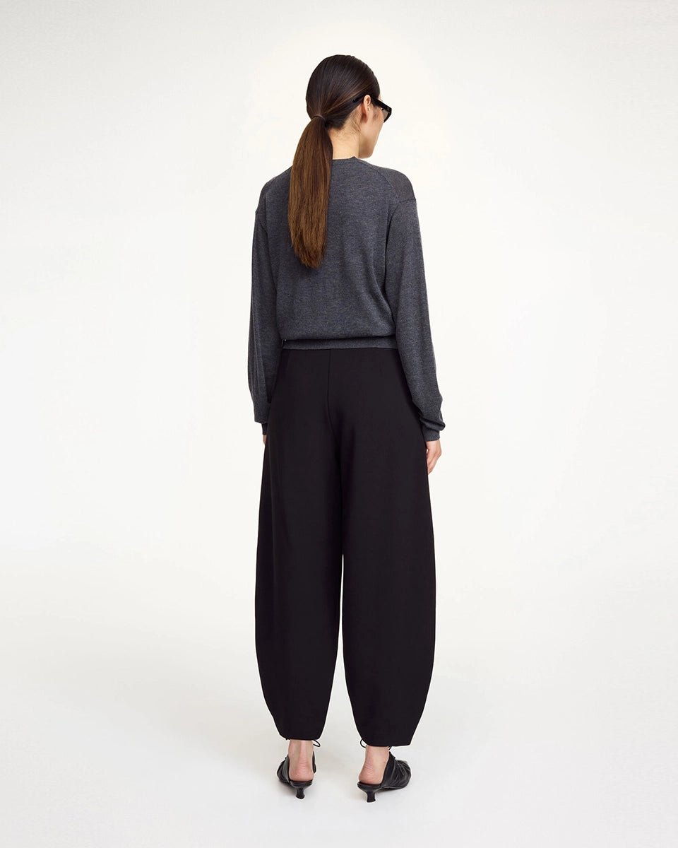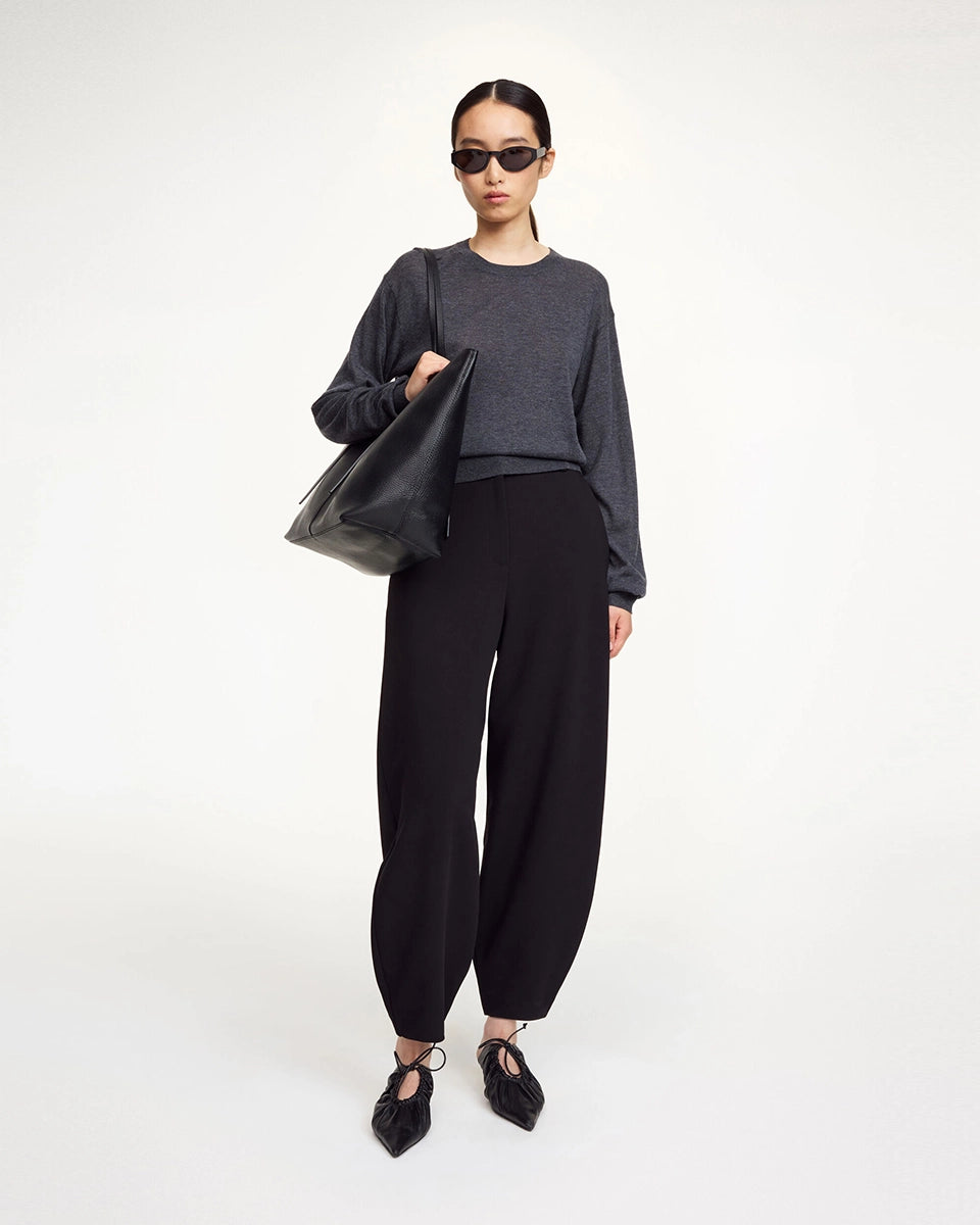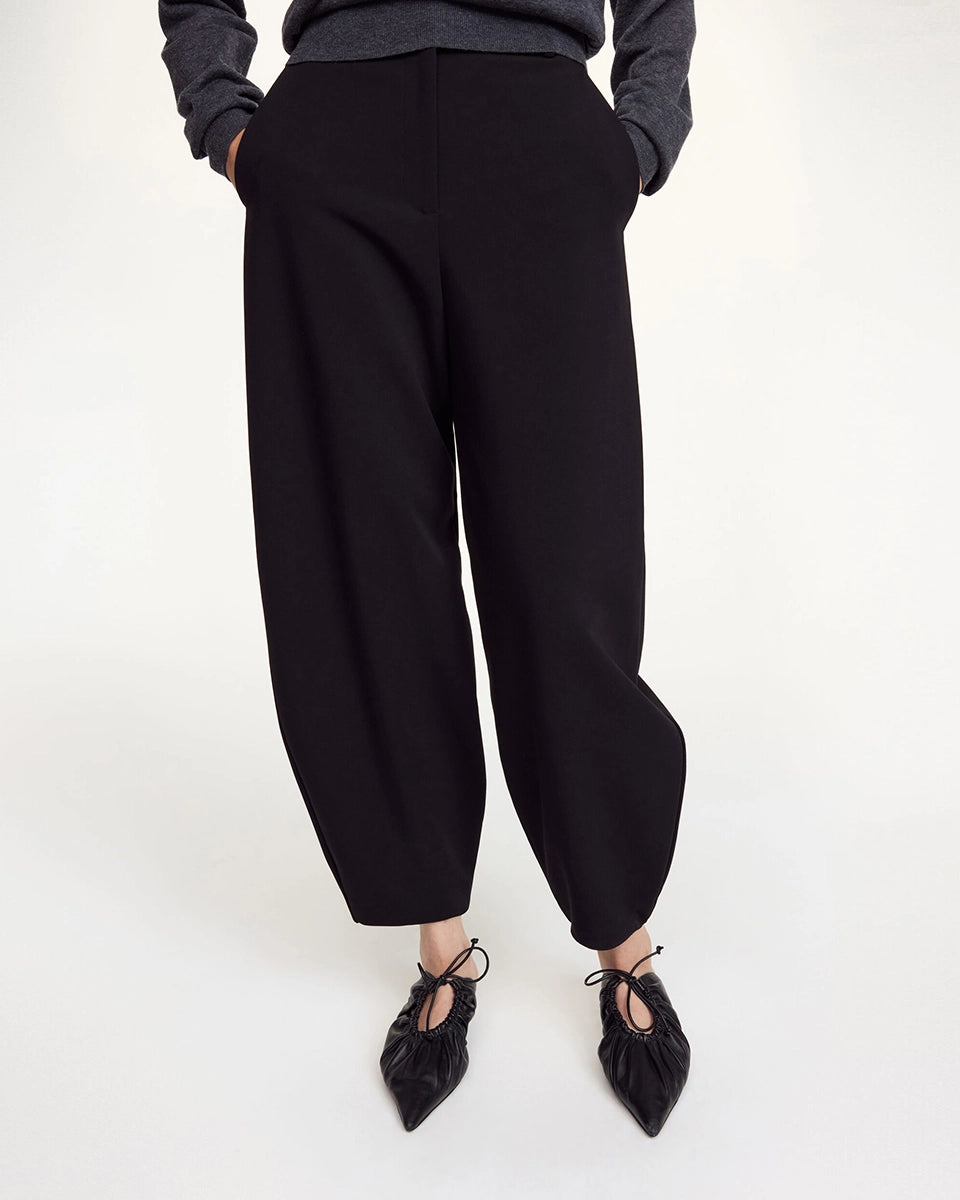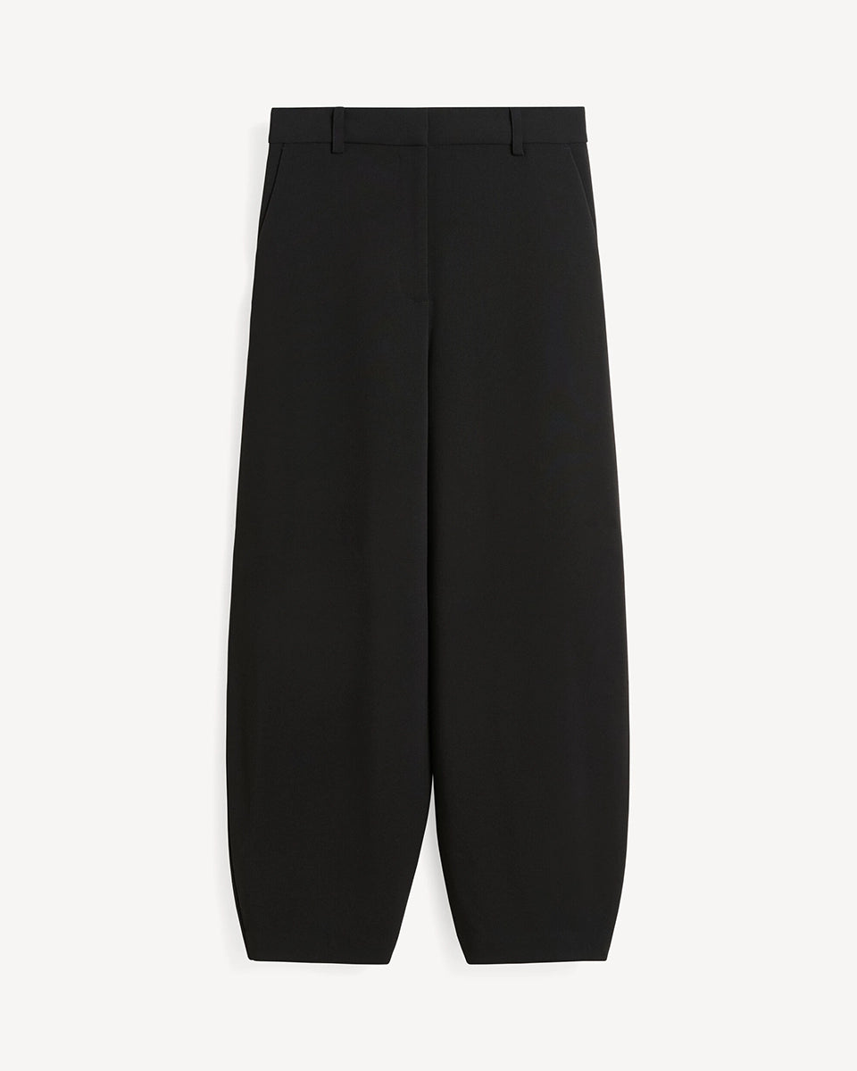 Klasyczne, garniturowe spodnie Carlien By Malene Birger z wysokim stanem i zaokrągloną, zwężaną u dołu nogawką w typie barrel cut. Spodnie posiadają dwie, boczne kieszenie i szlufki na pasek. Zapinane na haftkę i zamek błyskawiczny. Połącz je z cienkim swetrem lub klasyczną koszulą i mokasynami.