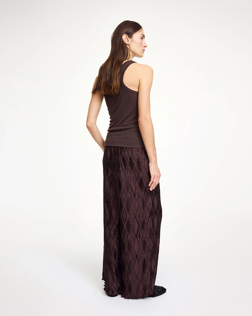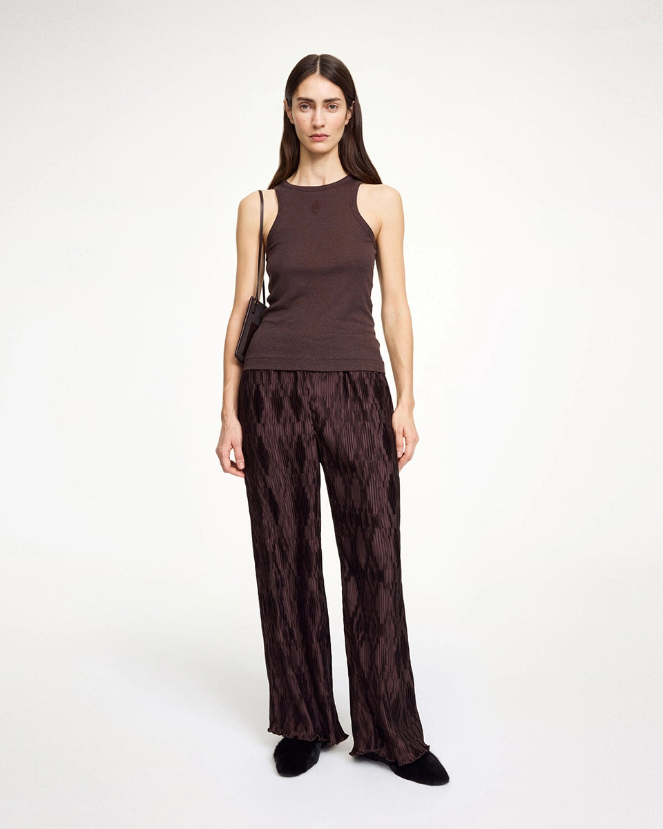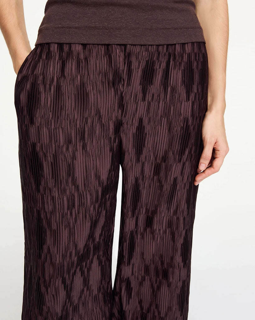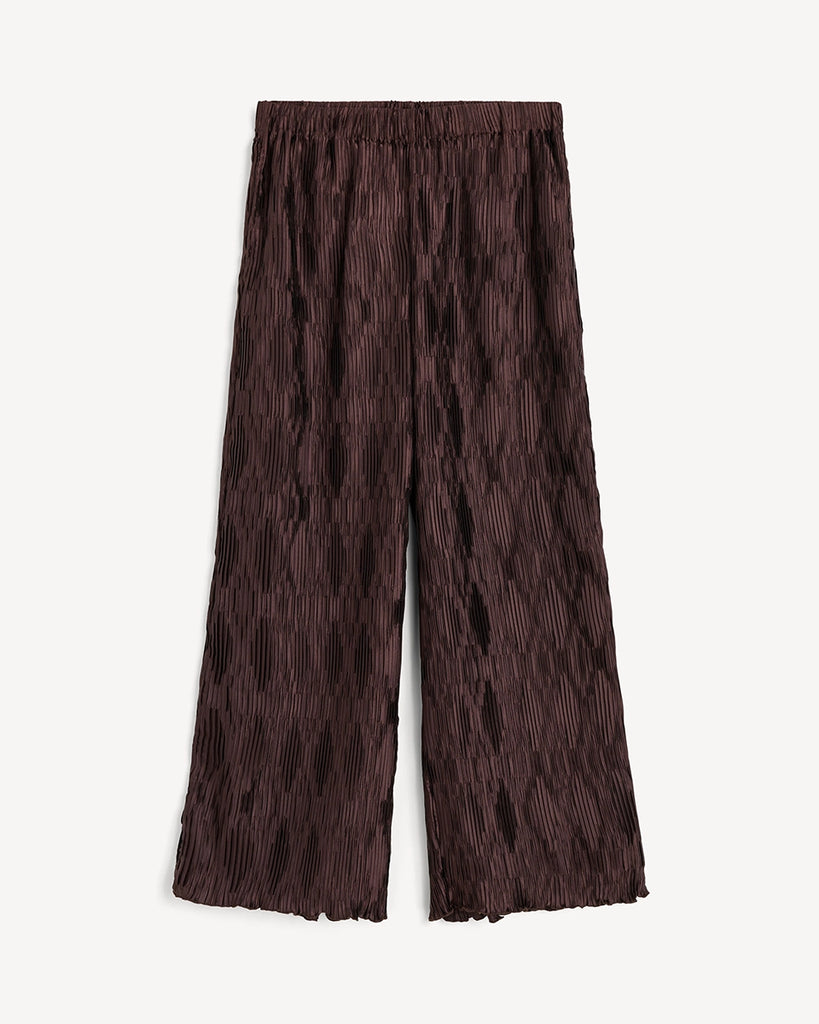 Eleganckie spodnie Letitia By Malene Birger z wysokim stanem, elastyczną talią i prostą, szeroką nogawką. Posiadają dwie, boczne kieszenie. Wykonane z lekkiej, satynowej tkaniny z plisowaną fakturą. Stwórz elegancki total look idealny i połącz spodnie z bluzką Tralluman.