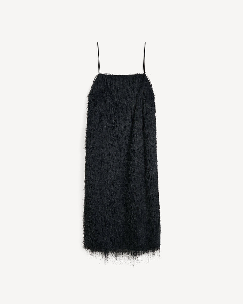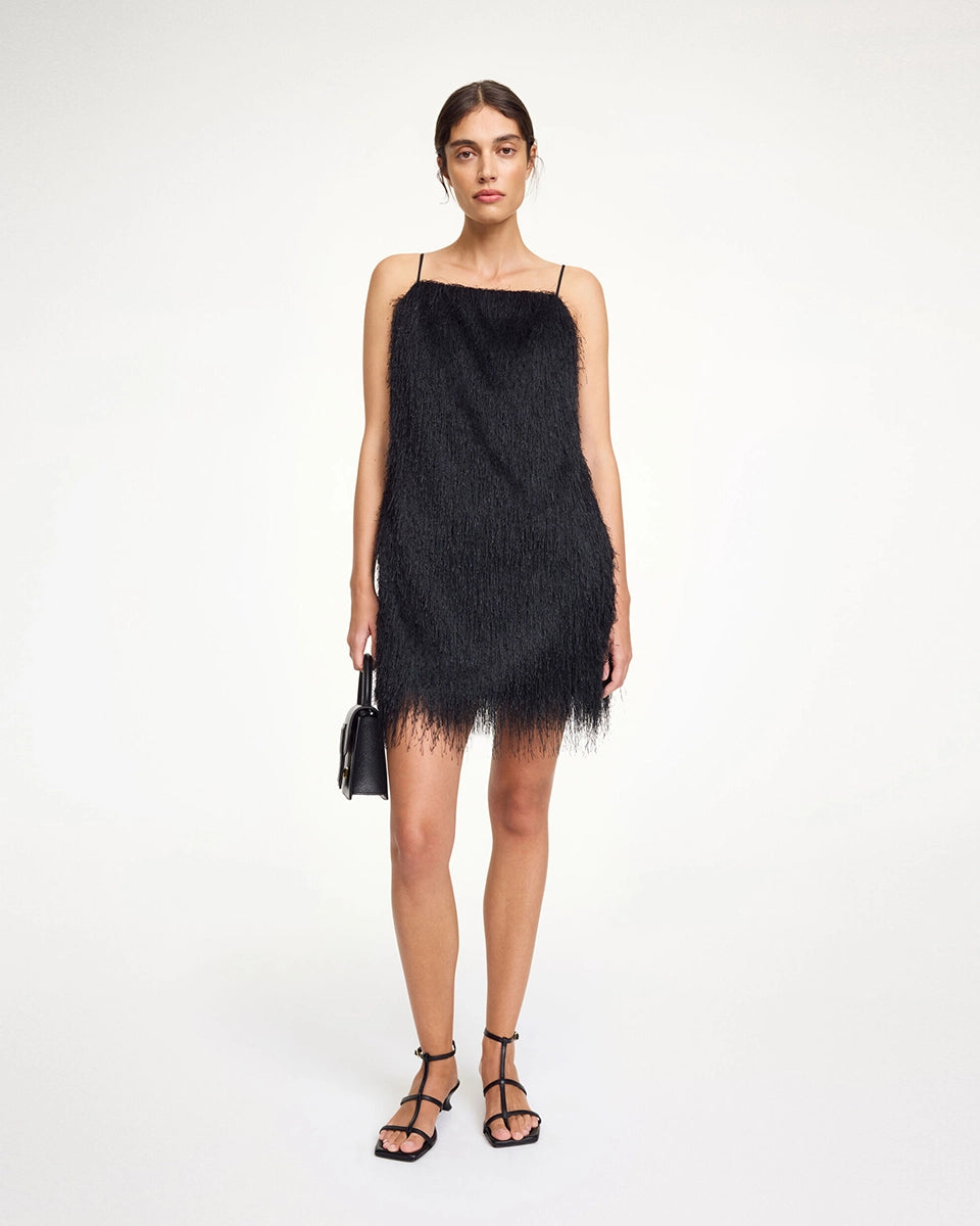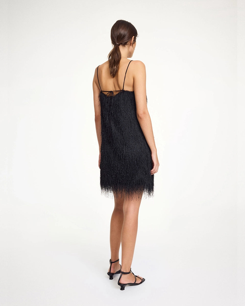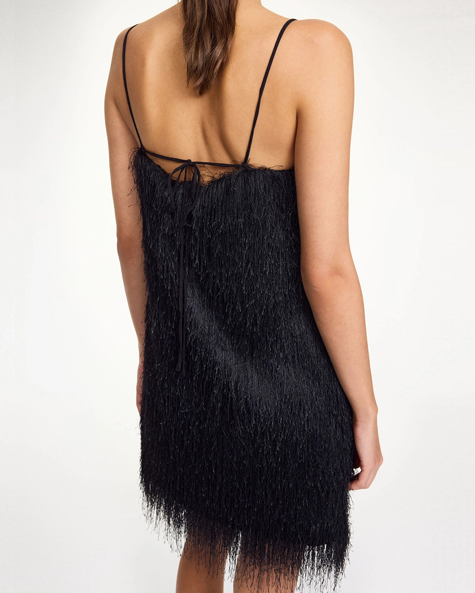Wieczorowa sukienka mini Ledo By Malene Birger na cienkich, regulowanych ramiączkach wiązanych na plecach. Sukienka ma prosty dekolt i luźny fason. Wykonana z tkaniny z długim włosiem, które pięknie reaguje na ruch powietrza i ciała dając oryginalny efekt wizualny.