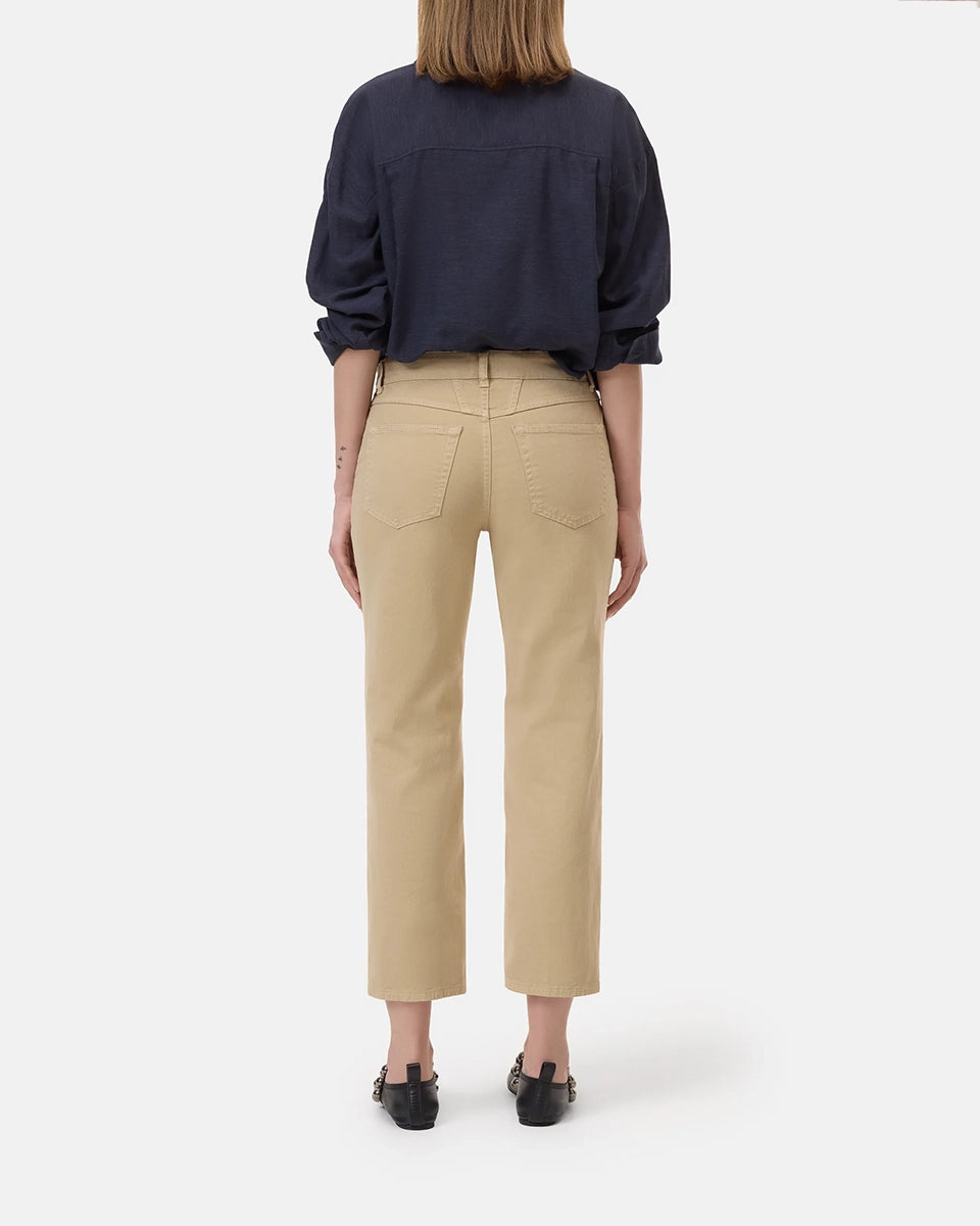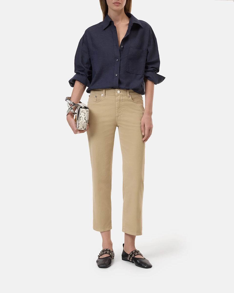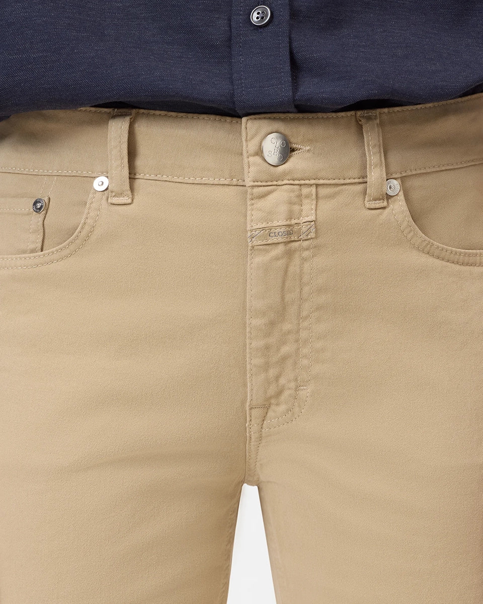 Beżowe, materiałowe spodnie Milo marki CLOSED ze średnim stanem i prostą, luźną i skróconą nogawką. Przylegające w biodrach. Spodnie mają pięć kieszeni. Zapinane na guzik i zamek błyskawiczny. Przy rozporku posiadają niewielką, charakterystyczną dla marki naszywkę z logo CLOSED. Wykonane z miękkiej, bawełnianej tkaniny ze streczem, co sprawia, że są niesamowicie komfortowe w noszeniu. Idealne do płaskich klapek i mokasynów.