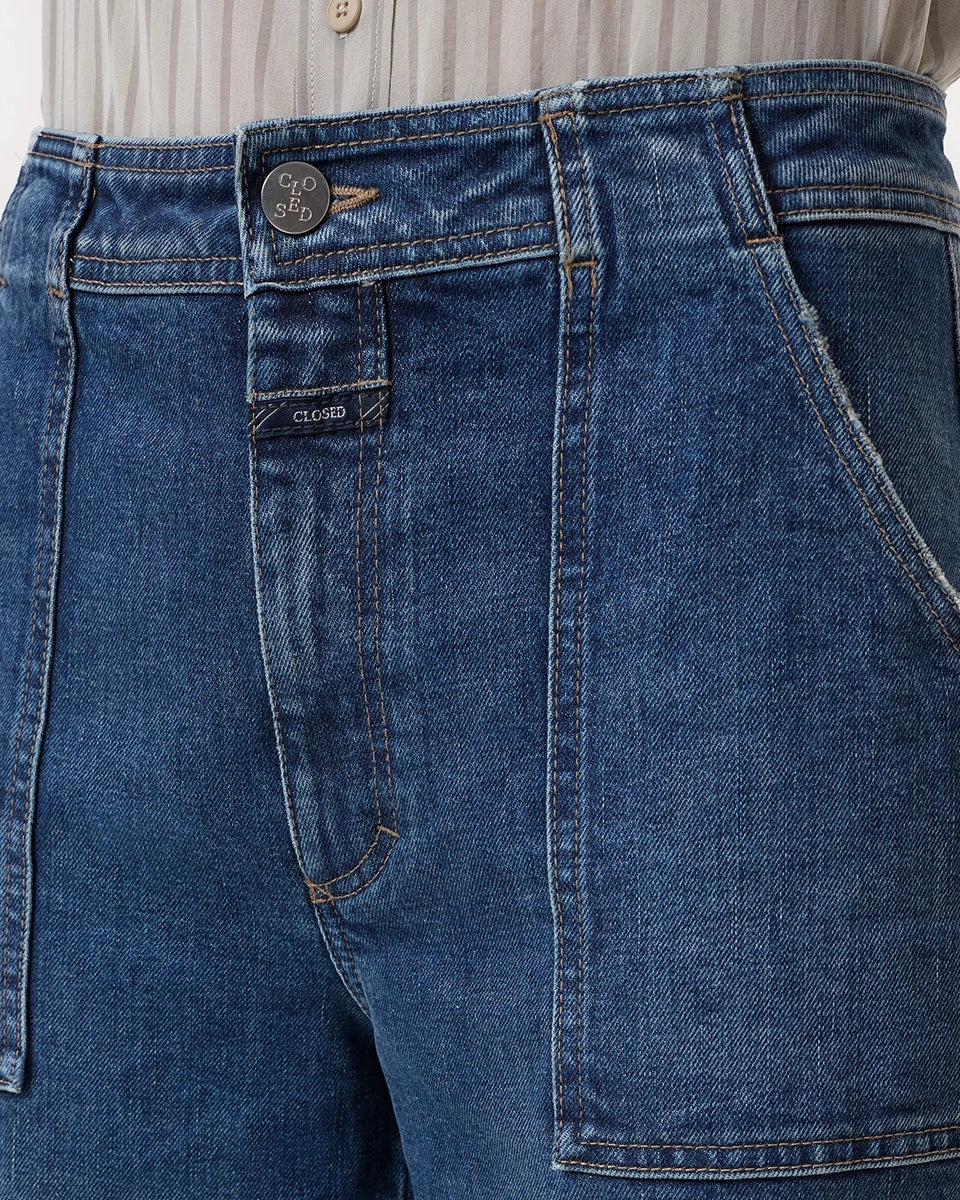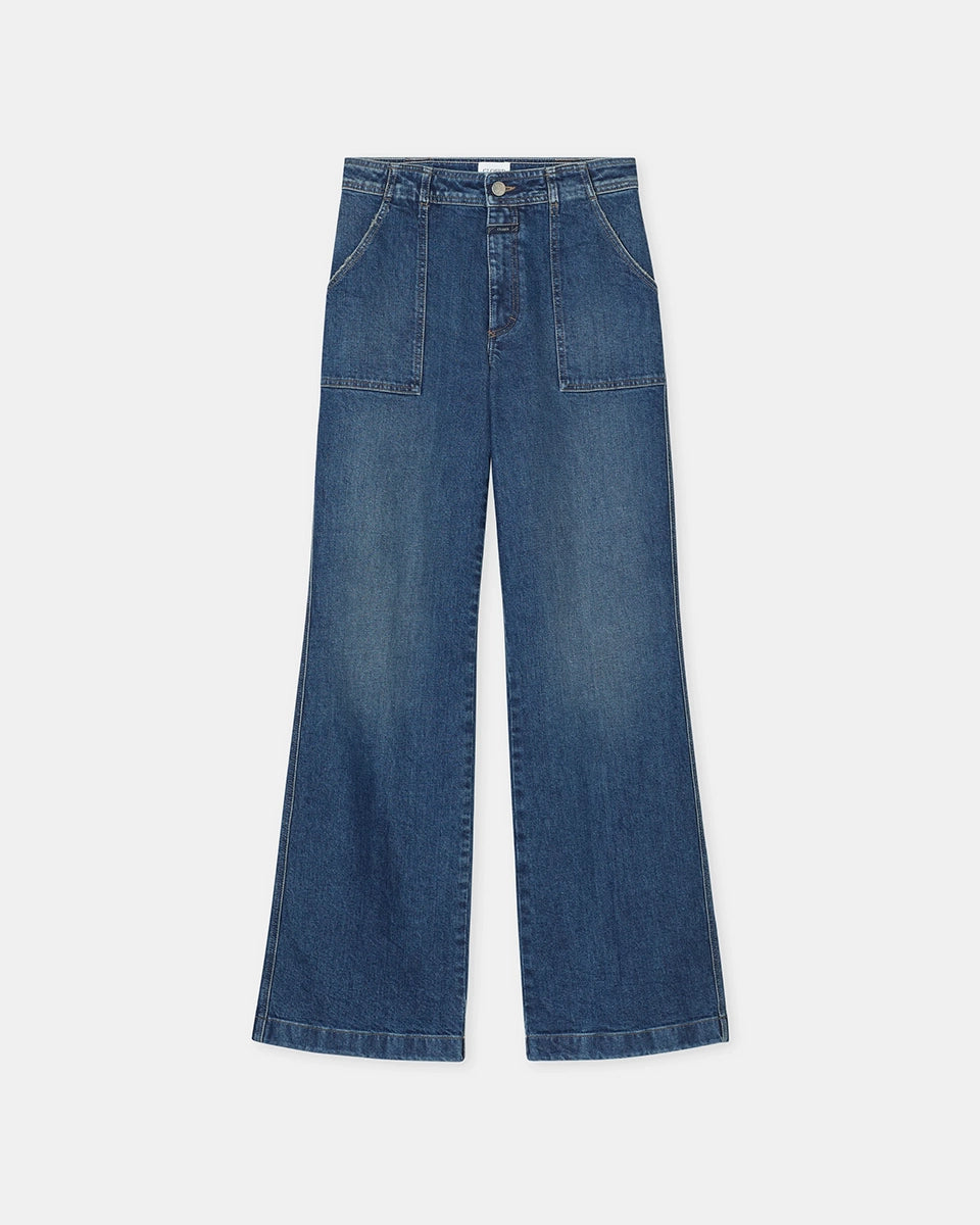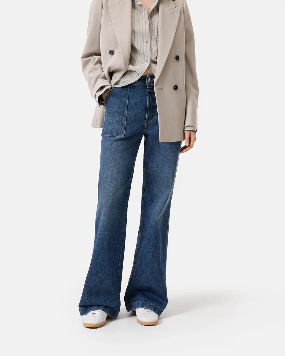 Granatowe, lekko wycierane jeansy Aria marki CLOSED z wysokim stanem i rozszerzaną u dołu nogawką. Przylegające na biodrach i udach. Spodnie mają dwie przednie kieszenie inspirowane roboczym stylem i dwie, tylne. Wykonane ze sztywnego i lekko elastycznego jeansu z biodegradowalnym streczem (ROICA™ V550), co sprawia, że są wyjątkowo wygodne. Uszyte we Włoszech z najlepszej jakości, włoskiego denimu.