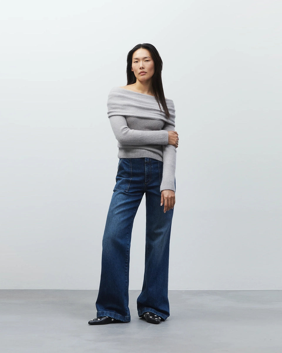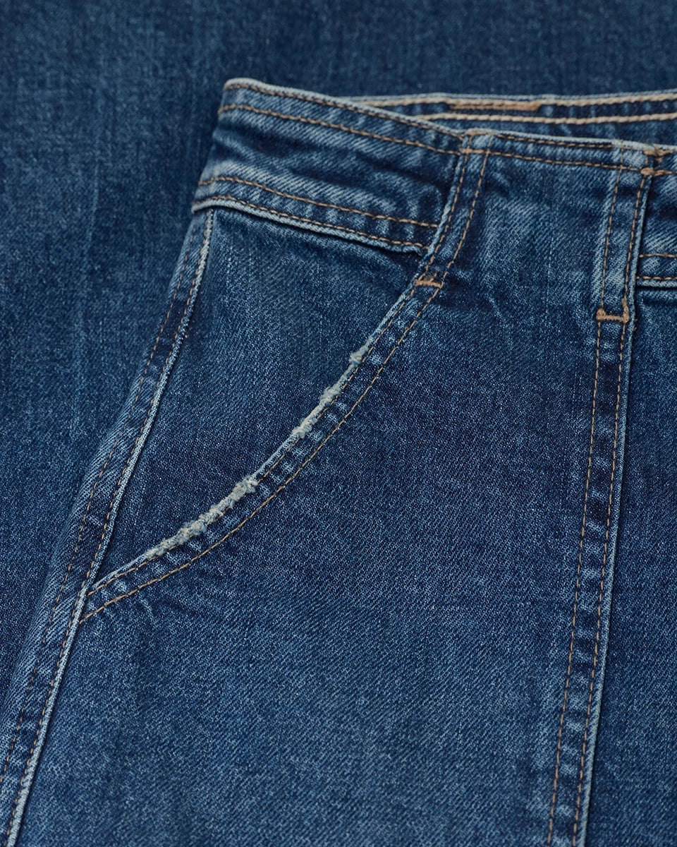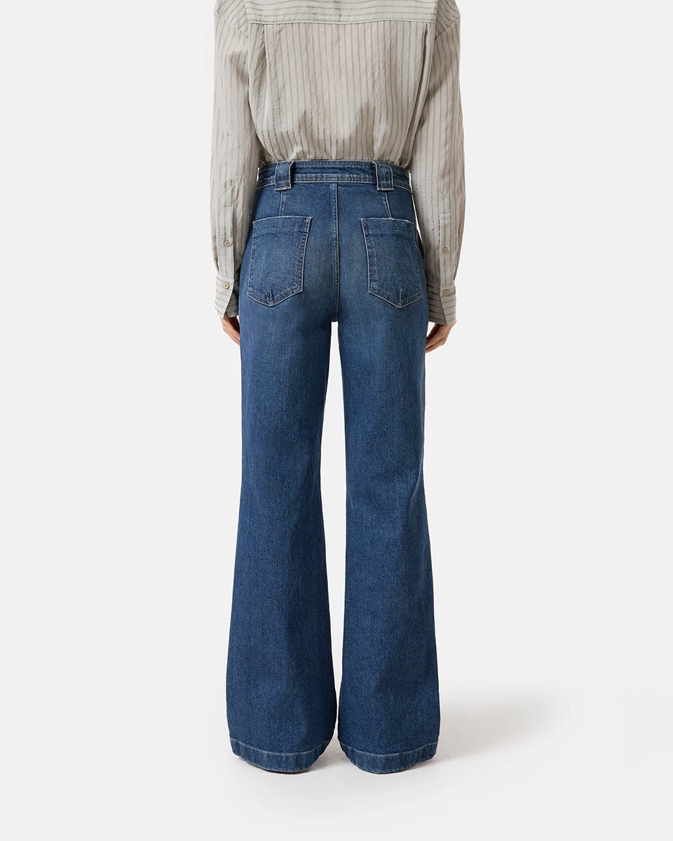 Granatowe, lekko wycierane jeansy Aria marki CLOSED z wysokim stanem i rozszerzaną u dołu nogawką. Przylegające na biodrach i udach. Spodnie mają dwie przednie kieszenie inspirowane roboczym stylem i dwie, tylne. Wykonane ze sztywnego i lekko elastycznego jeansu z biodegradowalnym streczem (ROICA™ V550), co sprawia, że są wyjątkowo wygodne. Uszyte we Włoszech z najlepszej jakości, włoskiego denimu.