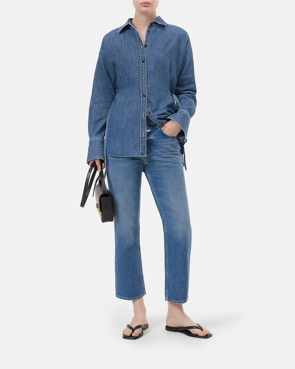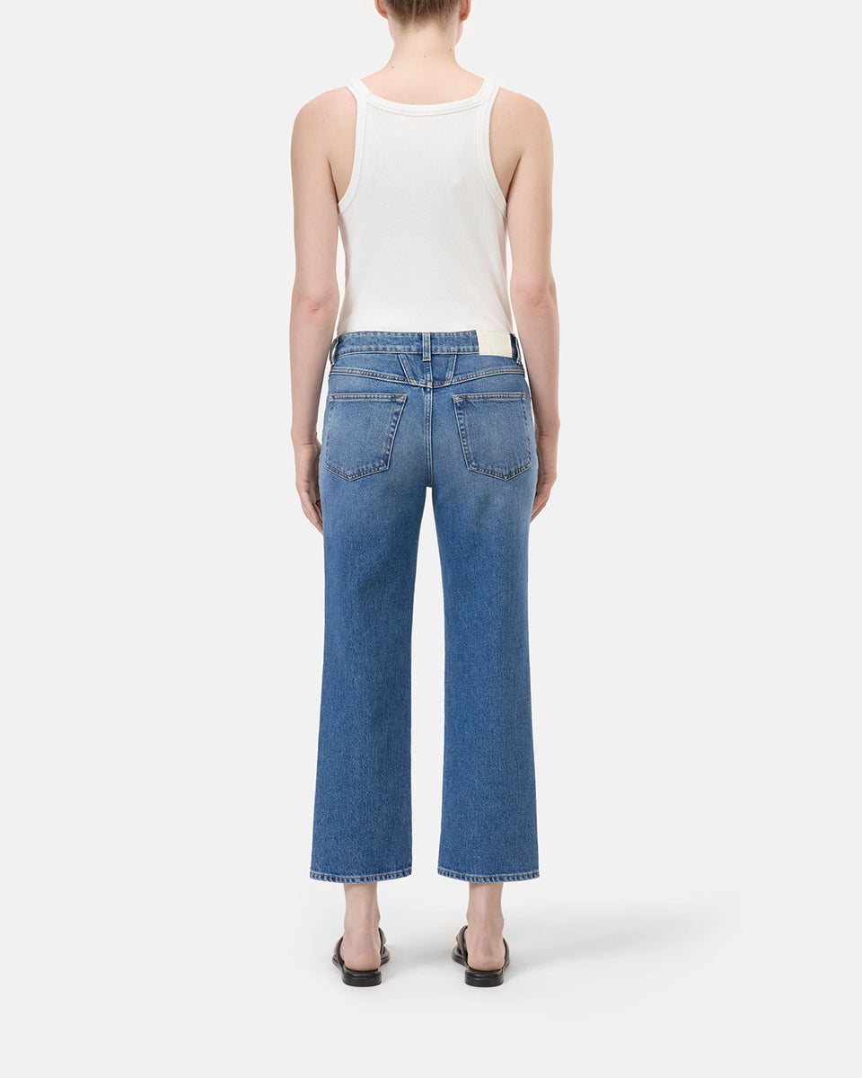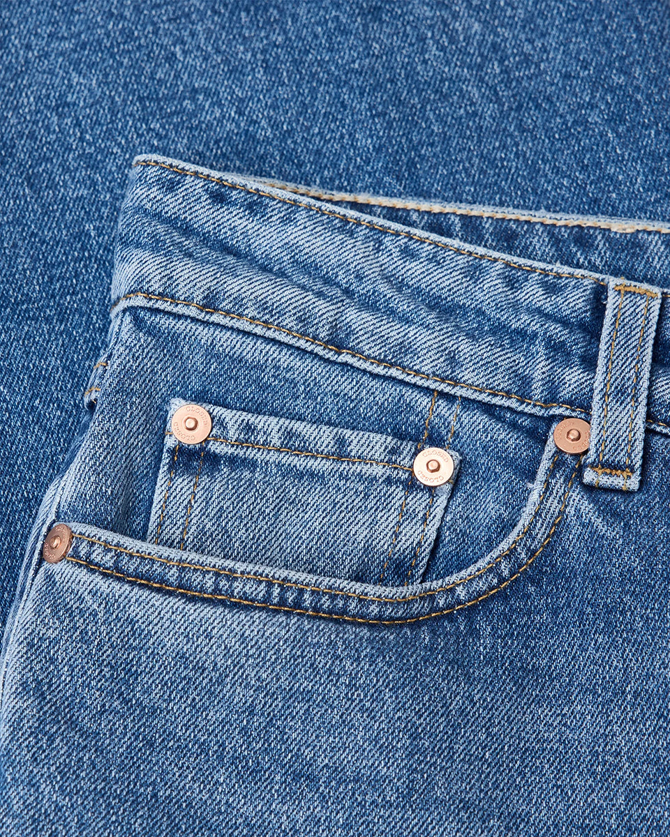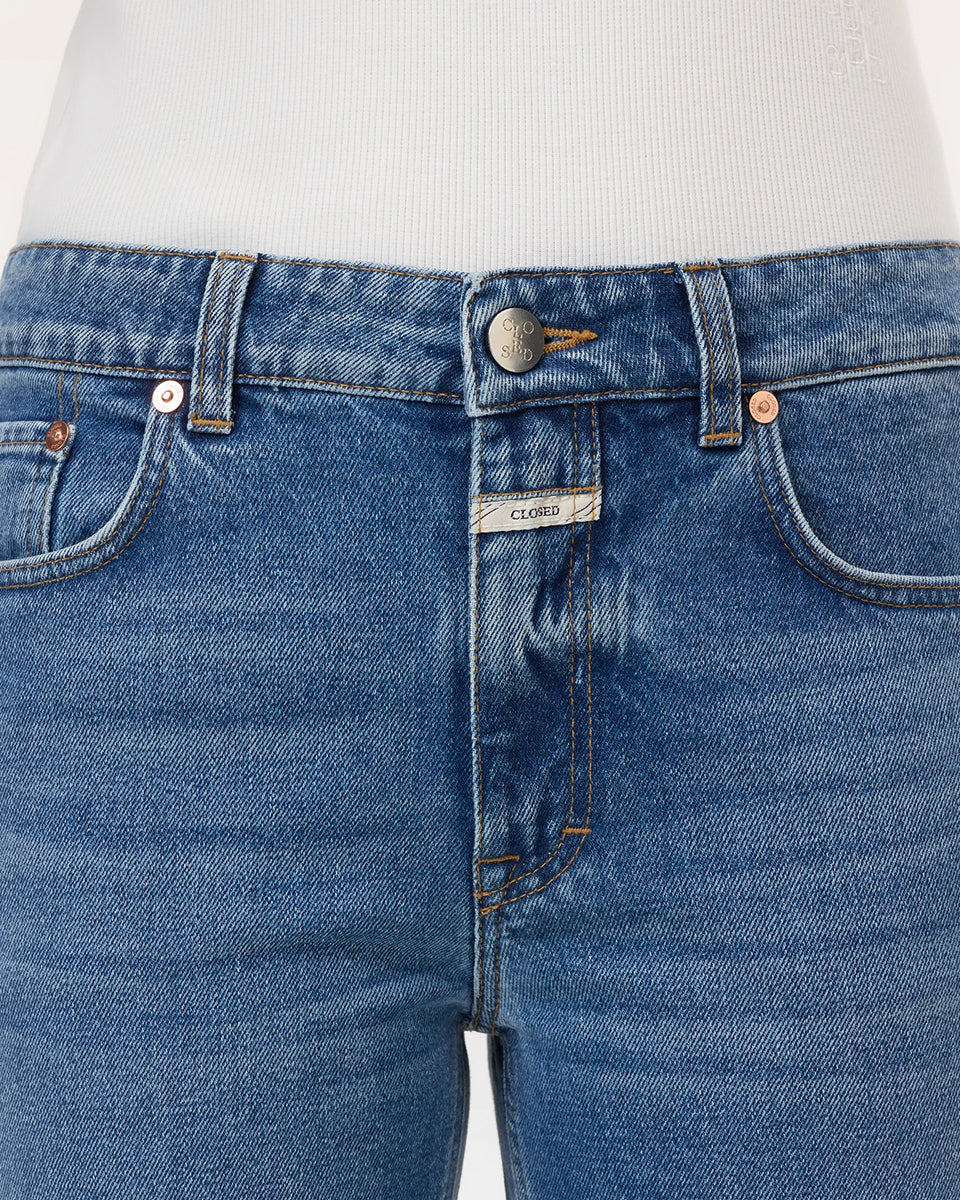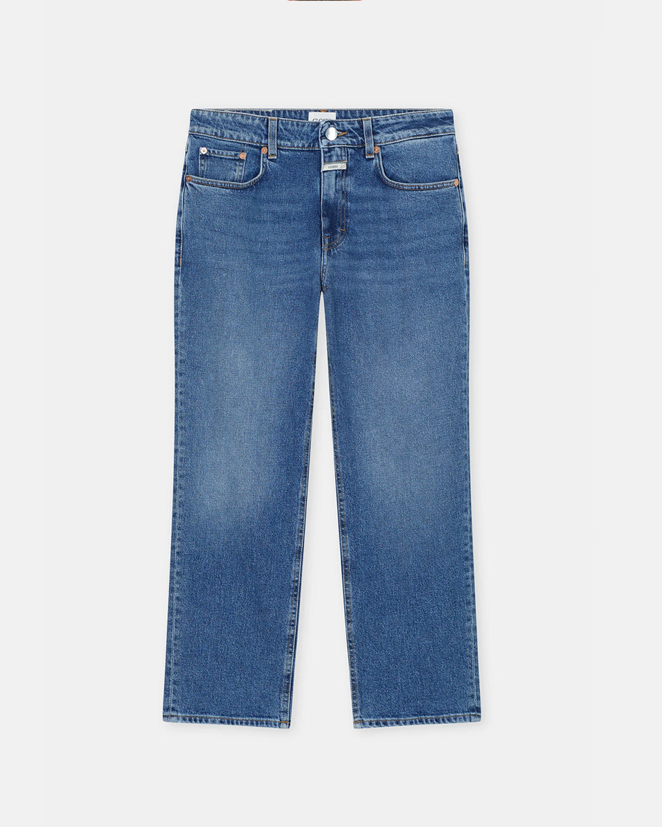 Niebieskie, delikatnie wytarte jeansy Milo marki CLOSED ze średnim stanem i prostą, luźną i skróconą nogawką. Przylegające w biodrach. Spodnie mają pięć kieszeni. Zapinane na guzik i zamek błyskawiczny. Przy rozporku posiadają niewielką, charakterystyczną dla marki naszywkę z logo CLOSED. Wykonane z miękkiego, włoskiego denimu ze streczem, co sprawia, że są niesamowicie komfortowe w noszeniu. Idealne do płaskich klapek i mokasynów.
