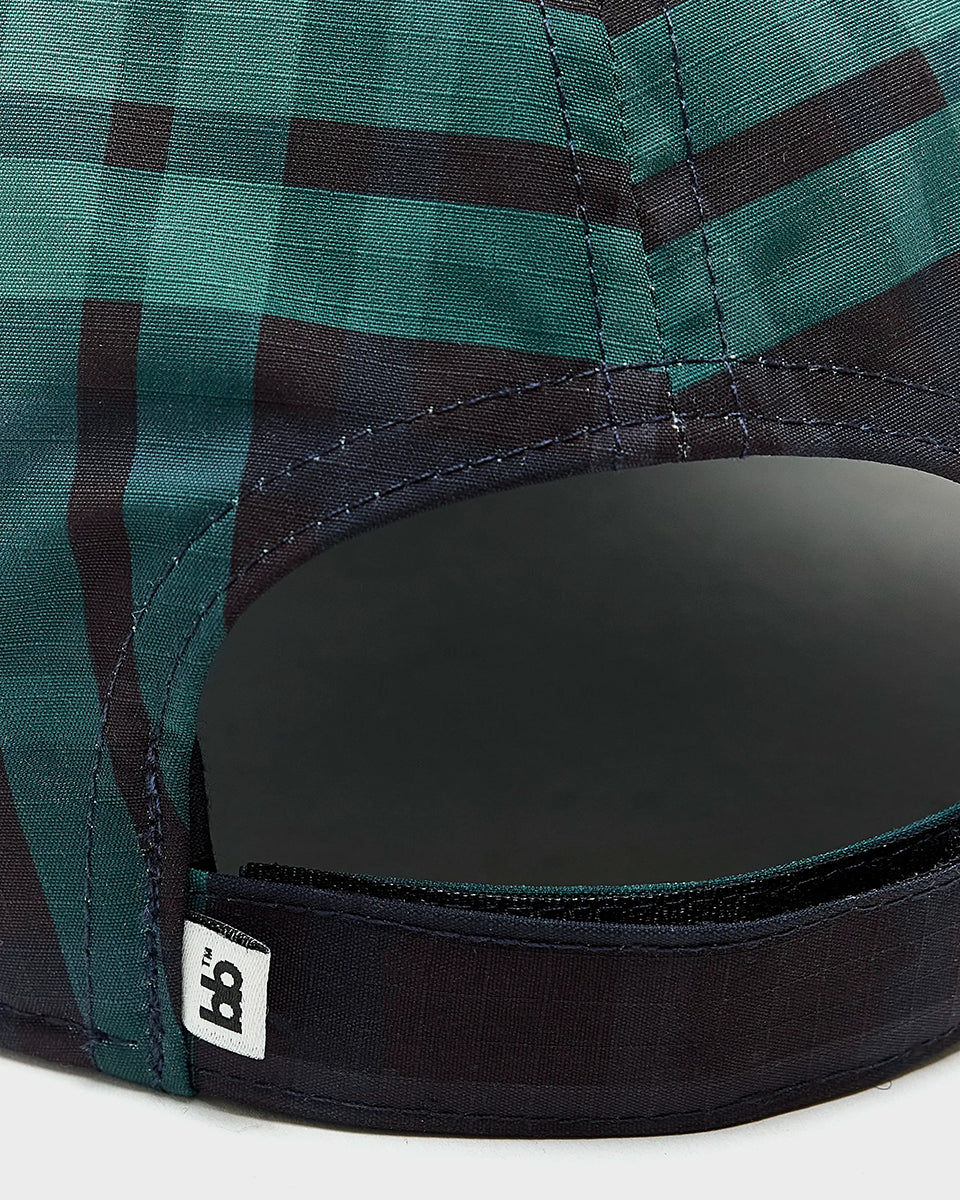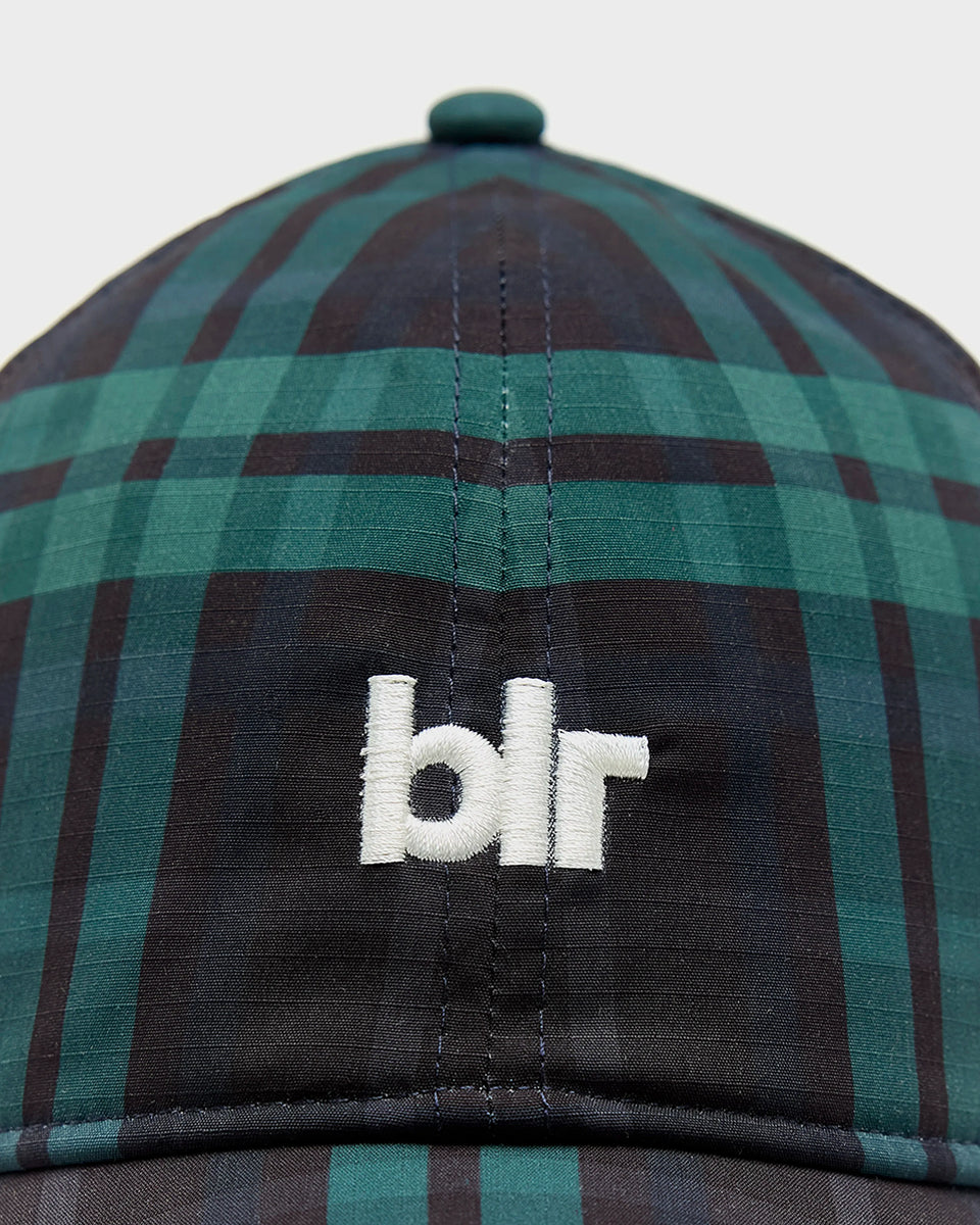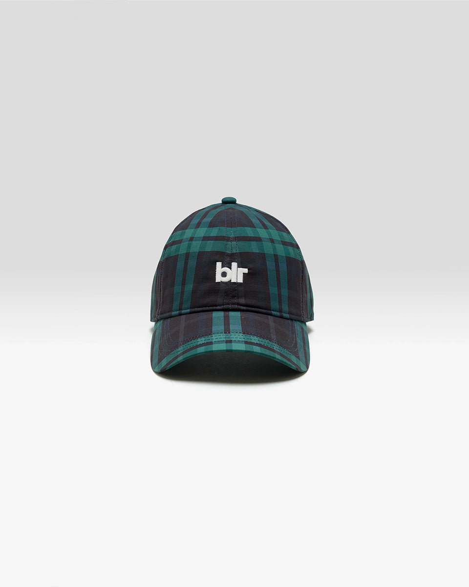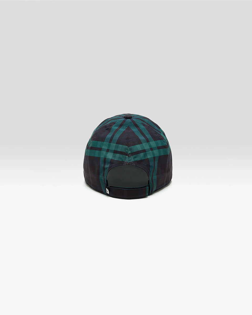 Klasyczna czapka bejsbolówka Delcro Plaid marki BELLEROSE w czarno-granatowo-zieloną kratę, z haftowanym logo marki i regulowanym paskiem na rzep.