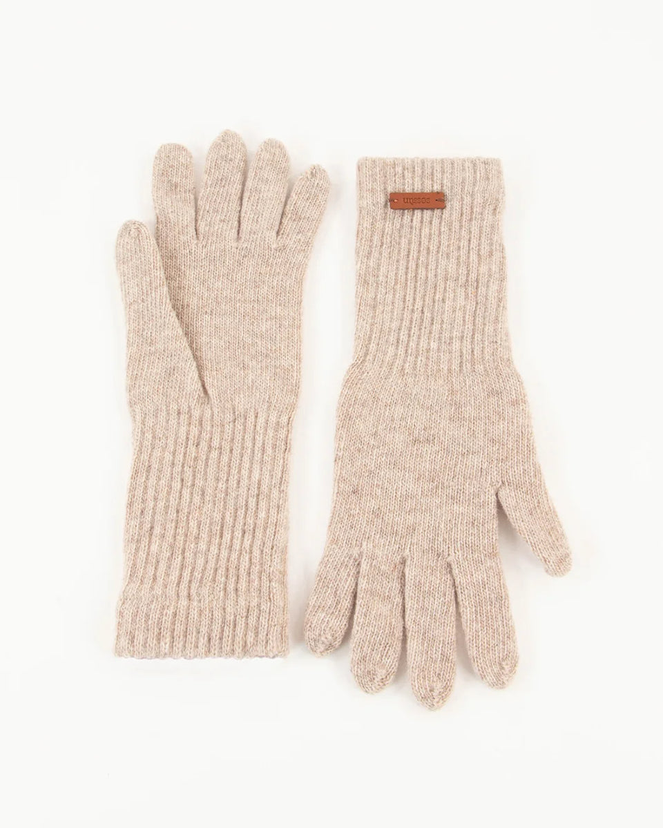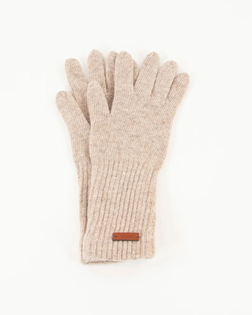 Beżowe, ciepłe rękawiczki Niels Sand marki Sessun. U dołu mają naszywkę z logo marki. Wykonane z wełny pochodzącej z recyklingu.