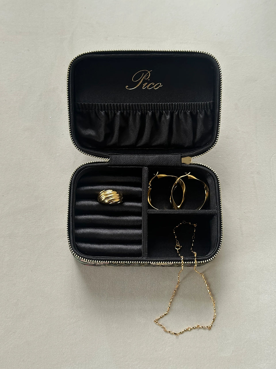 Kuferek do przechowywania biżuterii Pico Copenhagen z przegródkami wewnątrz. Obszyty tkaniną imitującą jeans. Zapinany za pomocą zamka błyskawicznego. To idealny pomysł na prezent.