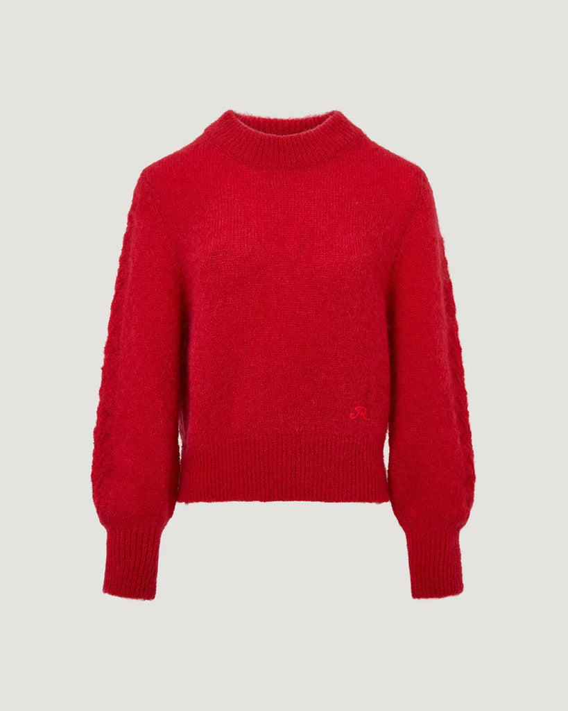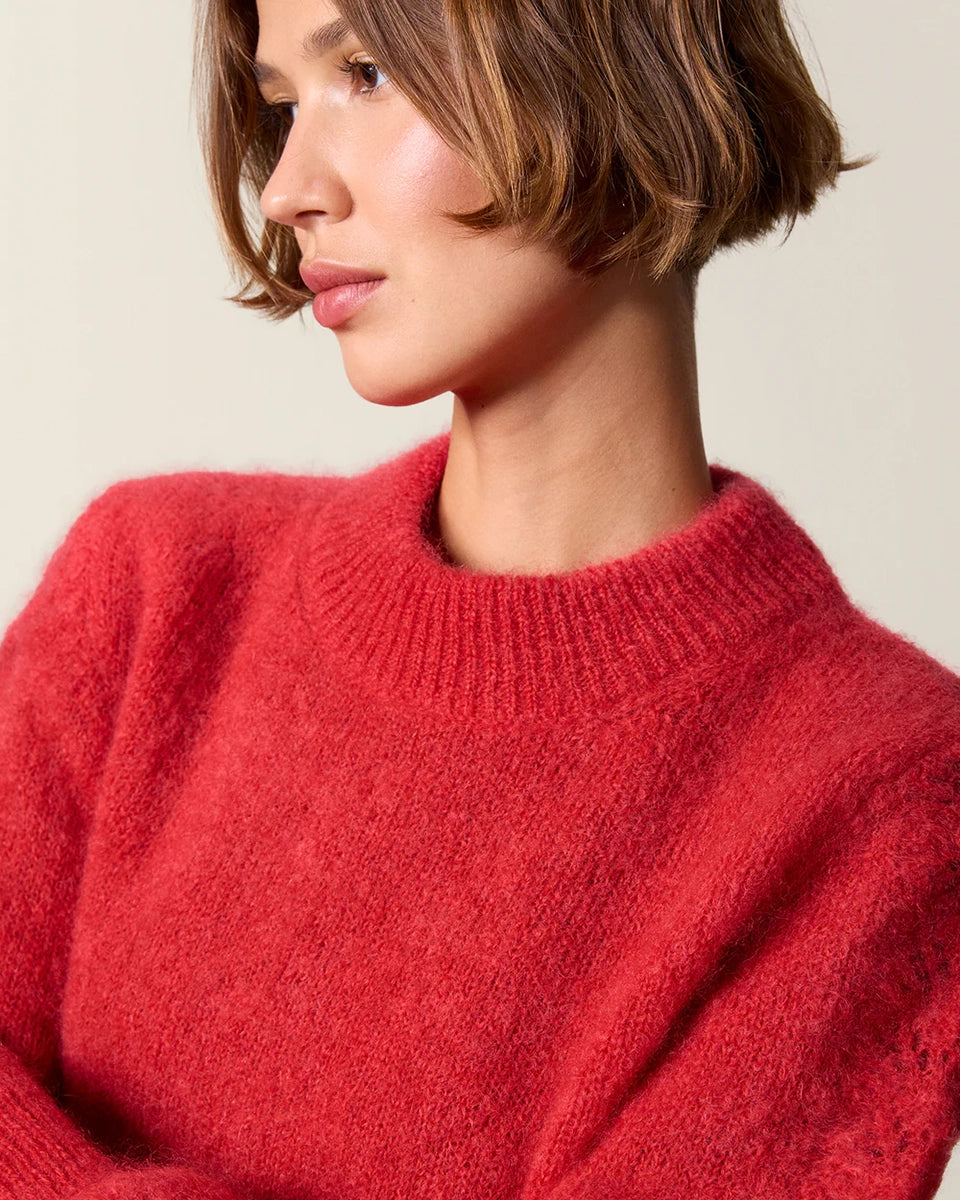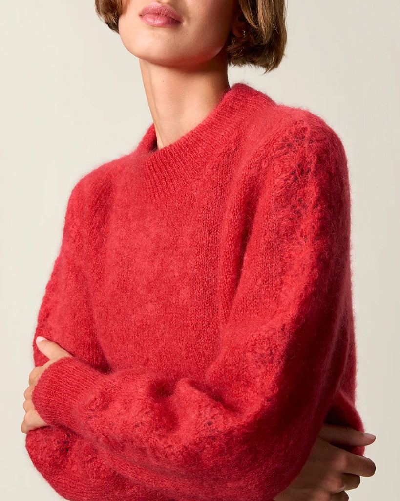 Ciepły, moherowy sweter Mara Rouje z okrągłym dekoltem i luźnymi, długimi rękawami z delikatnym, ażurowym wzorem na bokach. Sweter ma luźny fason i jest wykończony ściągaczami. Idealny do jeansów i spódnicy midi.