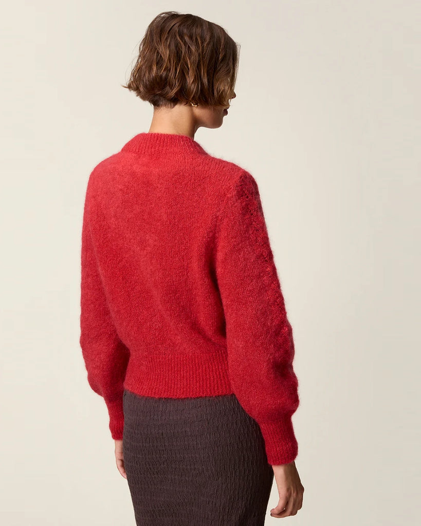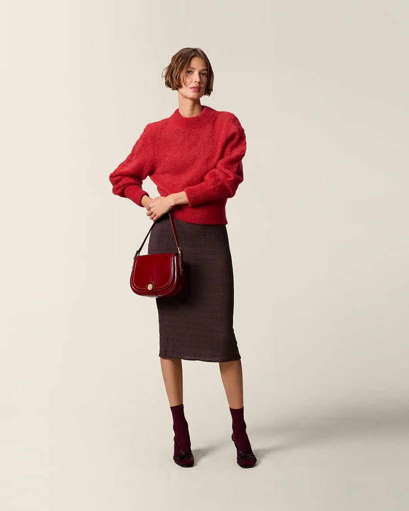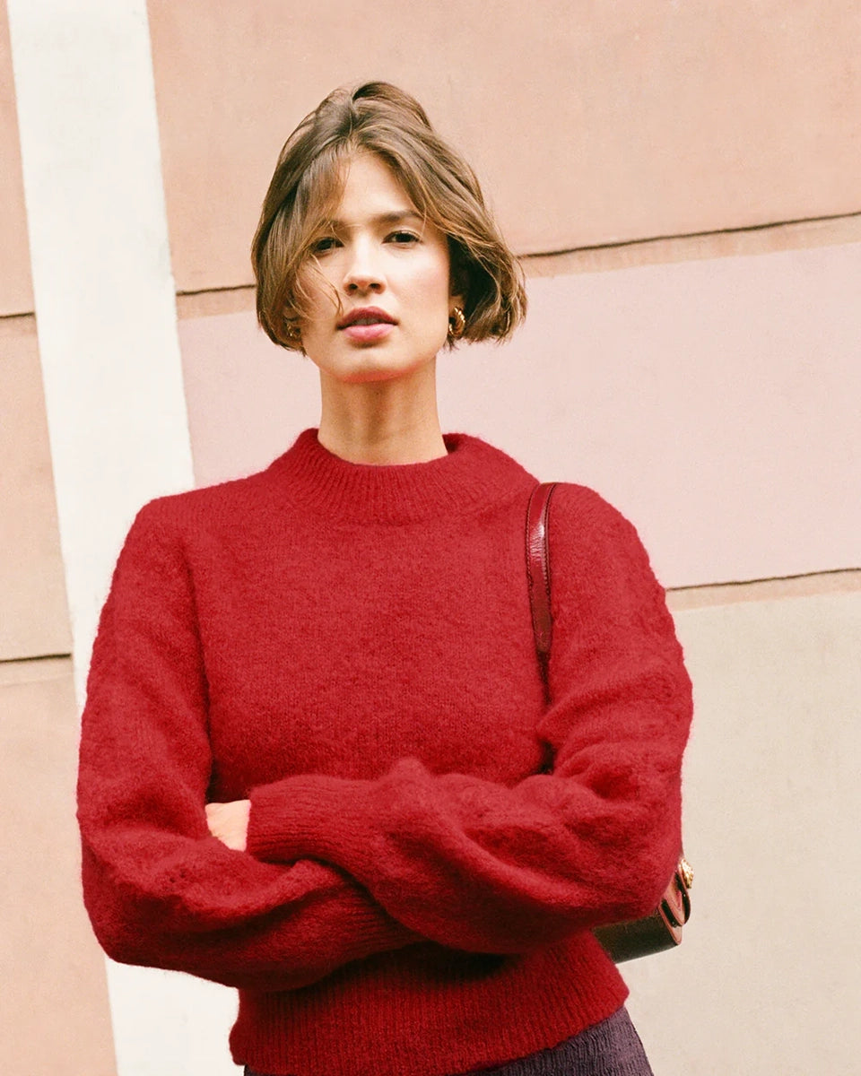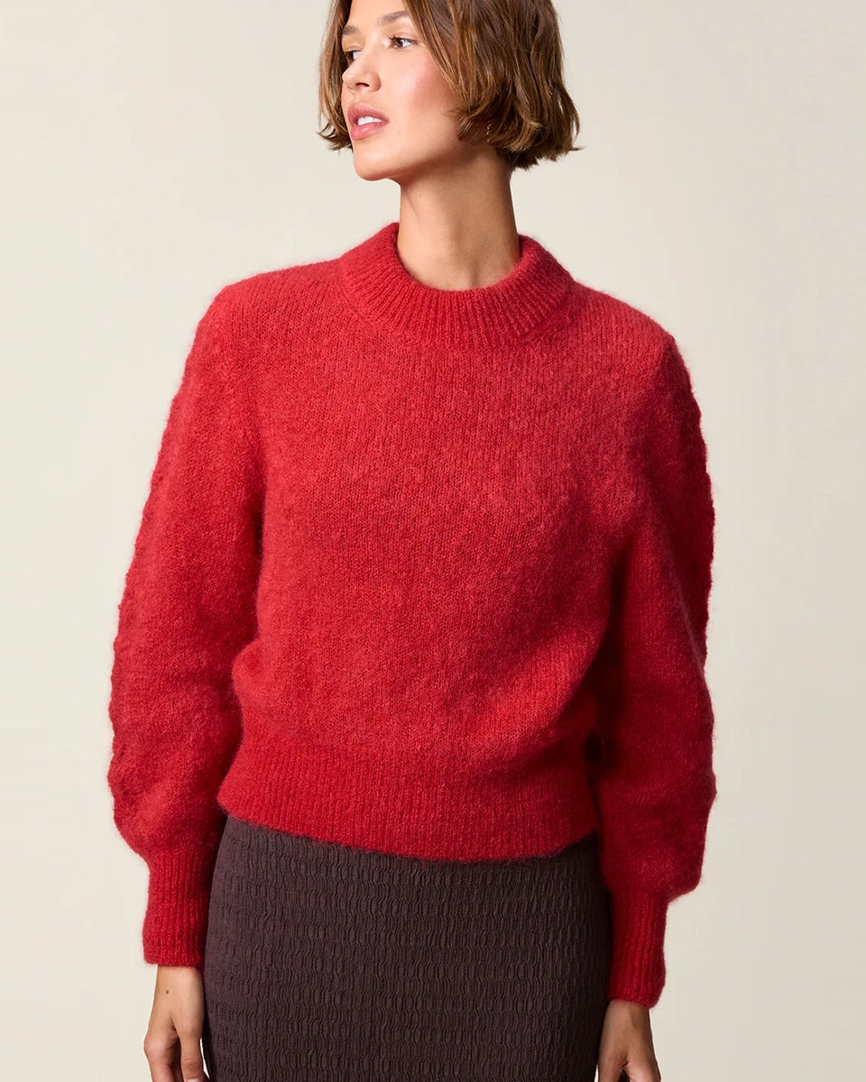 Ciepły, moherowy sweter Mara Rouje z okrągłym dekoltem i luźnymi, długimi rękawami z delikatnym, ażurowym wzorem na bokach. Sweter ma luźny fason i jest wykończony ściągaczami. Idealny do jeansów i spódnicy midi.