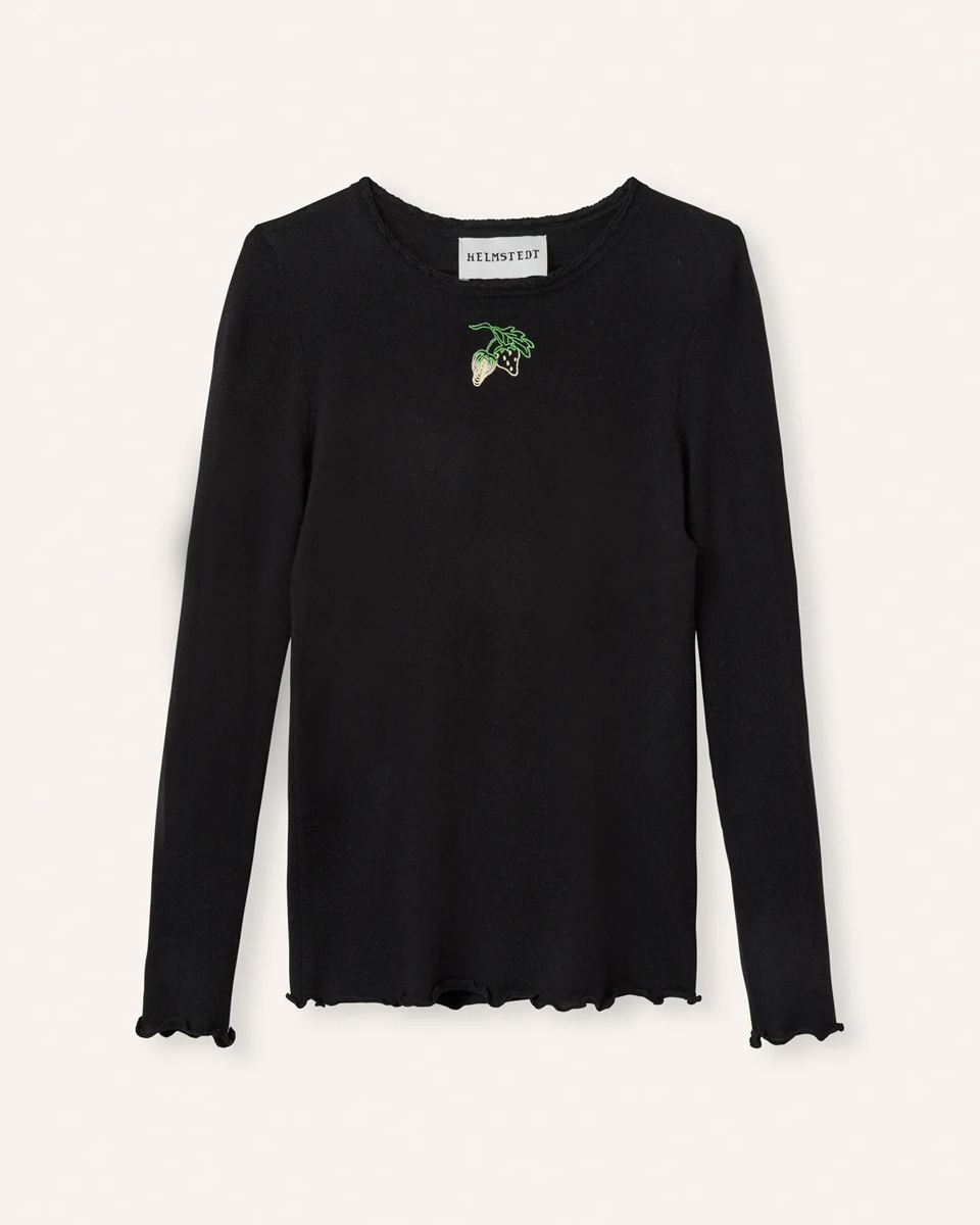 Koszulka z długim, zwężanym rękawem Andrea Black Beauty Helmstedt w czarnym kolorze z okrągłym dekoltem. Z przodu posiada charakterystyczny dla marki haft truskawkowy. Prosty, a zarazem elegancki design sprawia, że koszulka będzie idealna na codzień do jeansów, ale także na wiele innych okazji.