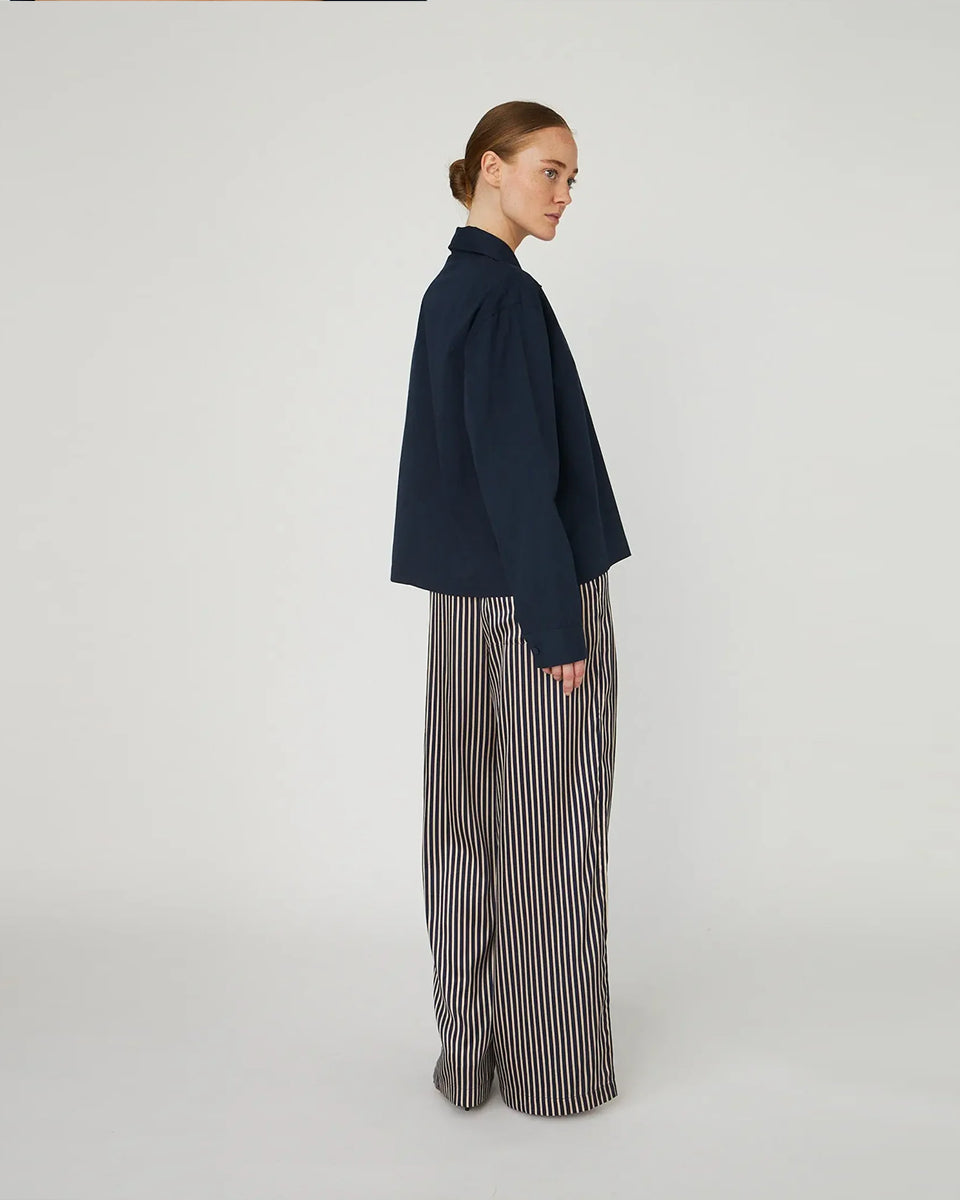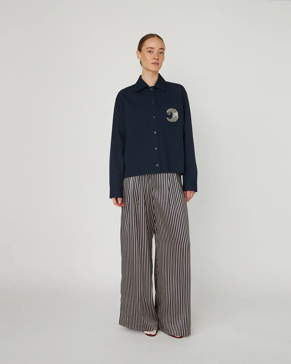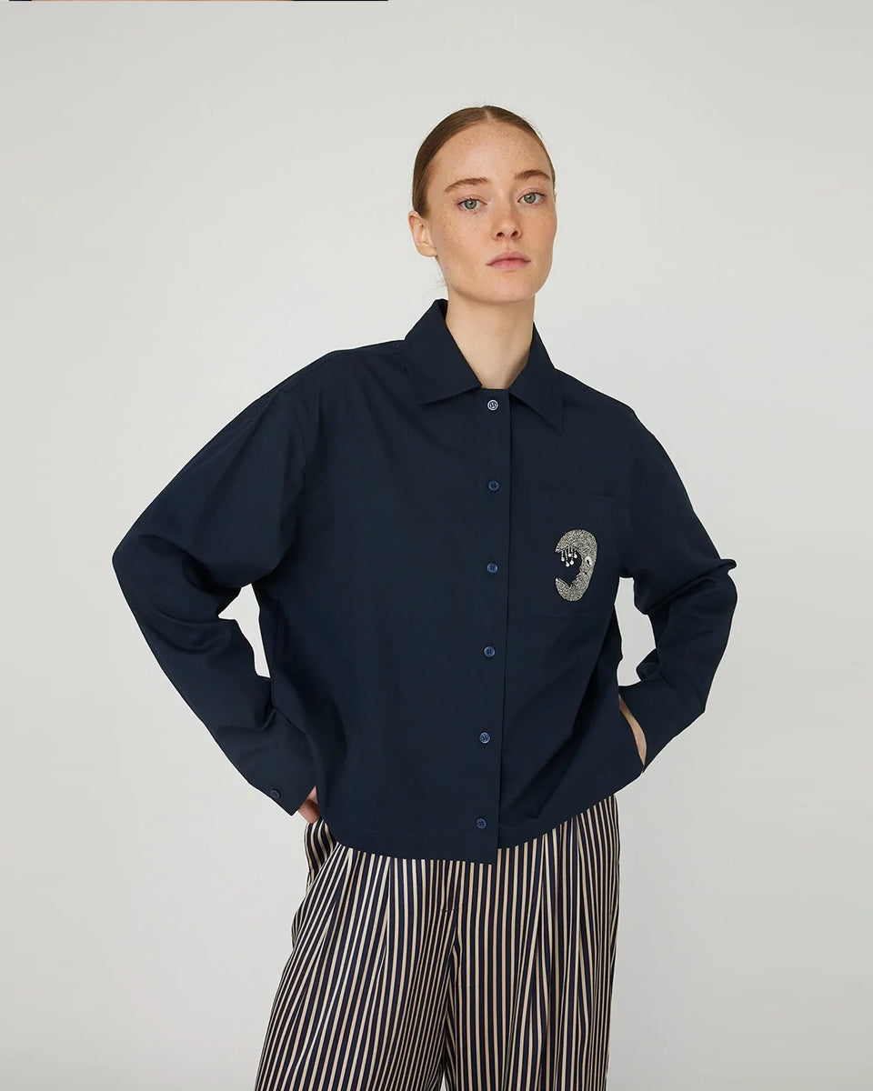 Luźna, granatowa koszula Embellished Moon Navy marki STELLA NOVA z długimi rękawami i mankietem. Ma klasyczny kołnierzyk i zapięcie na guziki z przodu. Na lewej piersi posiada kieszeń z wyhaftowanym księżycem. Wykonana z bawełny organicznej.