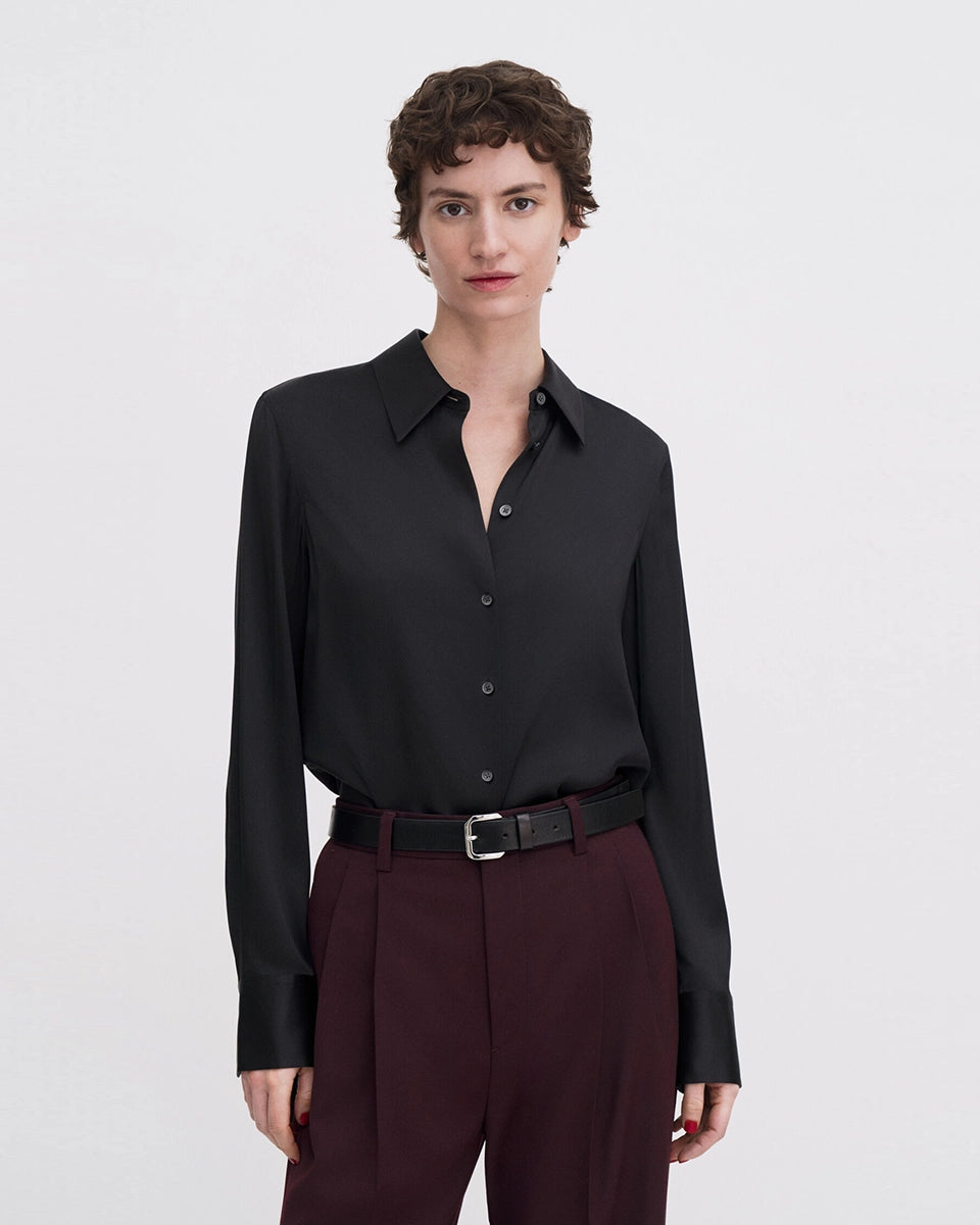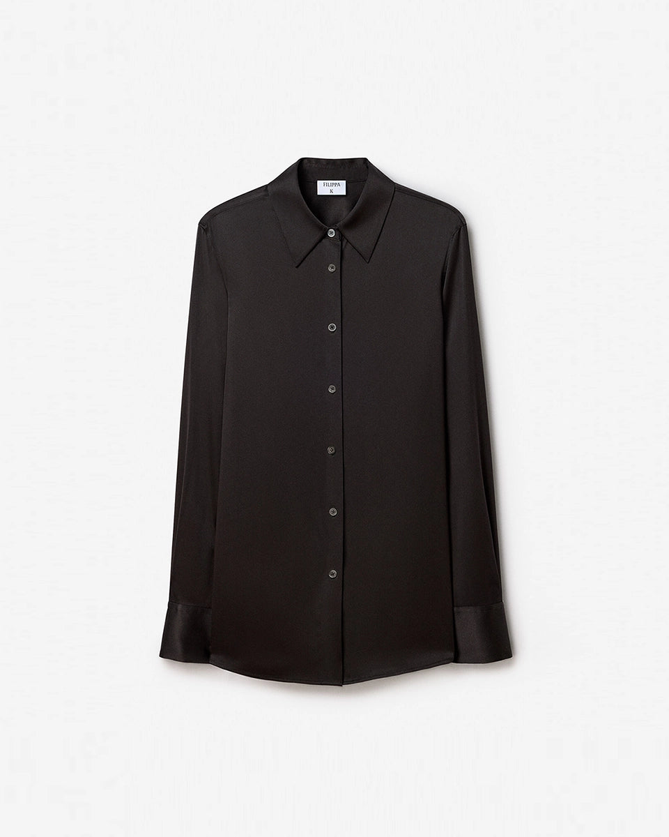 Klasyczna, minimalistyczna koszula Silk FILIPPA K o luźnym fasonie i prostym kroju. Posiada kołnierzyk i jest zapinana na guziki. Wykonana z luksusowego, lekko elastycznego jedwabiu. Idealna do pracy i na wyjątkowe, eleganckie okazje. Połącz ją z garniturowymi spodniami i mokasynami lub lejącą spódnicą i butami na obcasie. To ponadczasowy klasyk, który nigdy nie wyjdzie z mody.