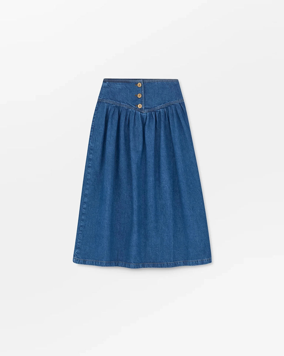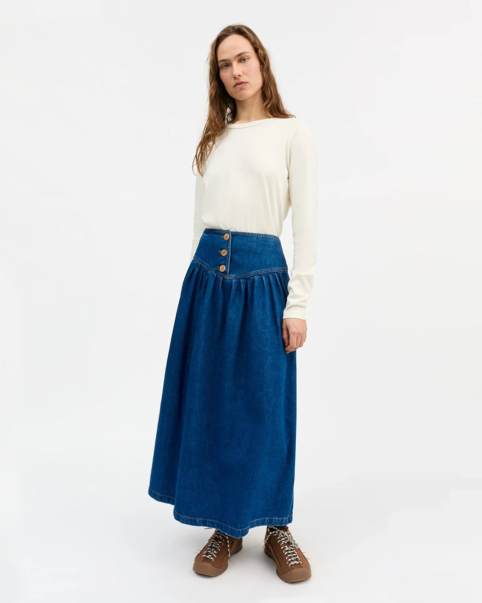 Romantyczna, długa, jeansowa spódnica Dolly SKALL z wysokim stanem. Odcięta nisko w talii, marszczona i rozkloszowana. W pasie zapinana na trzy guziki. Spódnica ma długość do kostek. Wykonana z miękkiego denimu z bawełny organicznej.