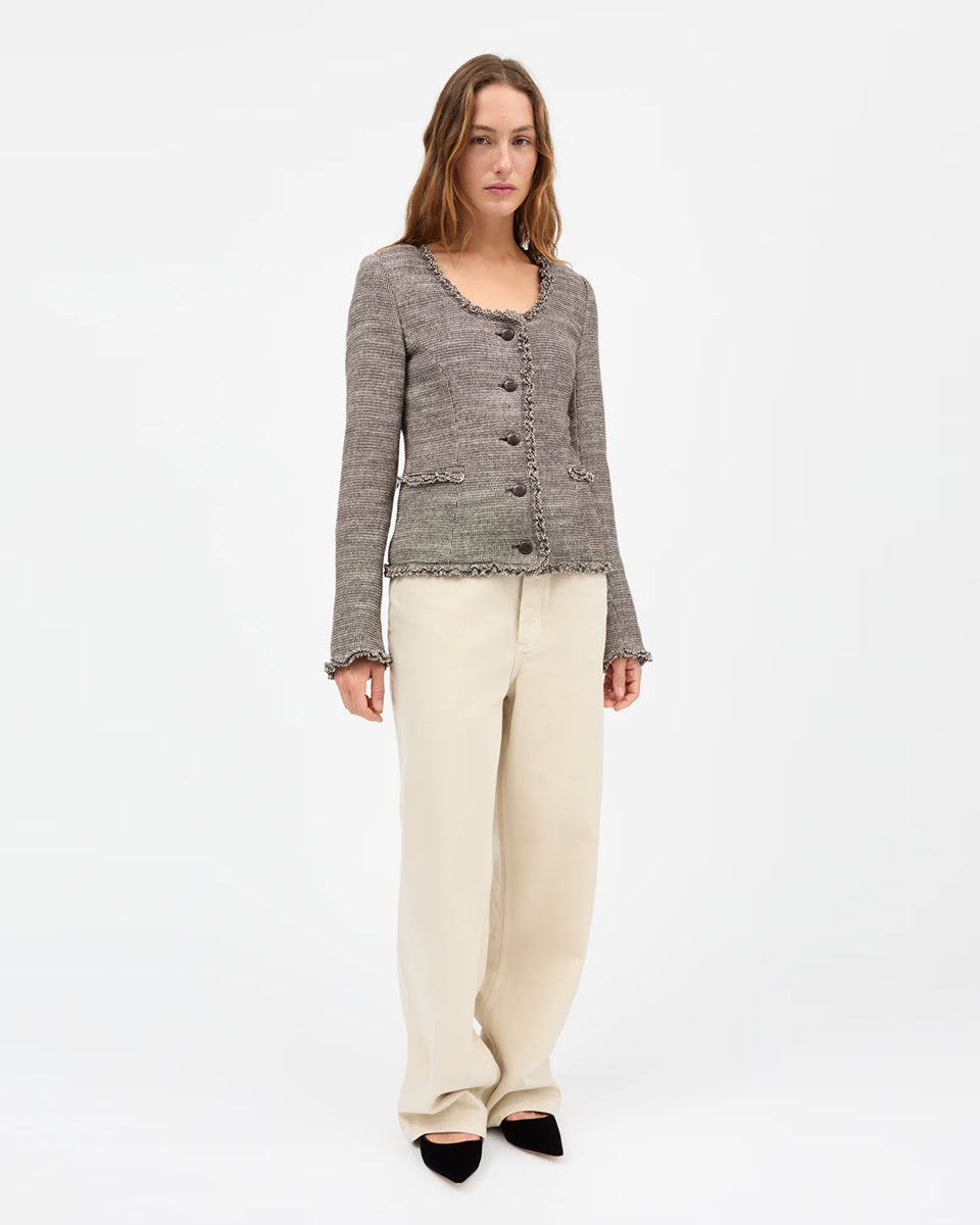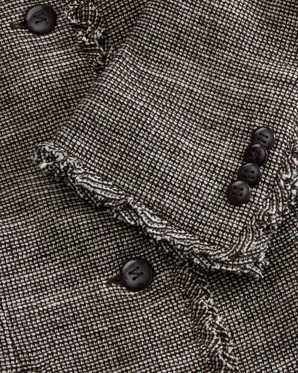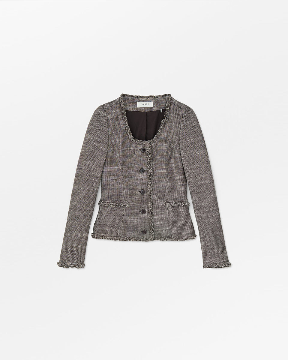 Dopasowana, jednorzędowa marynarka Rosa Brown marki SKALL z okrągłym dekoltem i długimi rękawami. Ma surowe wykończenie przy szyi, u dołu i przy mankietach. Zapinana na pięć guzików z przodu. Posiada dwie kieszenie wpuszczane również z surowym wykończeniem. Wykonana w 100% z wełny. Kształt dopasowany jest do sylwetki.