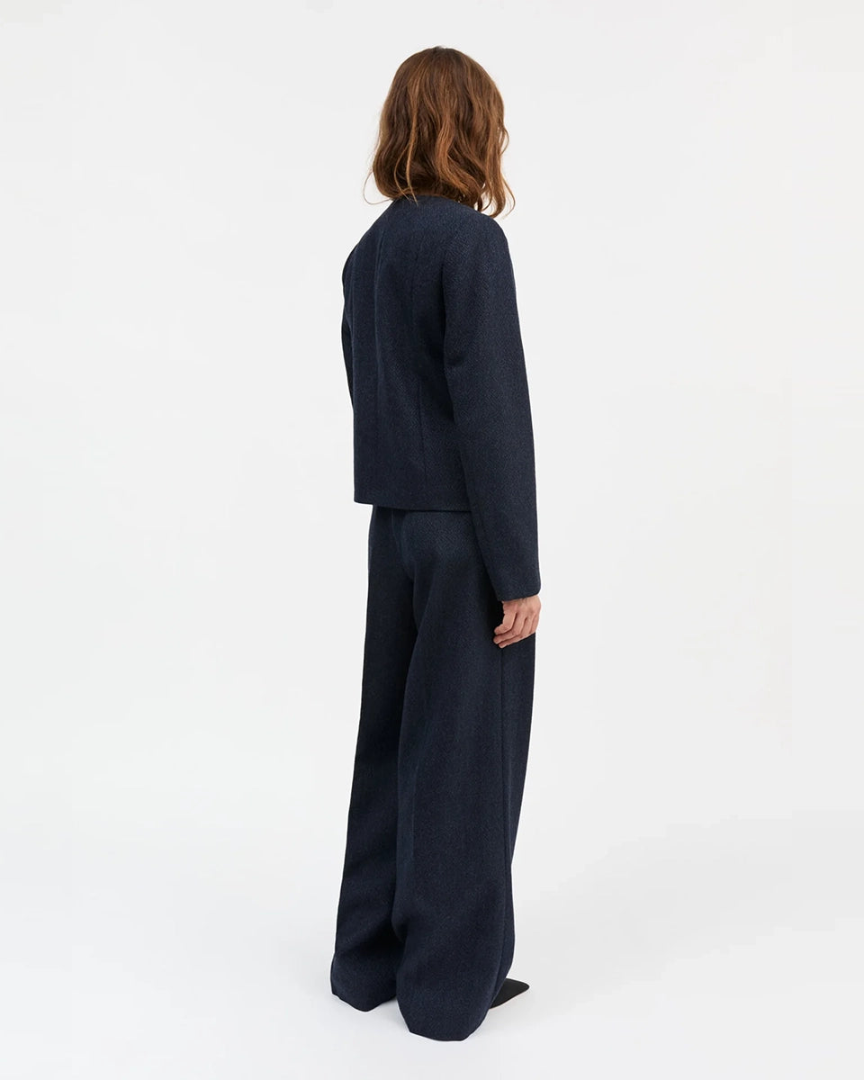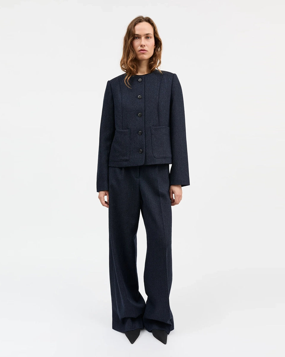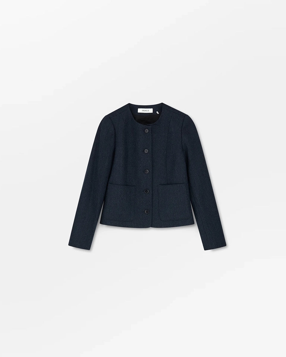 Klasyczna, krótka, wełniana marynarka Mona SKALL z okrągłym dekoltem. Zapinana na guziki. Z przodu posiada dwie, prostokątne kieszenie.