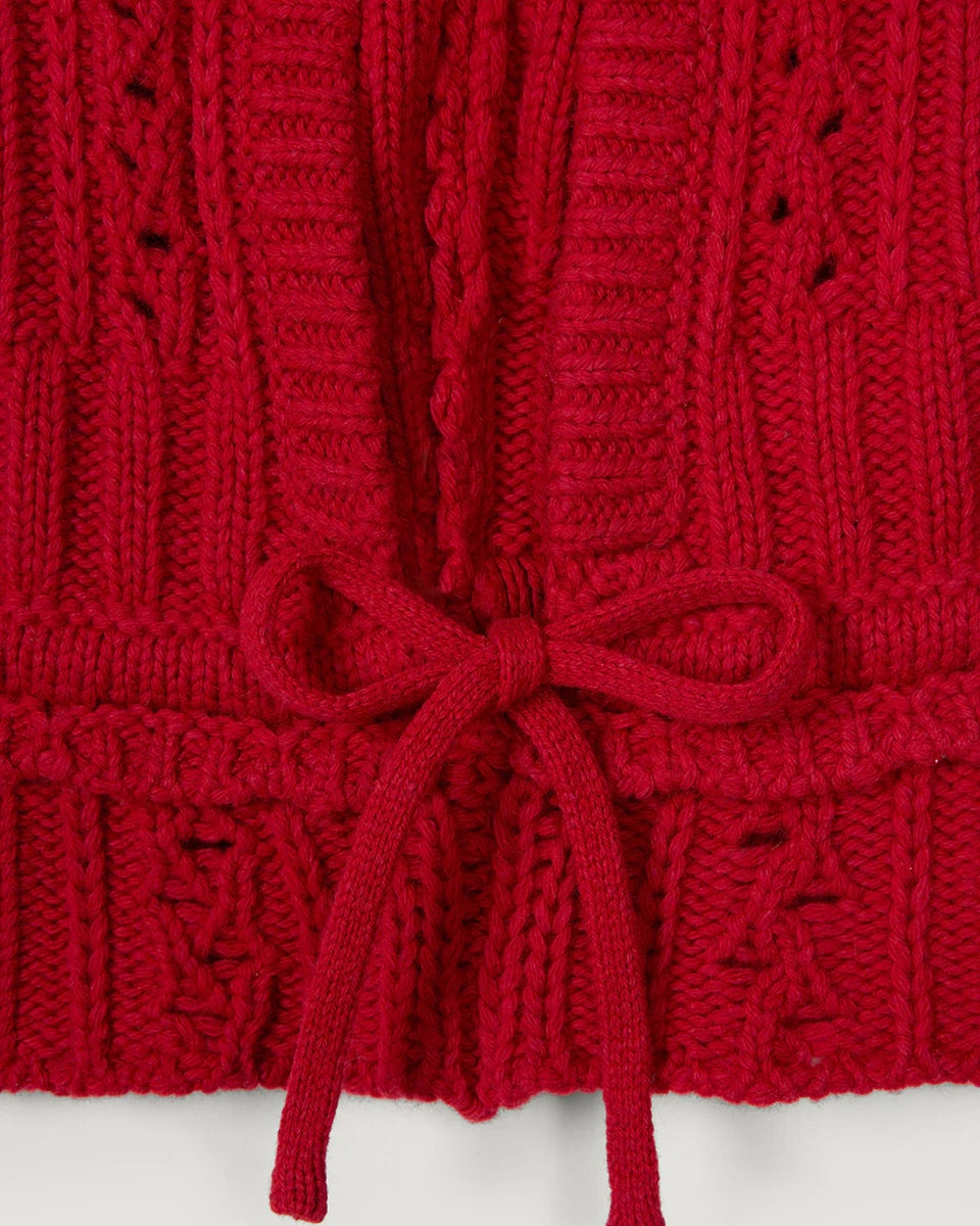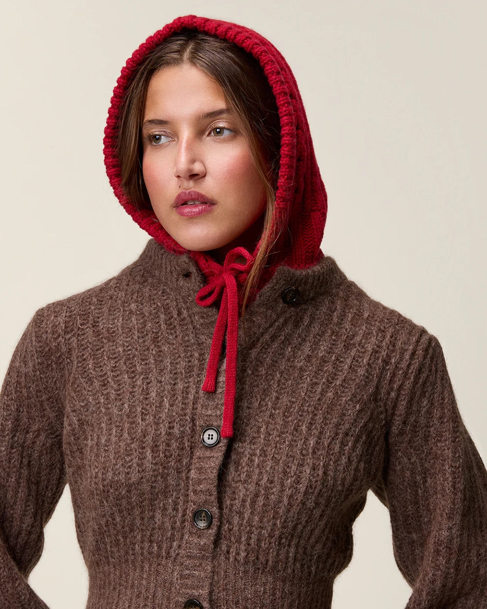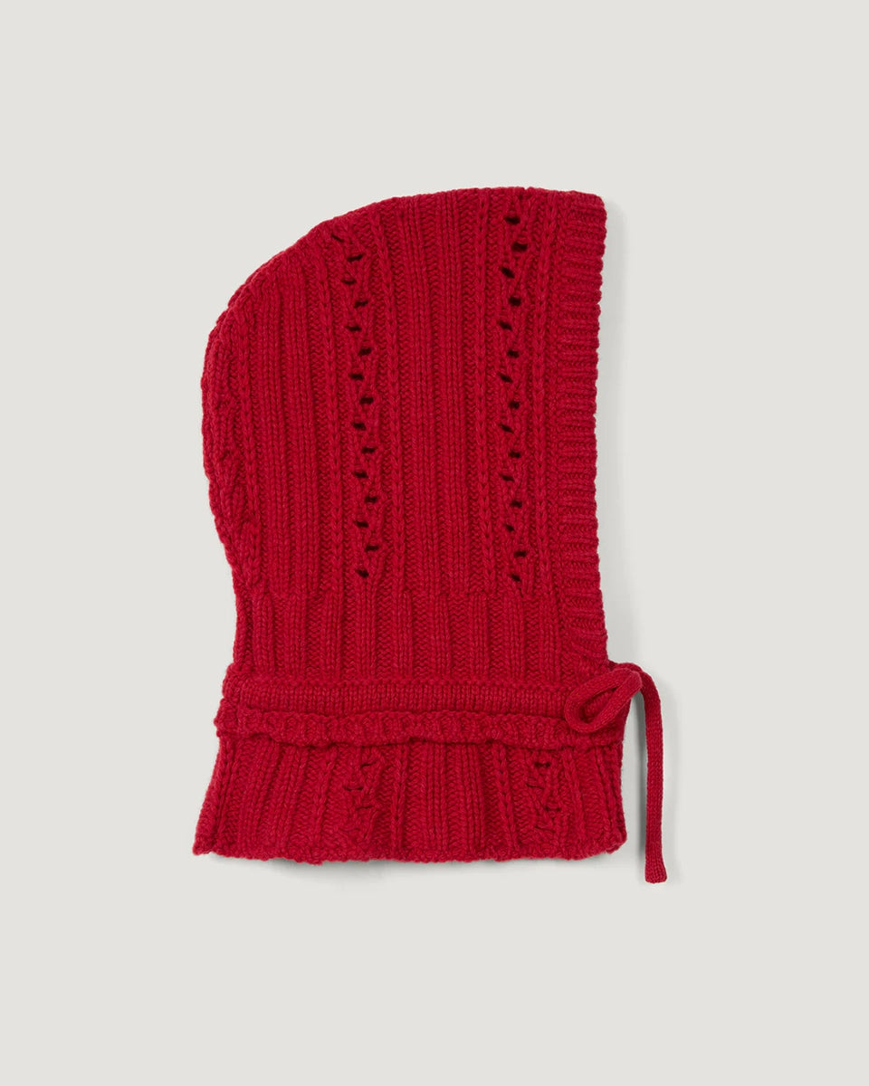 Czerwona balaclava Amine Rouje. Wykonana z ciepłej dzianiny z wełną. Wiązana pod szyją na kokardkę.