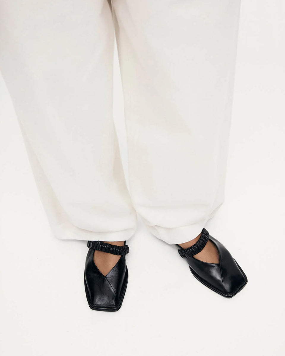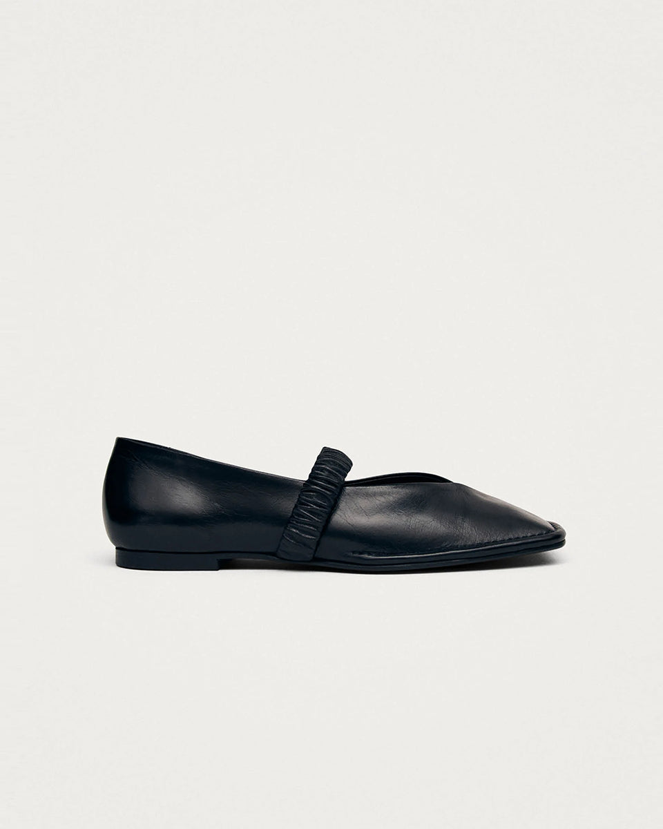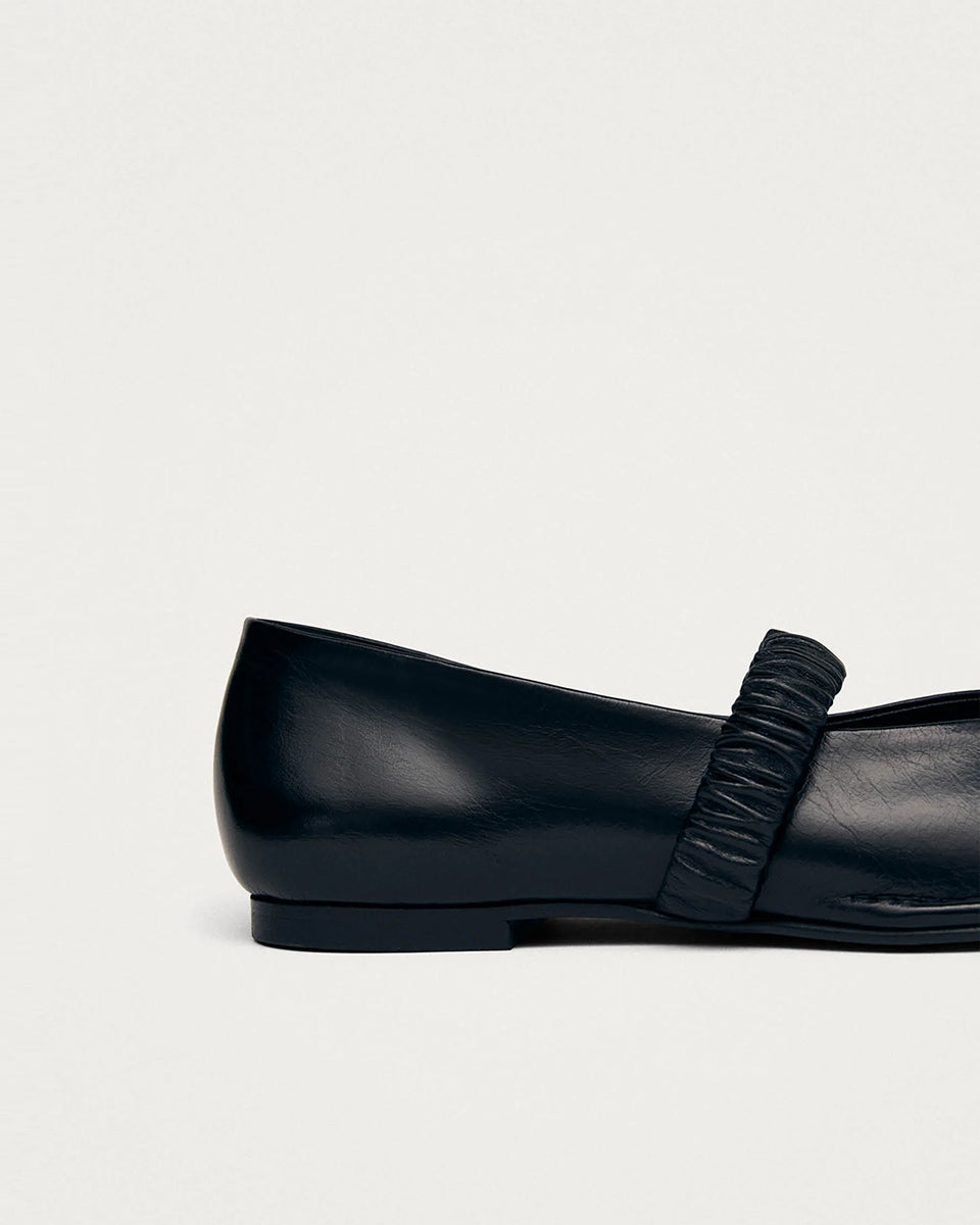 Czarne, skórzane baleriny Lautan Black Leather marki ALOHAS z charakterystycznymi, kwadratowymi noskami i widocznymi szwami z przodu. Mają marszczony pasek na cholewce, który dodaje elegancji i zapewnia dodatkową wygodę. Wykonane z wysokiej jakości skóry.