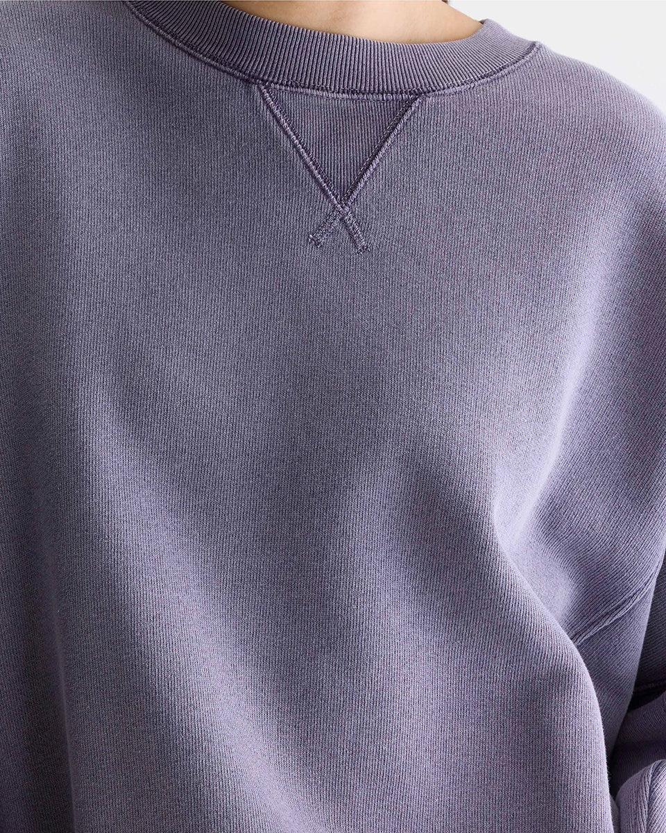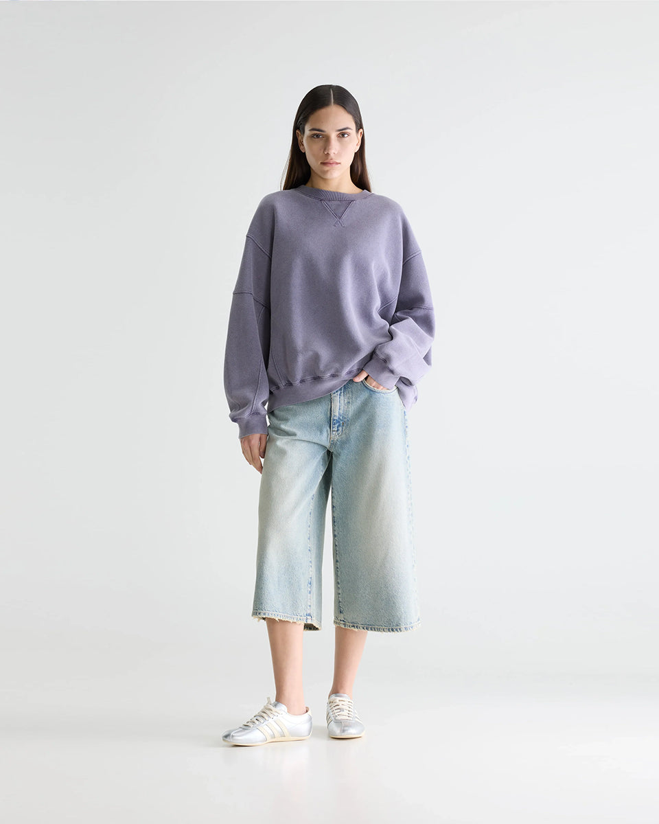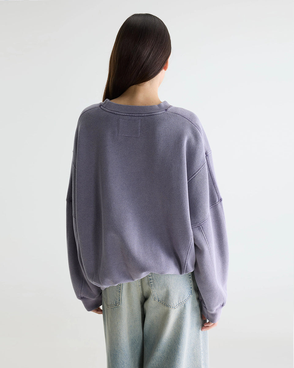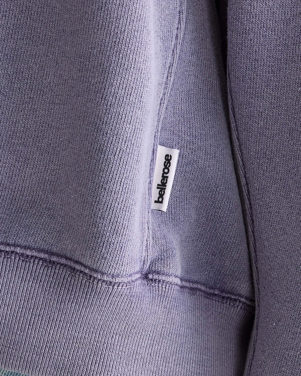 Oversizowa bluza w kolorze spranego fioletu Flips Grape marki BELLEROSE z okrągłym dekoltem, długimi rękawami ze ściągaczami i widocznymi szwami. Bluza ma obniżoną linię ramion i trójkątne przeszycia pod kołnierzem. U dołu posiada elastyczny ściągacz. Wykonana z dzianiny z bawełną.