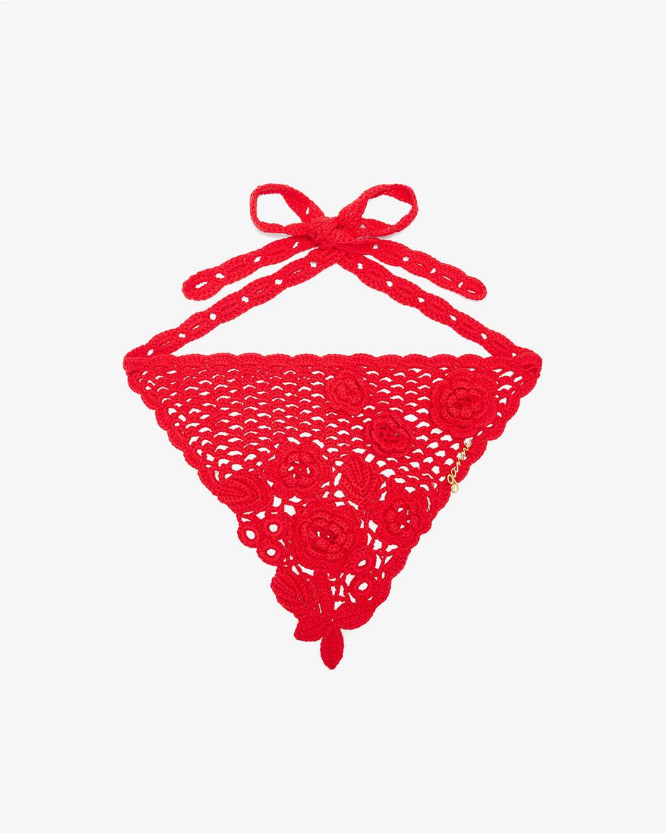 Haftowana chusta na głowę Cotton Crochet Goji Berry marki GANNI w pięknym, czerwonym kolorze, z kwiatami i logo marki. Wykonana z bawełny organicznej.
