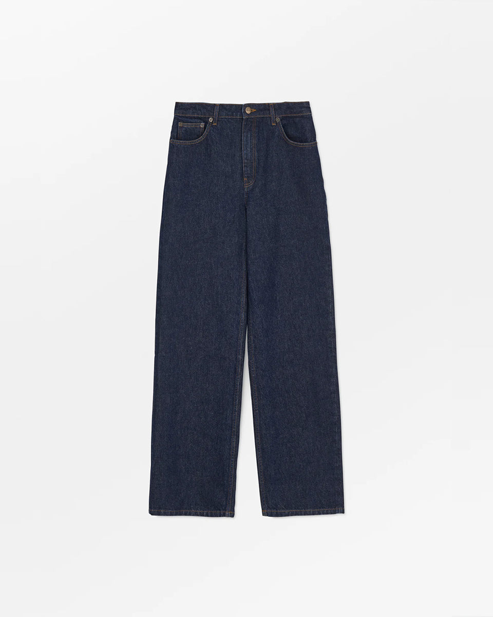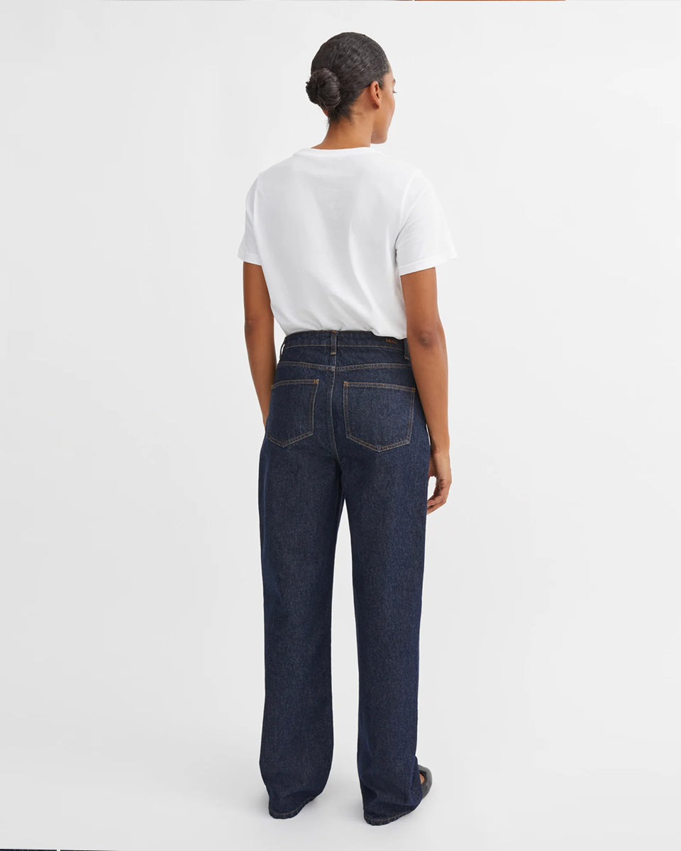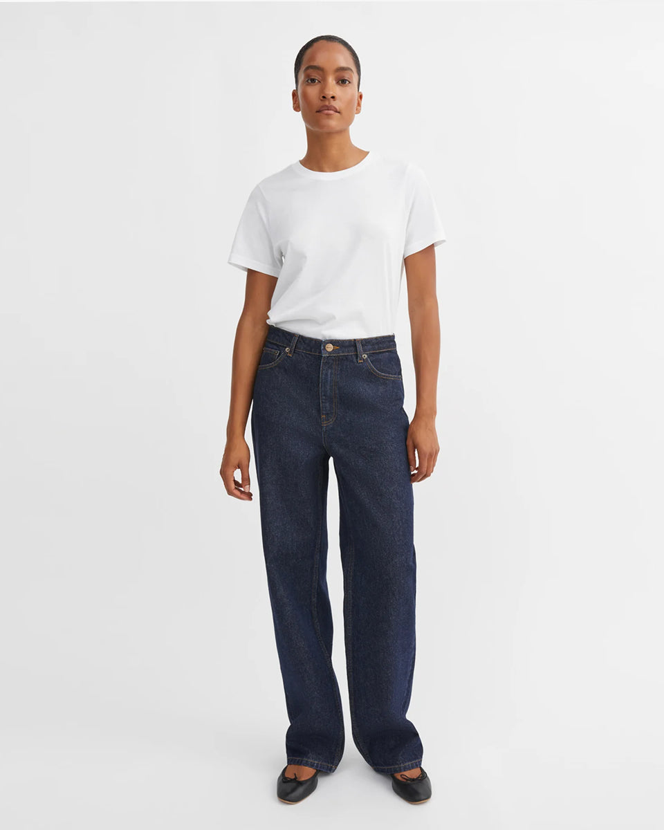 Luźne jeansy Maddy Indigo Blue marki SKALL z wysokim stanem, prostymi nogawkami i klasycznymi, jeansowymi detalami. Posiadają kieszenie, szlufki na pasek i haftowane logo z tyłu w pasie. Jeansy maja standardową długość. Wykonane z bawełny organicznej.