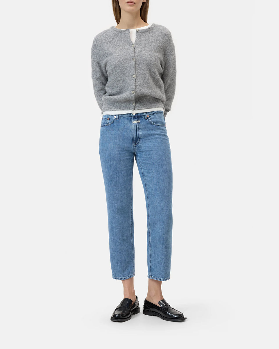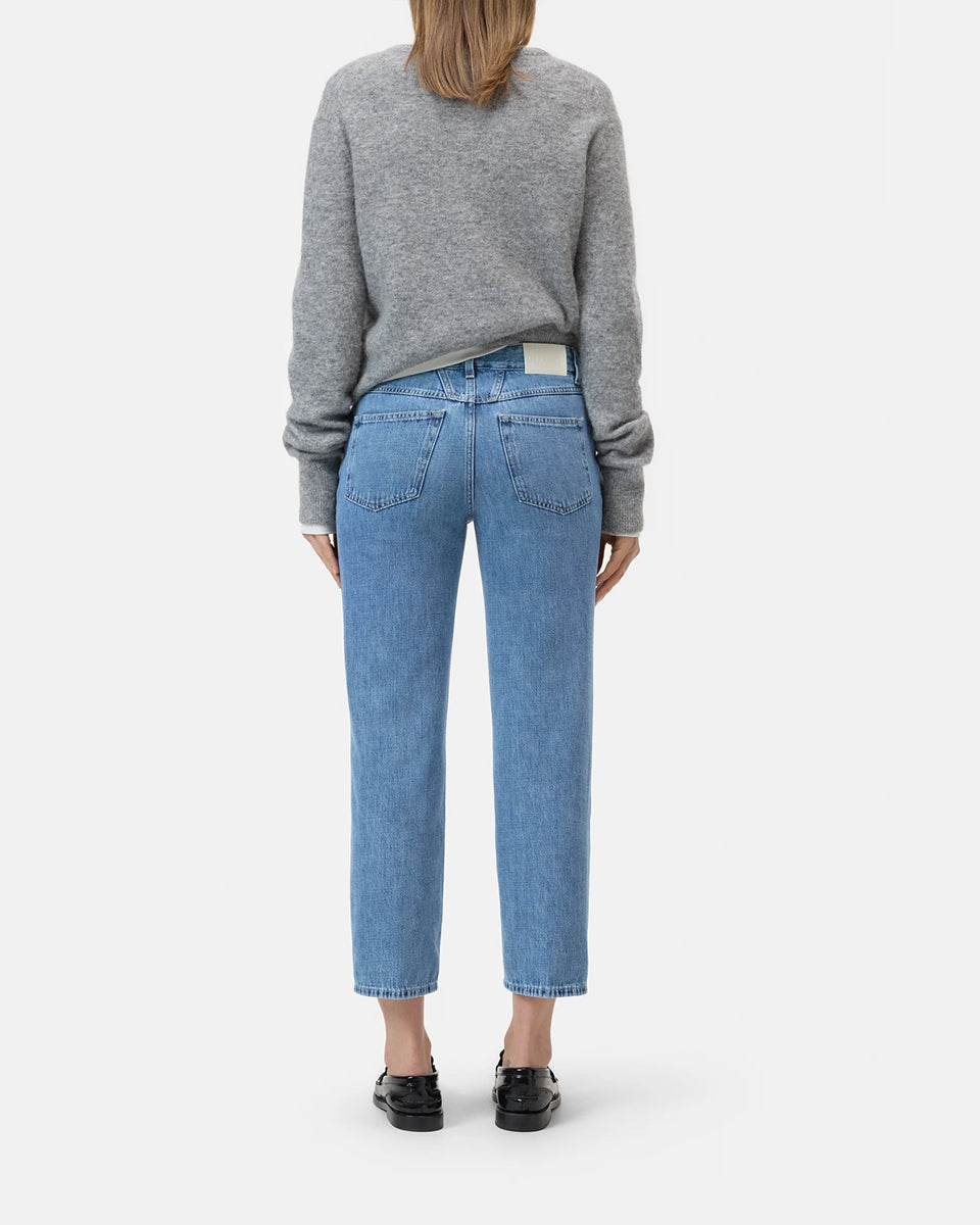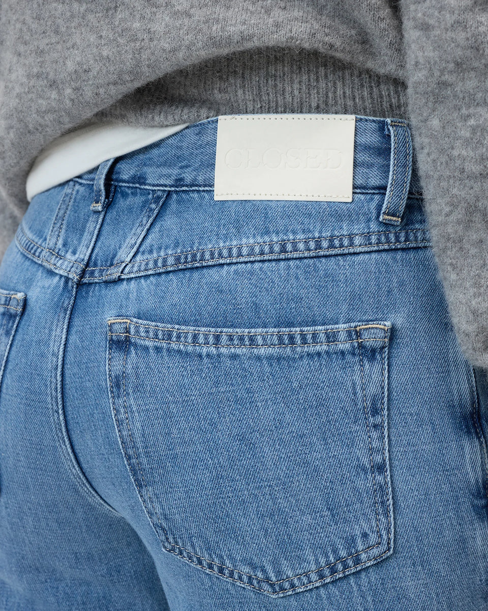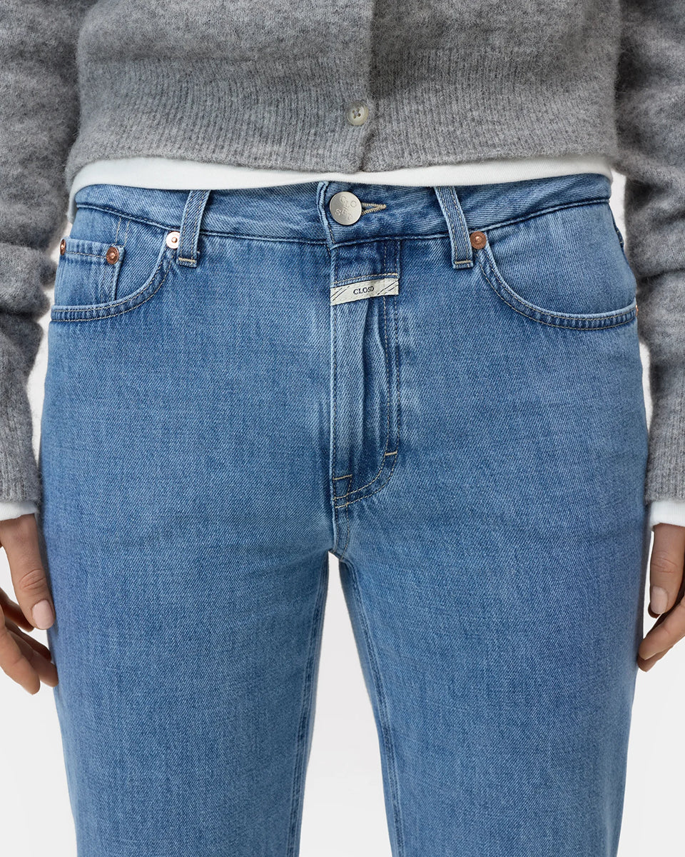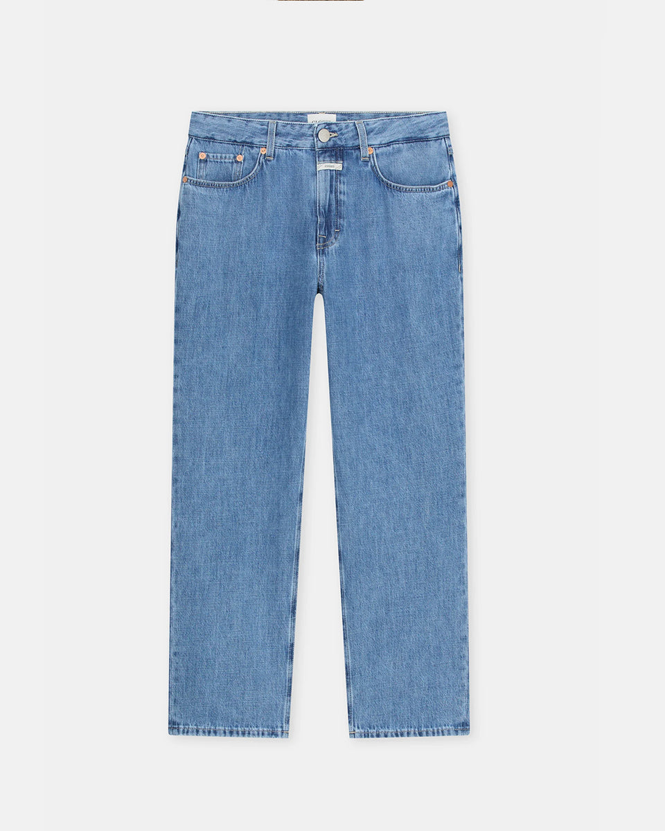 Niebieskie jeansy Milo marki CLOSED ze średnim stanem i prostą, luźną i skróconą nogawką. Przylegające w biodrach. Spodnie mają pięć kieszeni. Zapinane na guzik i zamek błyskawiczny. Przy rozporku posiadają niewielką, charakterystyczną dla marki naszywkę z logo CLOSED. Idealne do płaskich klapek i mokasynów.