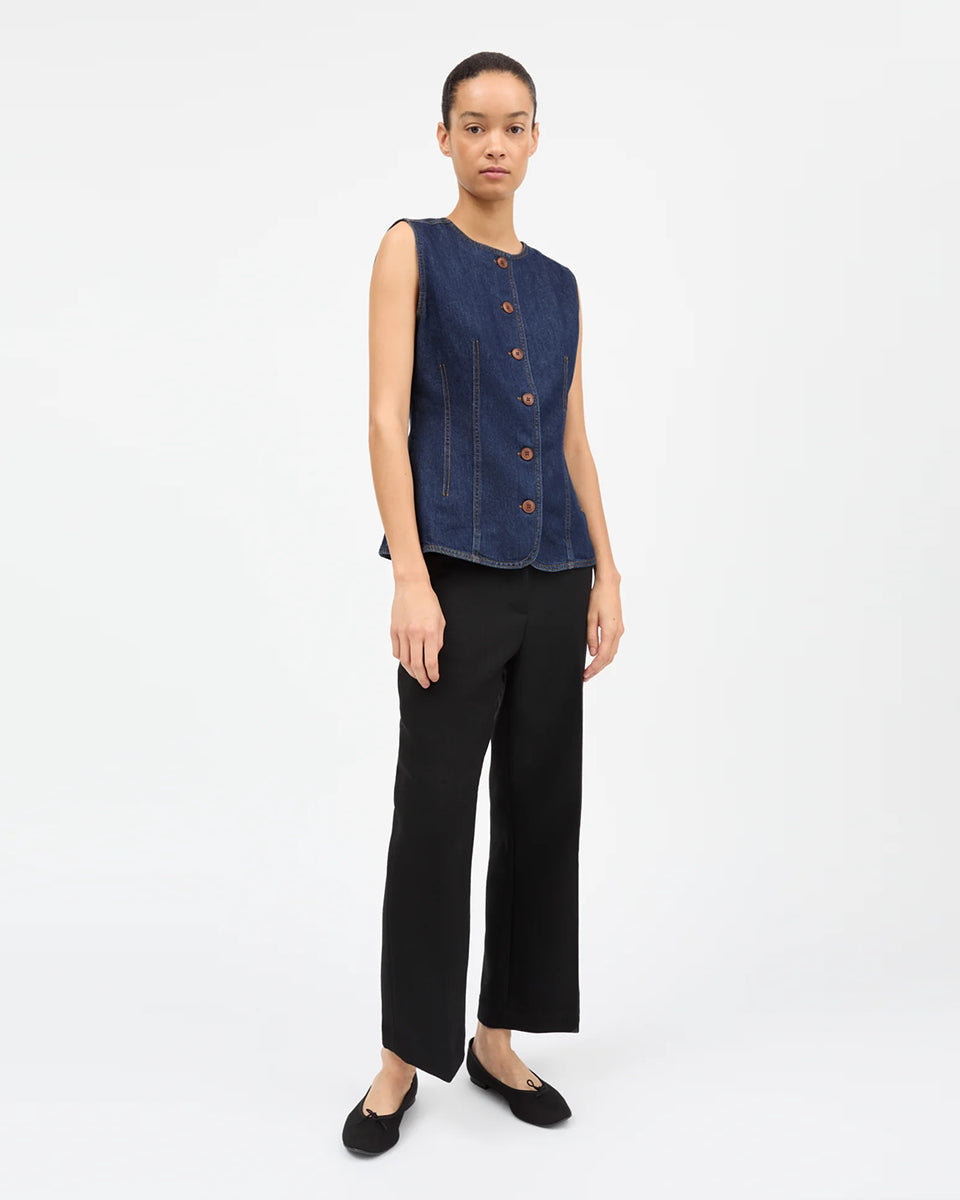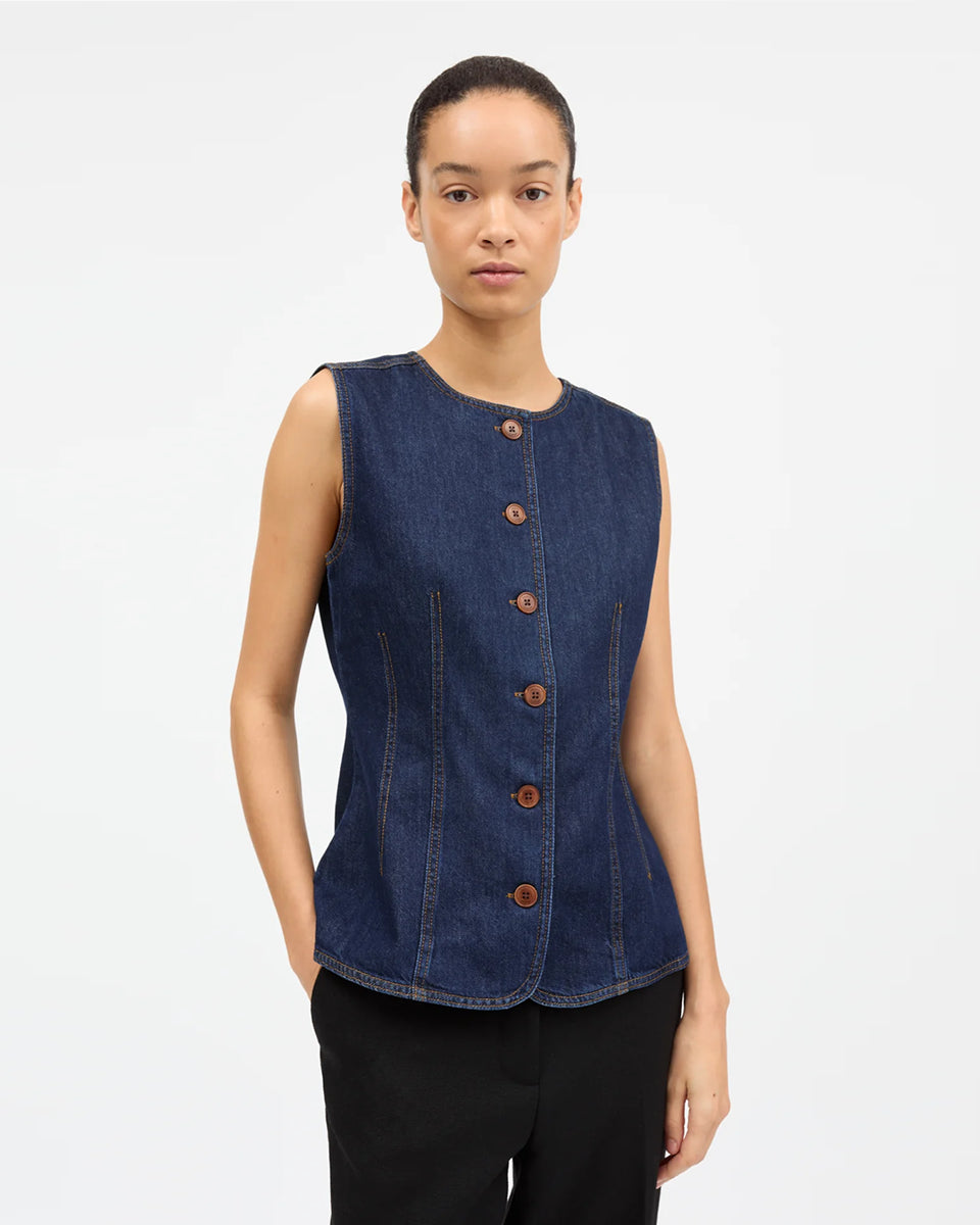 Dopasowana, jeansowa kamizelka Tammy Indigo Blue marki SKALL bez rękawów, z okrągłym dekoltem, podwójnymi szwami i zaszewkami. Zapinana na guziki z przodu. Wykonana w 100% z bawełny organicznej.