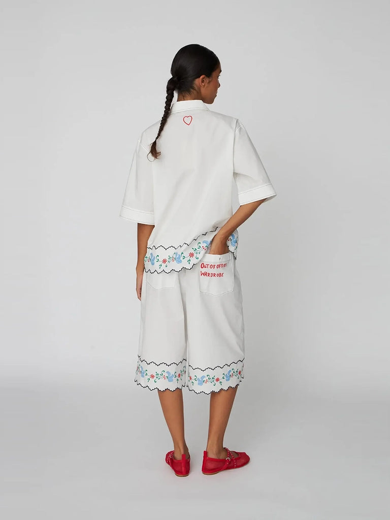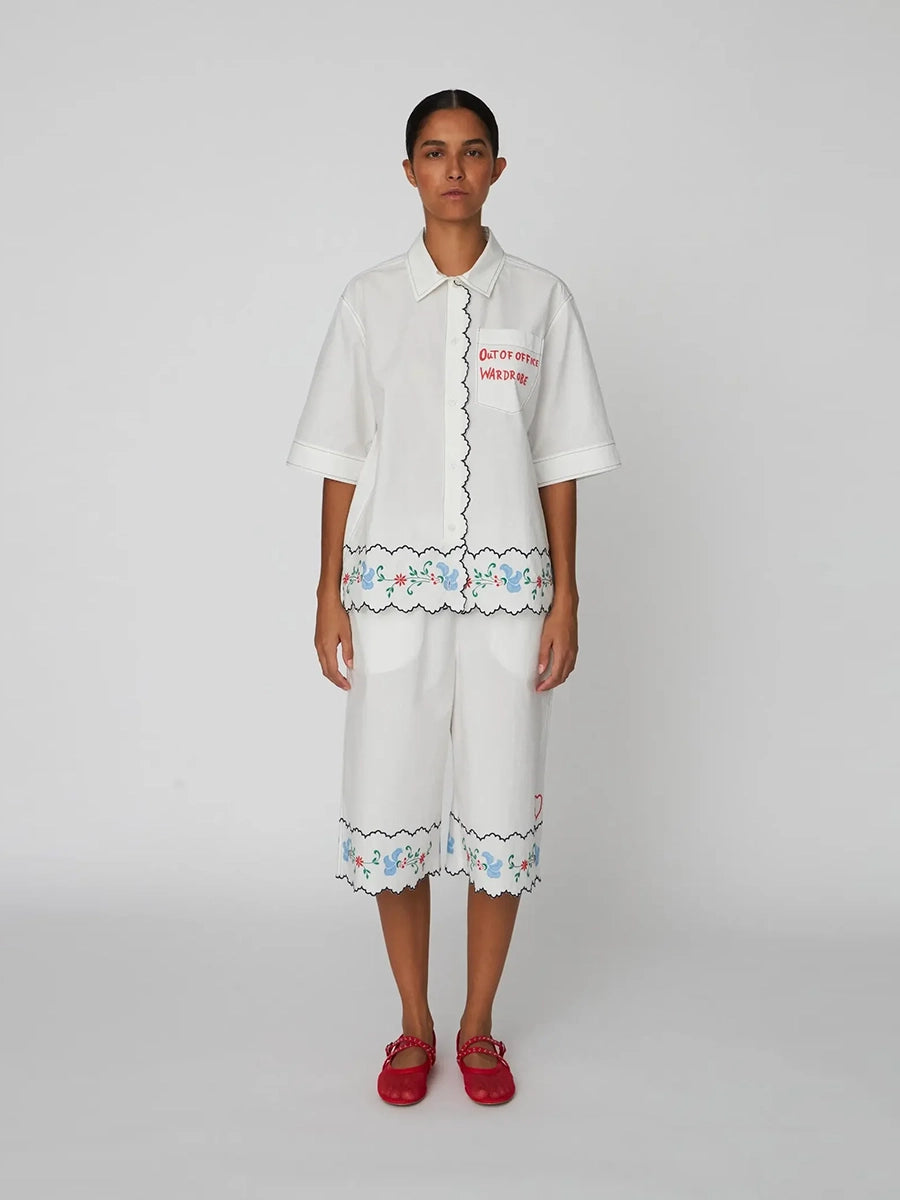 Oversizowa, biała koszula Coloured Embroidered z krótkim, szerokim rękawem, Dekorowana i wykończona pięknym, kolorowym haftem w ludowym stylu. Nad lewą piersią posiada kieszonkę z czerwonym, haftowanym napisem "Out of office Wardrobe", a na plecach urocze serduszko. Zapinana na guziki. Wykonana z bawełny organicznej.