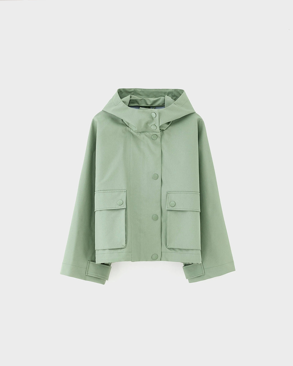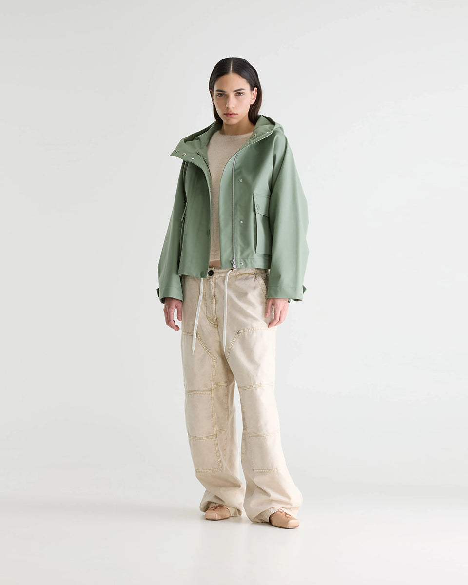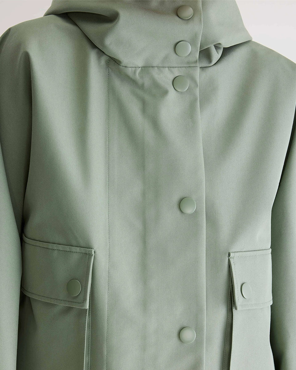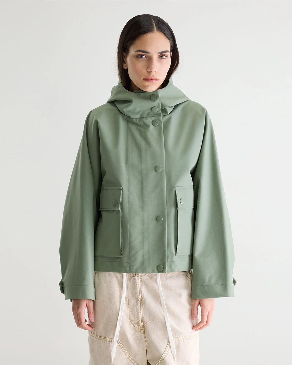 Luźna, pudełkowa kurtka z kapturem w kolorze jasnego khaki Jenna Eucalyptus marki BELLEROSE z wysokim kołnierzem i długimi rękawami, z regulowanymi mankietami na zatrzaski. Posiada dwie duże kieszenie z patkami. Zapinana z przodu na zatrzaski i ukryty zamek błyskawiczny.