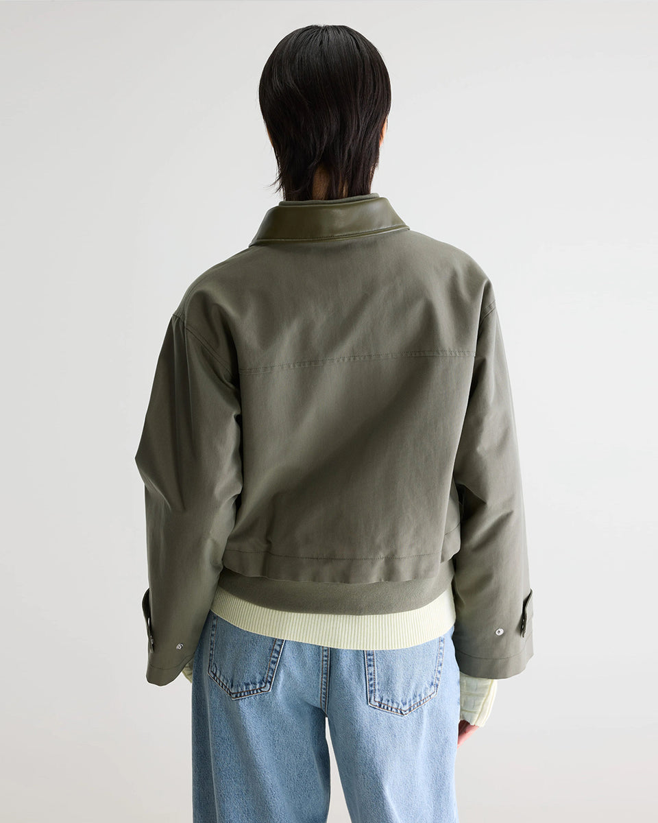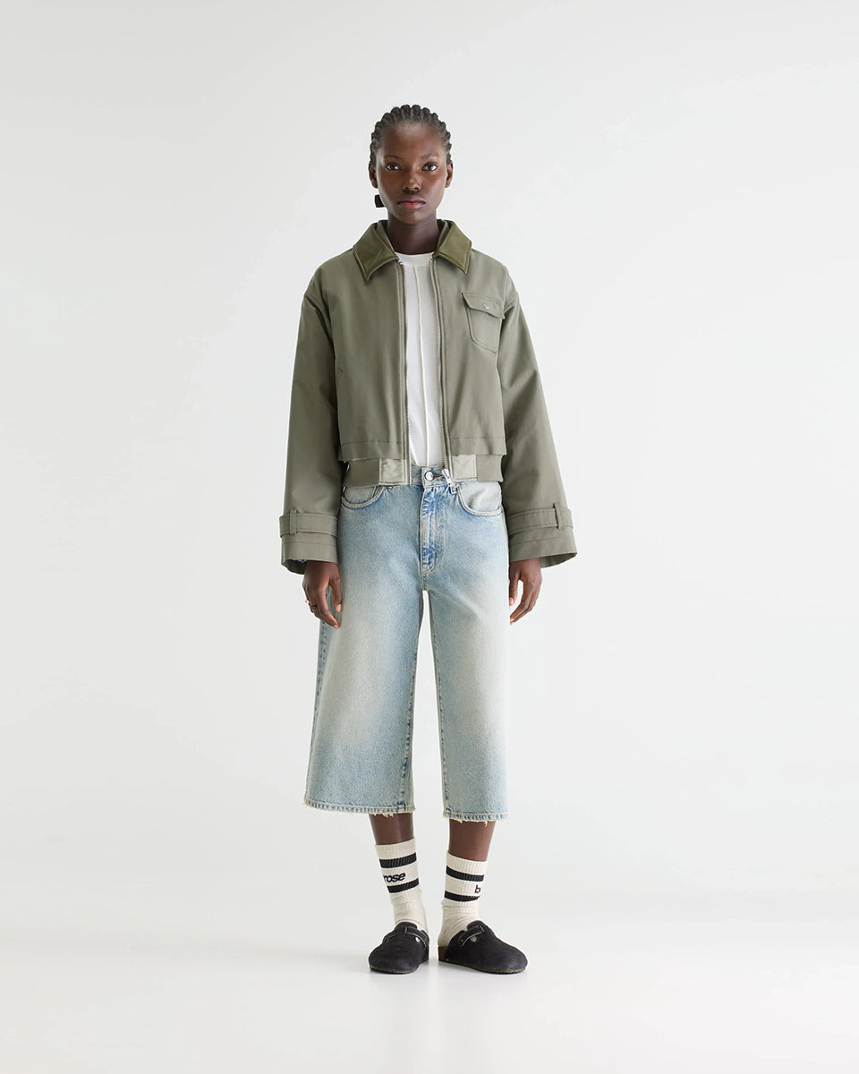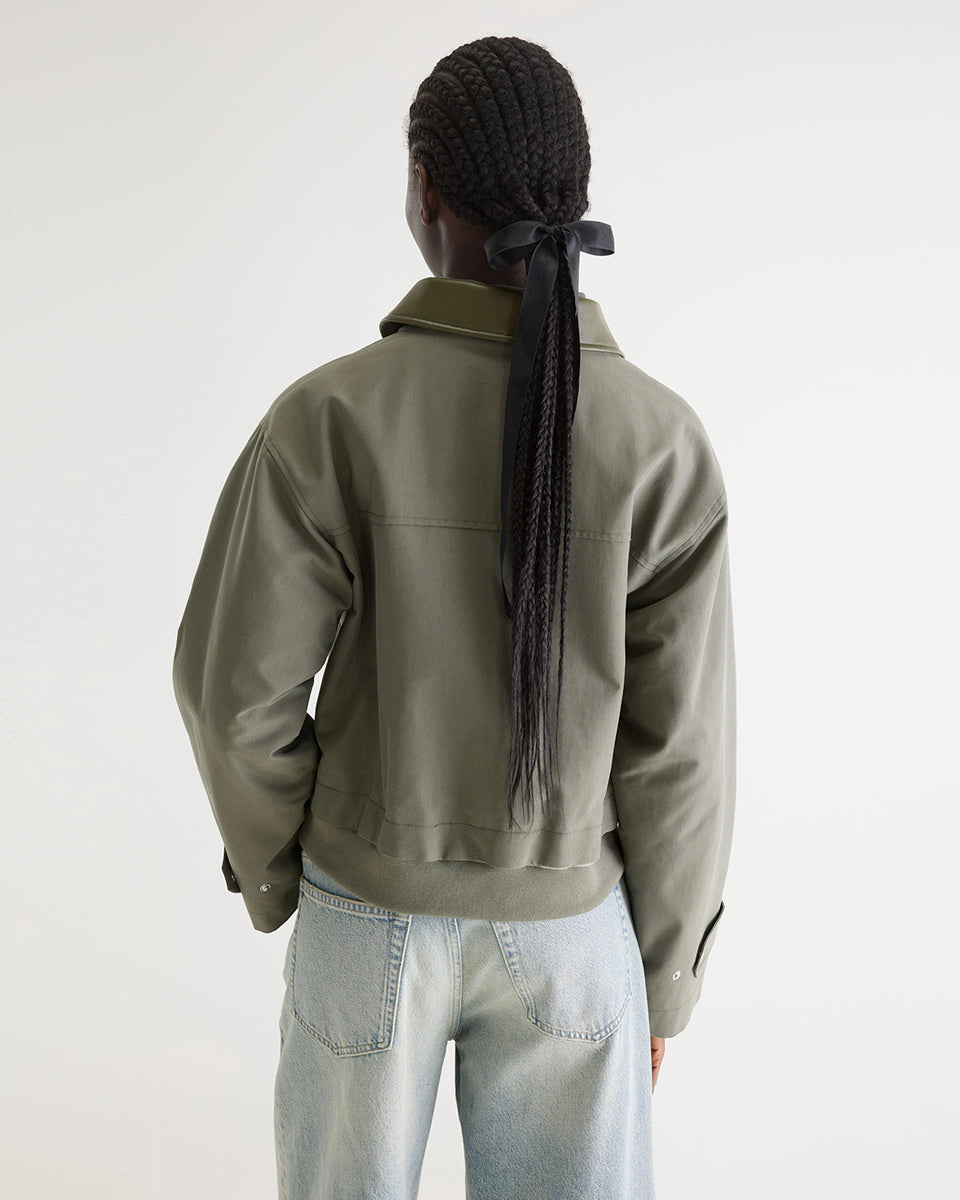 Luźna, krótka kurtka khaki Jenner Sage marki BELLEROSE z kontrastowym, oliwkowo-zielonym kołnierzykiem ze sztucznej skóry i długimi, regulowanymi rękawami. Posiada dwie boczne kieszenie oraz kieszeń z patką na lewej piersi zapinaną guzik. U dołu ma ściągacz z kontrastową wstawką. Zapinana na srebrny zamek błyskawiczny. Kurtka ma pikowaną, jasnoniebieską, satynową podszewkę.