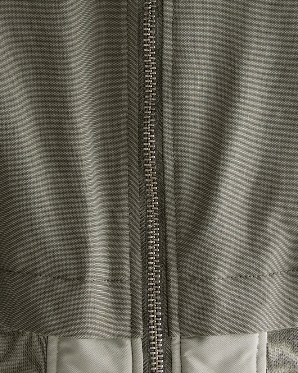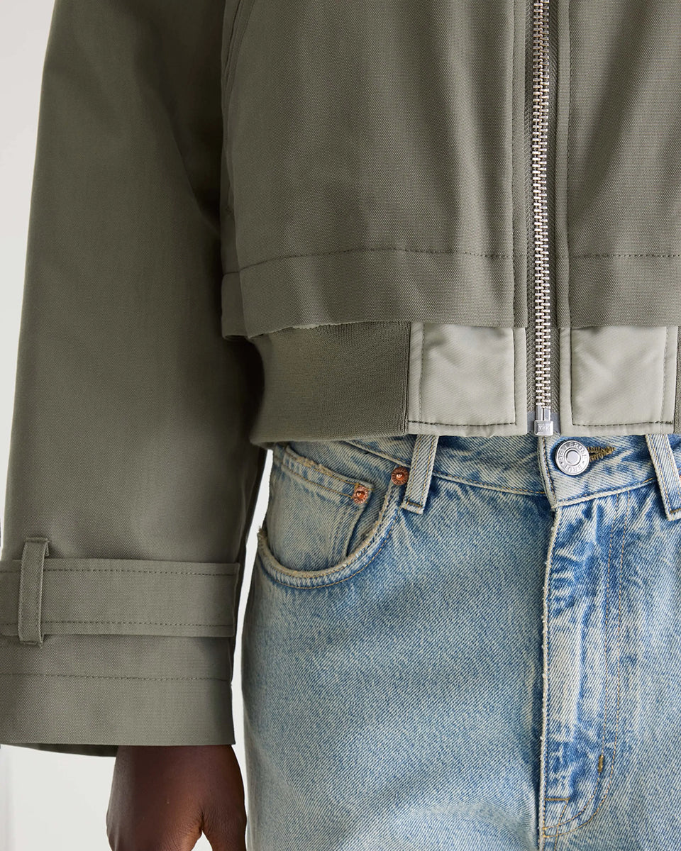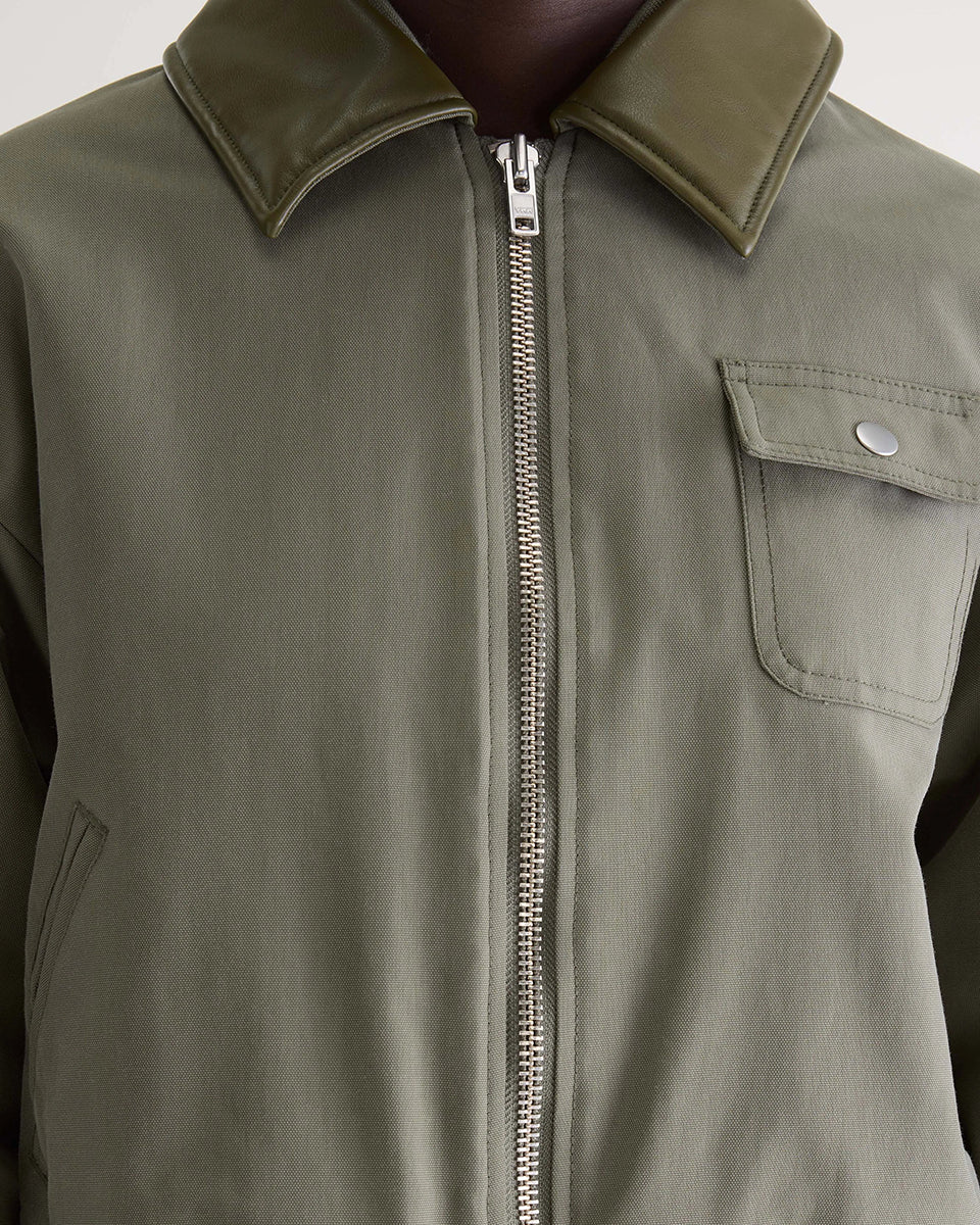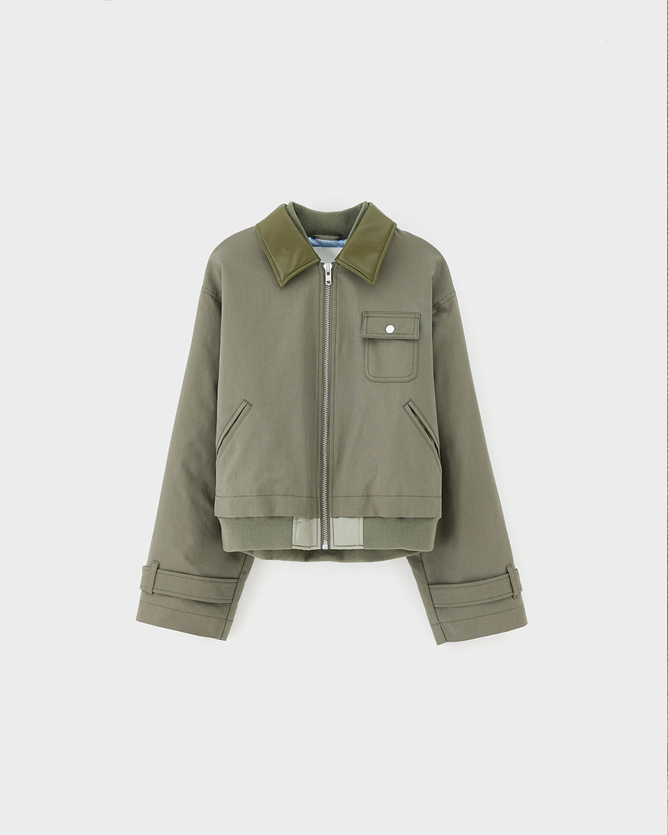 Luźna, krótka kurtka khaki Jenner Sage marki BELLEROSE z kontrastowym, oliwkowo-zielonym kołnierzykiem ze sztucznej skóry i długimi, regulowanymi rękawami. Posiada dwie boczne kieszenie oraz kieszeń z patką na lewej piersi zapinaną guzik. U dołu ma ściągacz z kontrastową wstawką. Zapinana na srebrny zamek błyskawiczny. Kurtka ma pikowaną, jasnoniebieską, satynową podszewkę.