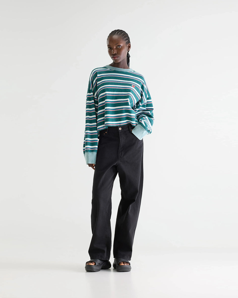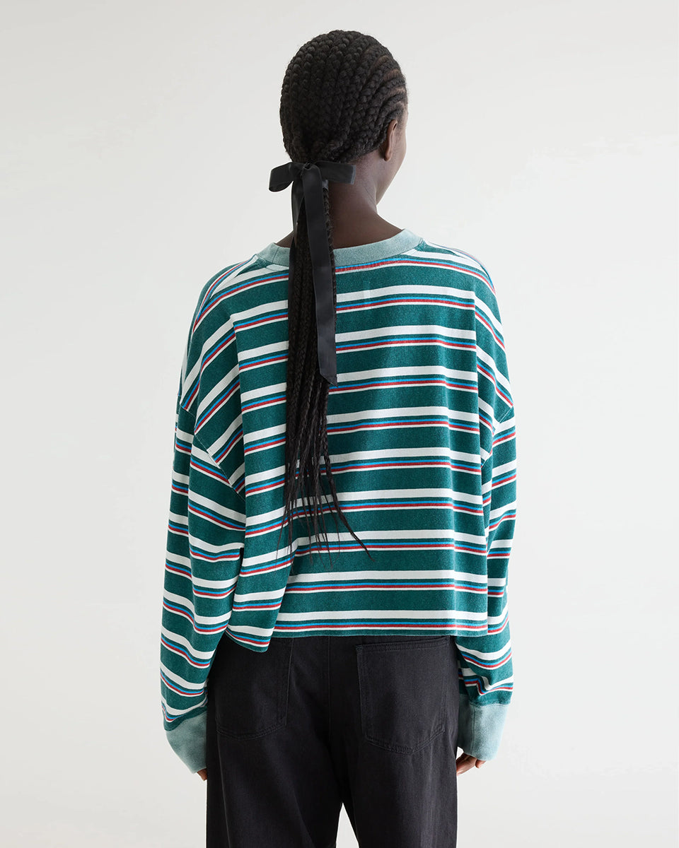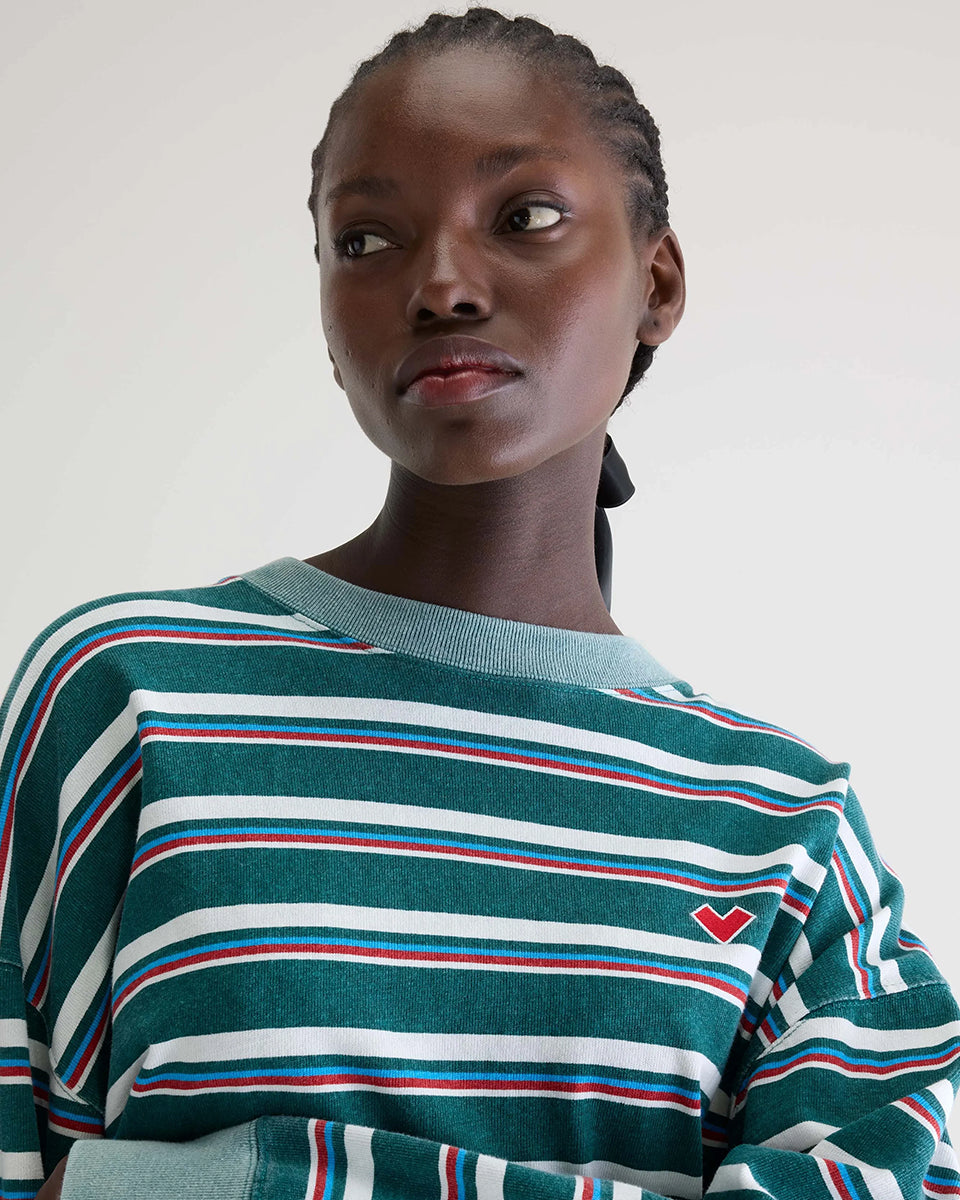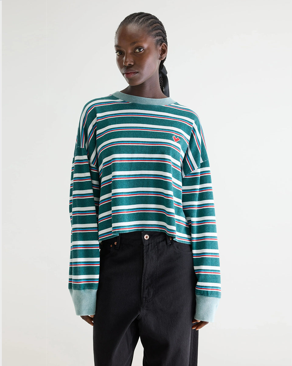 Luźny, skrócony T-shirt Franto Stripe-B marki BELLEROSE z okrągłym dekoltem i długimi rękawami w ciemnozielonym kolorze z kolorowymi paskami. Wykończony kontrastowym, spranym, zielonym ściagaczem przy kołnierzyku i mankietach. Wykonany z bawełny.