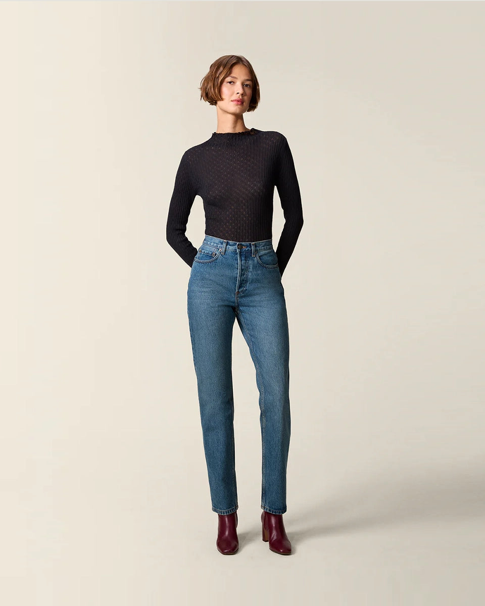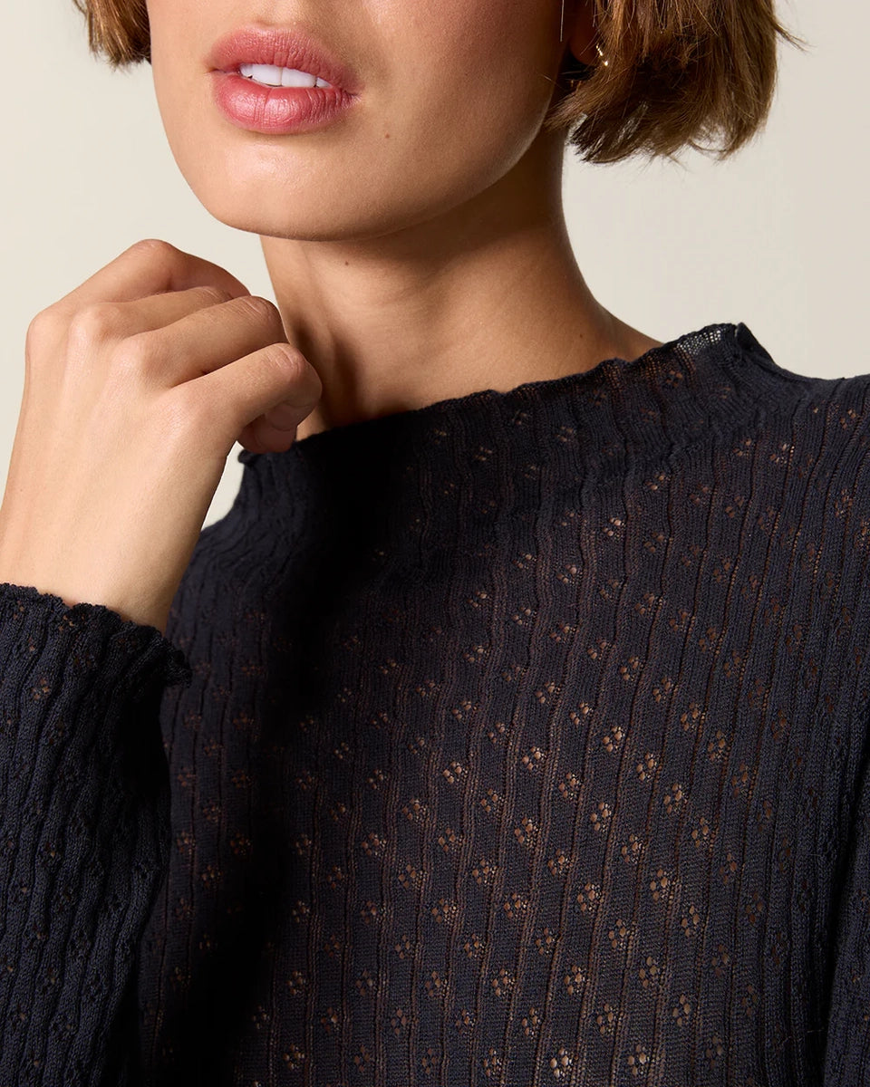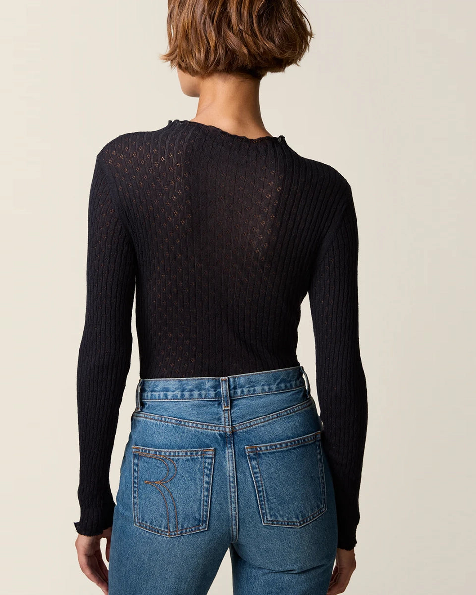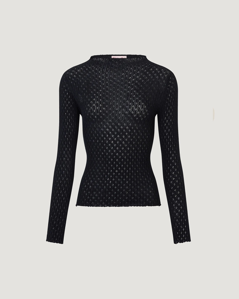 Cienki, ażurowy, dzianinowy longsleeve Galina Rouje o dopasowanym fasonie. Posiada wysoki dekolt. Przy szyi i na końcu rękawów wykończony falbanką. Idealny do spodnie z wysokim stanem.