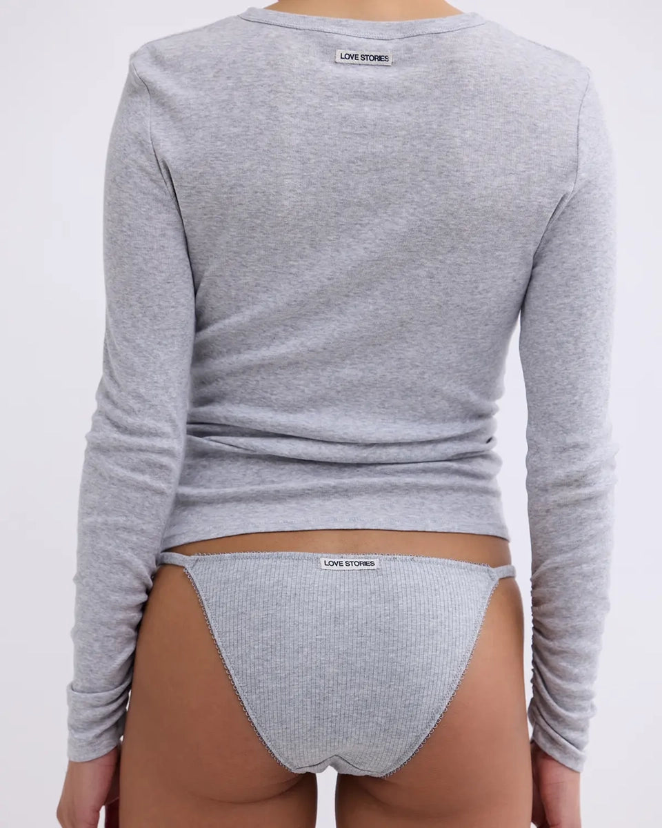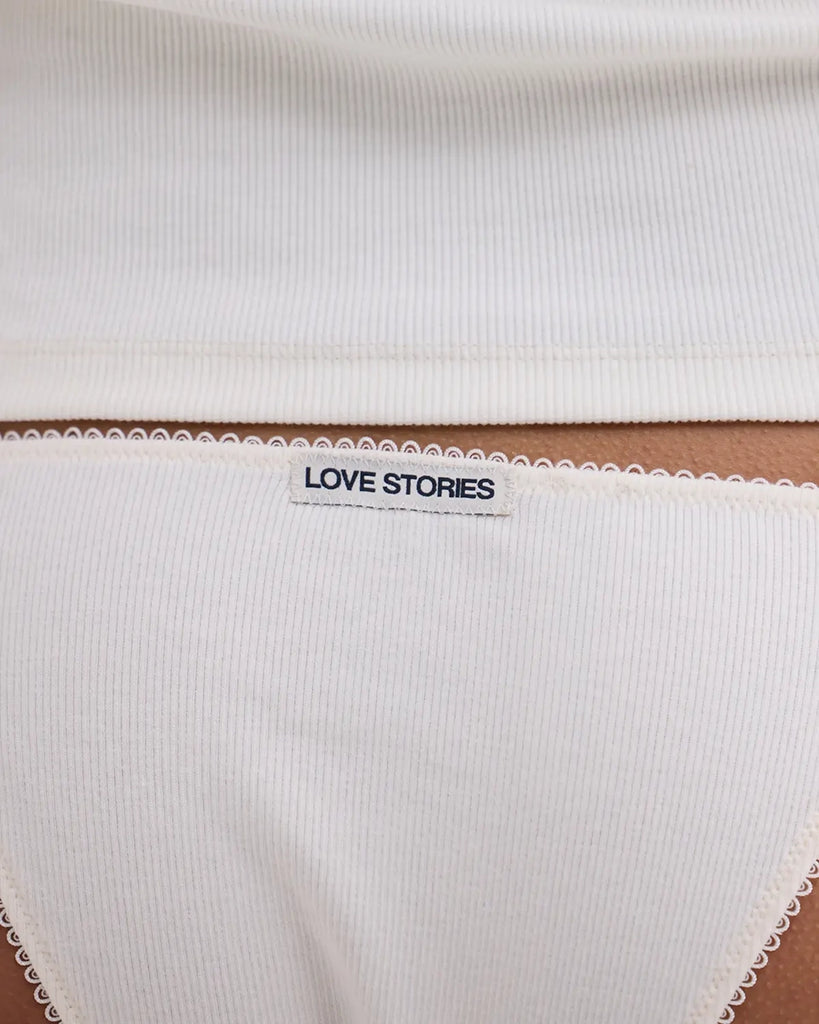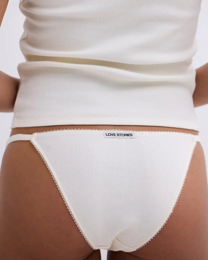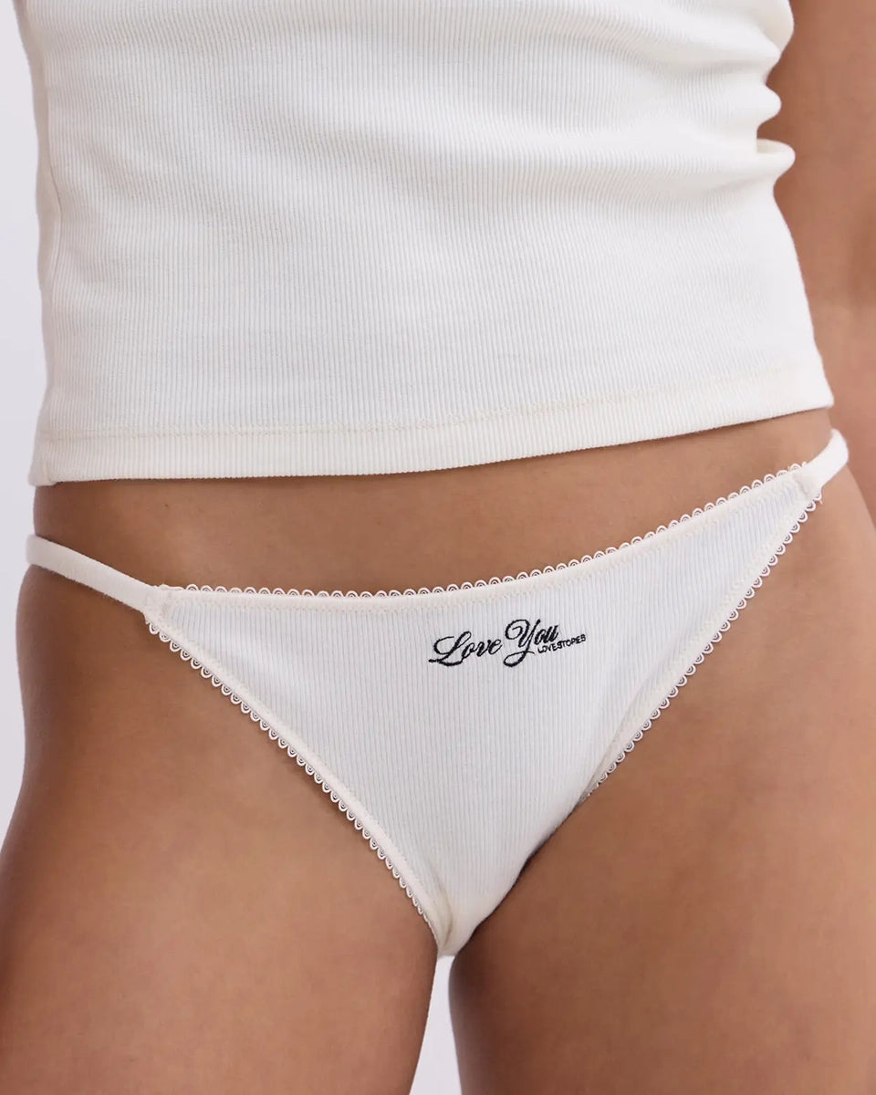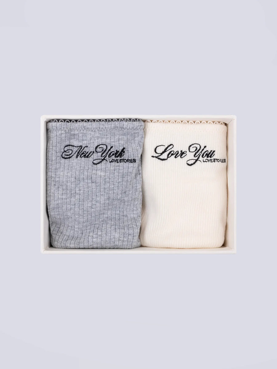 Zestaw majtek z niskim stanem i cienką gumą Clio Love Stories. Z przodu posiadają wyhaftowane napisy. Wykonane z miękkiej tkaniny z prążkowaną fakturą. Majtki mają bawełnianą podszewkę. Są zapakowane w pudełko.