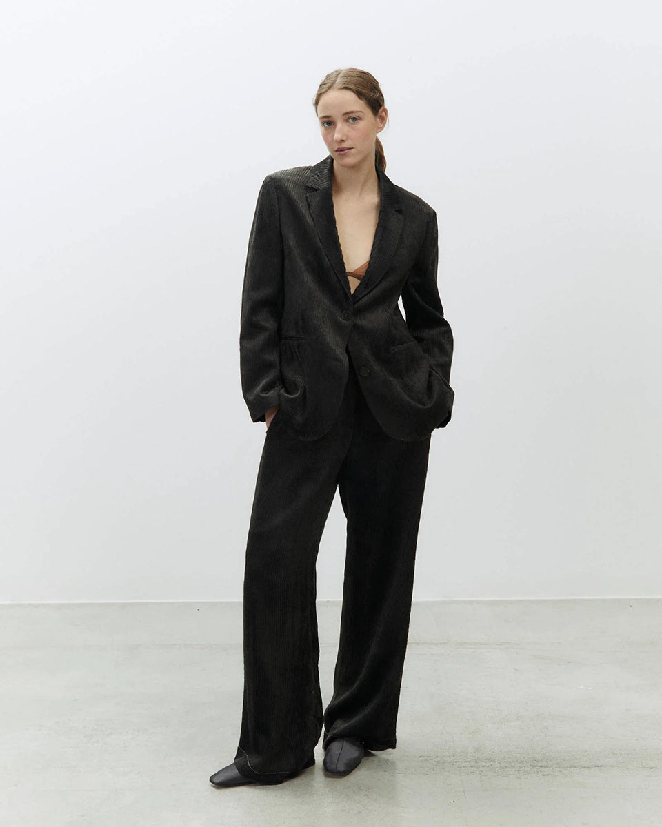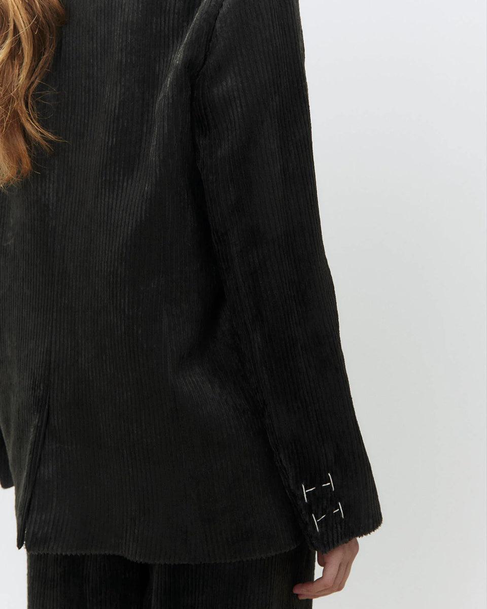 Jednorzędowa, sztruksowa marynarka Velvet Rib Carbone o klasycznym kroju z kontrastującymi kremowymi przeszyciami przy mankietach. Zapinana na guzik z przodu. Posiada kieszenie z wypustkami i rozcięcie z tyłu. Stwórz idealny look ze spodniami Velvet Rib Carbone.