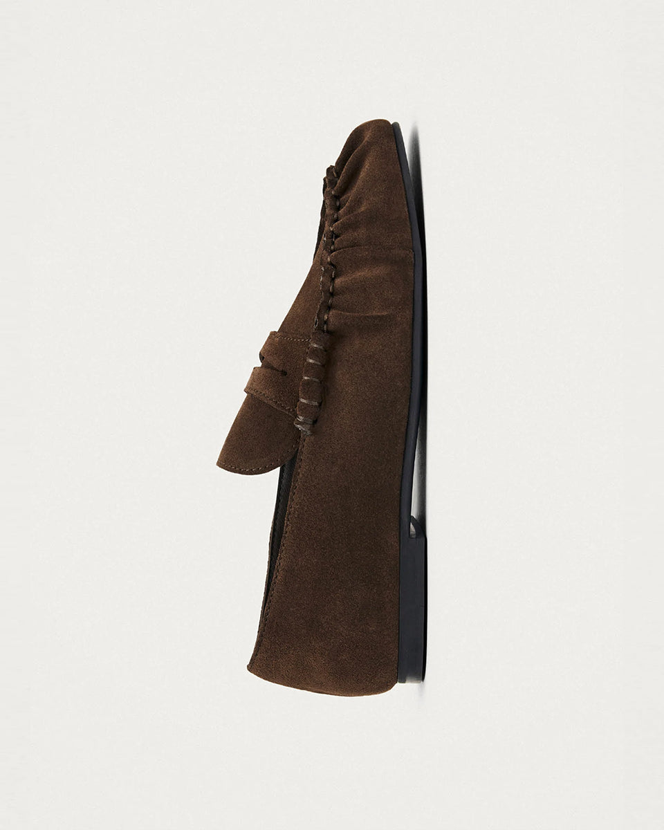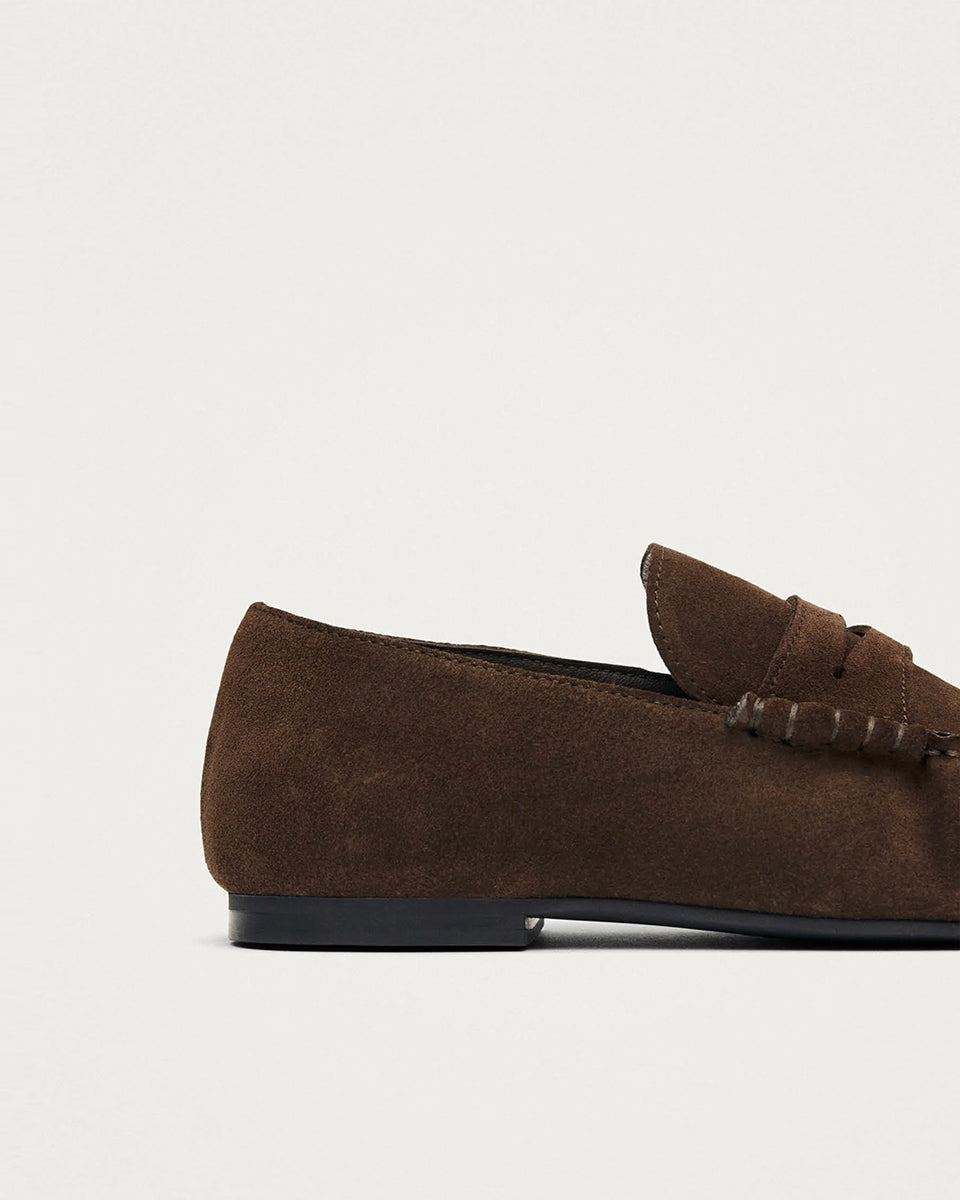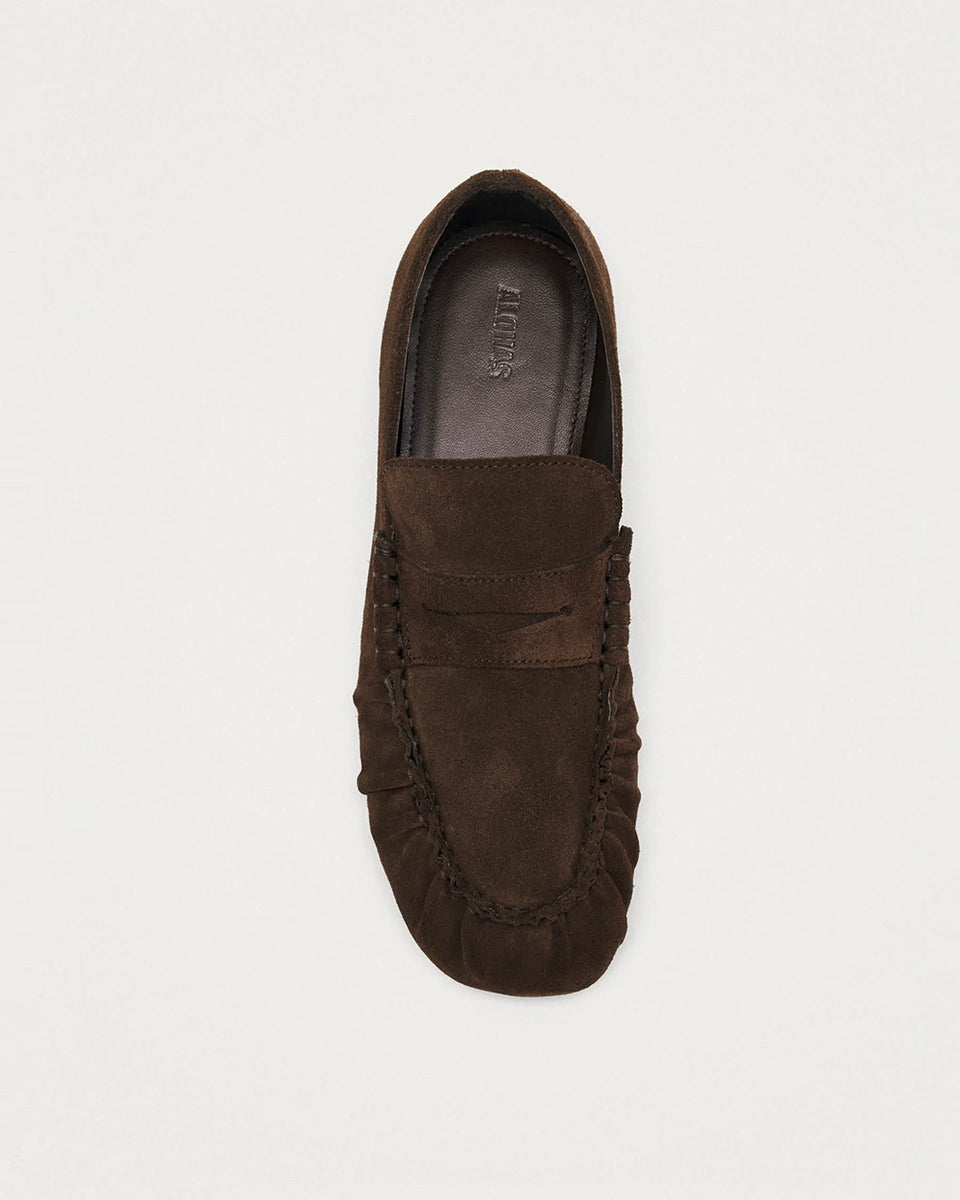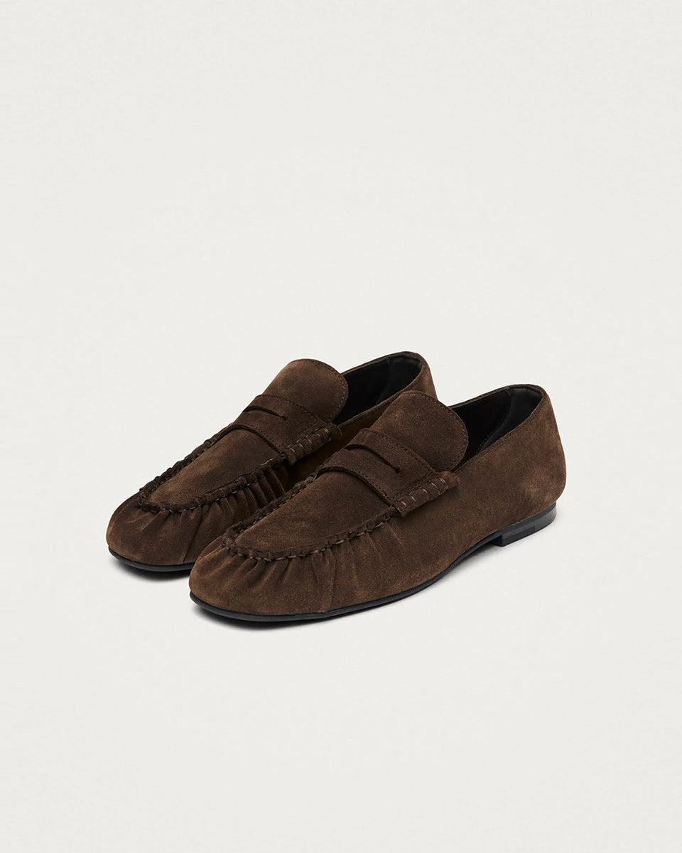 Brązowe, zamszowe mokasyny Aven Suede Brown Leather marki ALOHAS z klasycznym paskiem typu penny oraz cholewką klasyczną dla mokasynów. Wykonane z wysokiej jakości skóry, która zapewnia wyrafinowany wygląd, a marszczenia dodają im niepowtarzalnego charakteru.