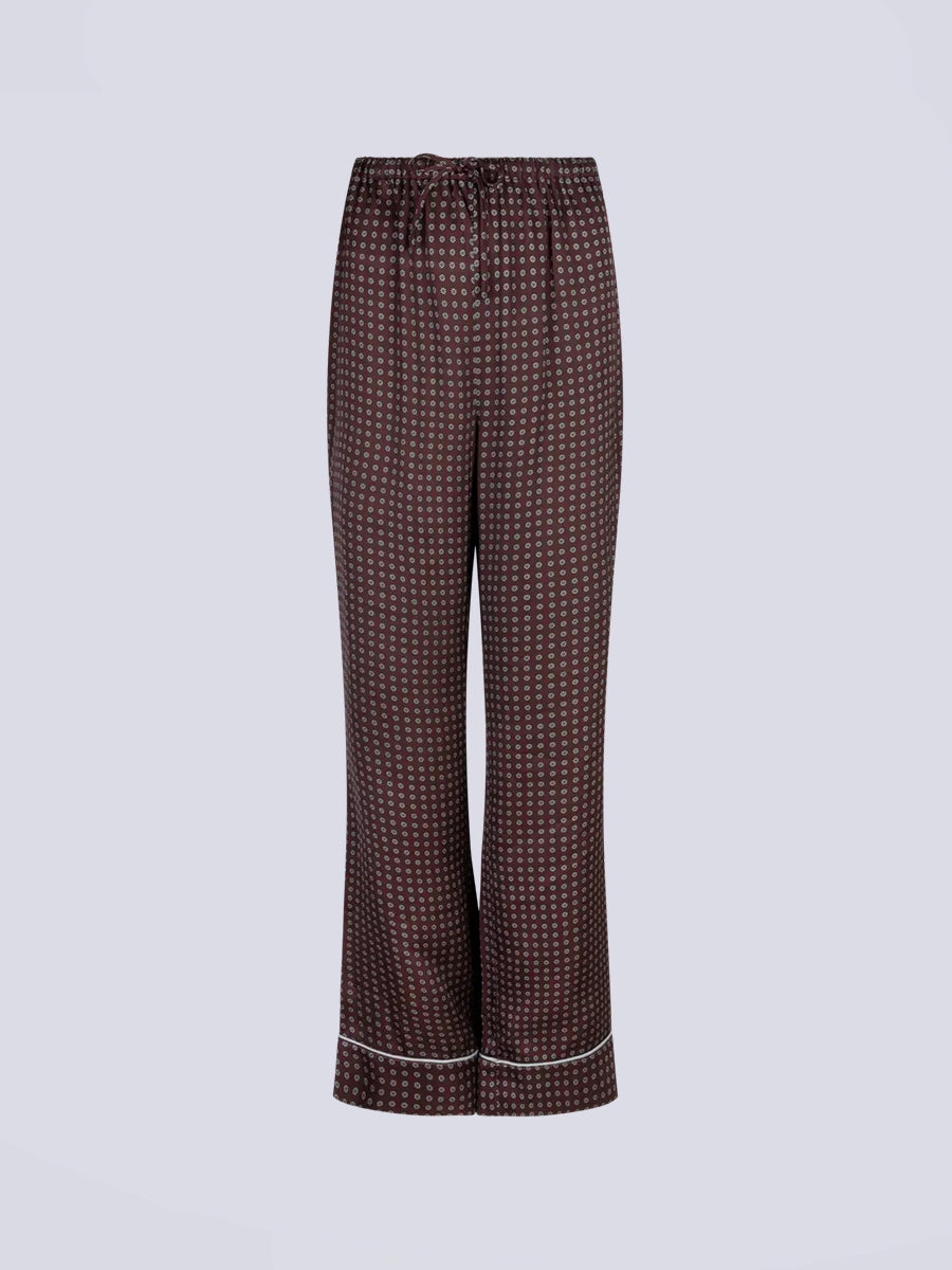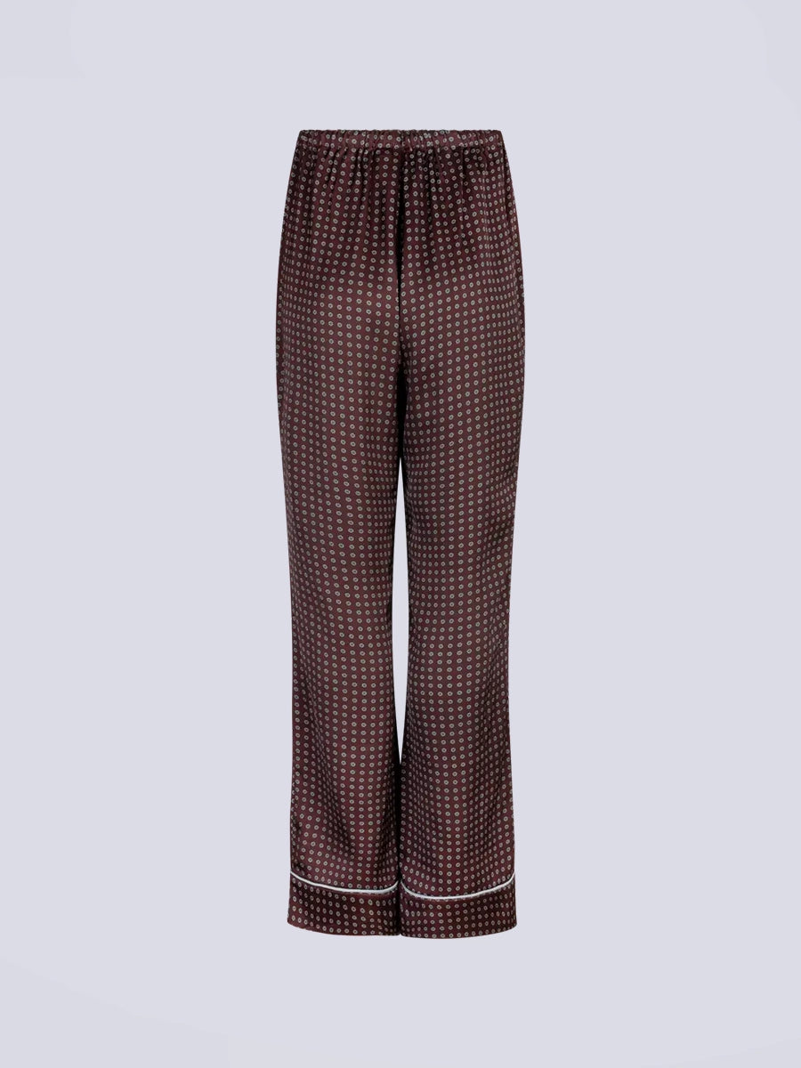 Luźne, satynowe spodnie piżamowe Reese Love Stories ze średnim stanem i elastyczną, wiązaną talią. Wykonane z lejącej tkaniny z wiskozy w drobny, kwiatkowy print. Spodnie mają dwie, tylne kieszenie. Wykończone są cienką, błękitną lamówką.