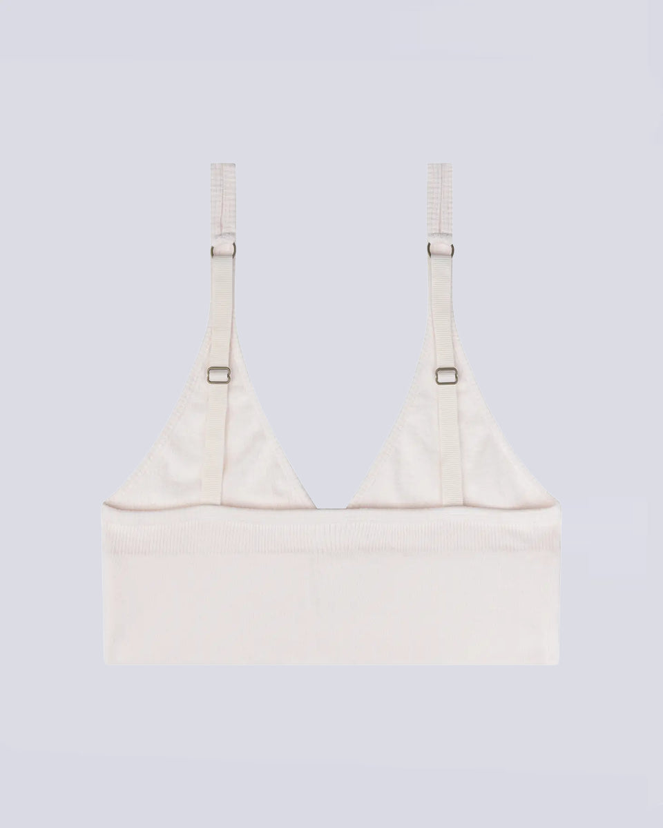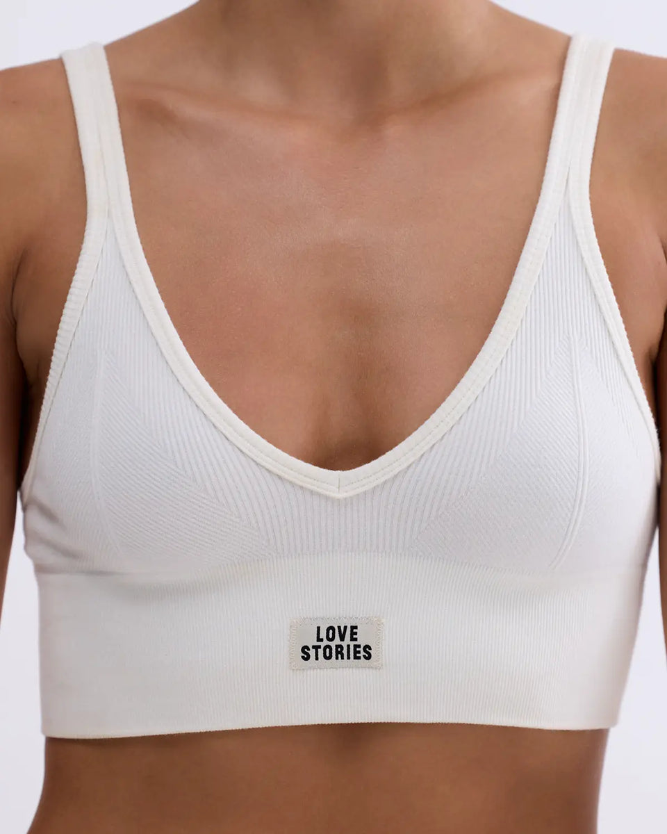 Wygodny, dzianinowy, sportowy stanik Posey Love Stories z trójkątnymi miseczkami i szeroką gumą pod biustem. Wykonany z elastycznej tkaniny z prążkowaną fakturą. Z przodu posiada niewielką naszywkę z logo marki. Świetnie sprawdzi się podczas delikatnych aktywności fizycznych takich jak spokojna yoga.