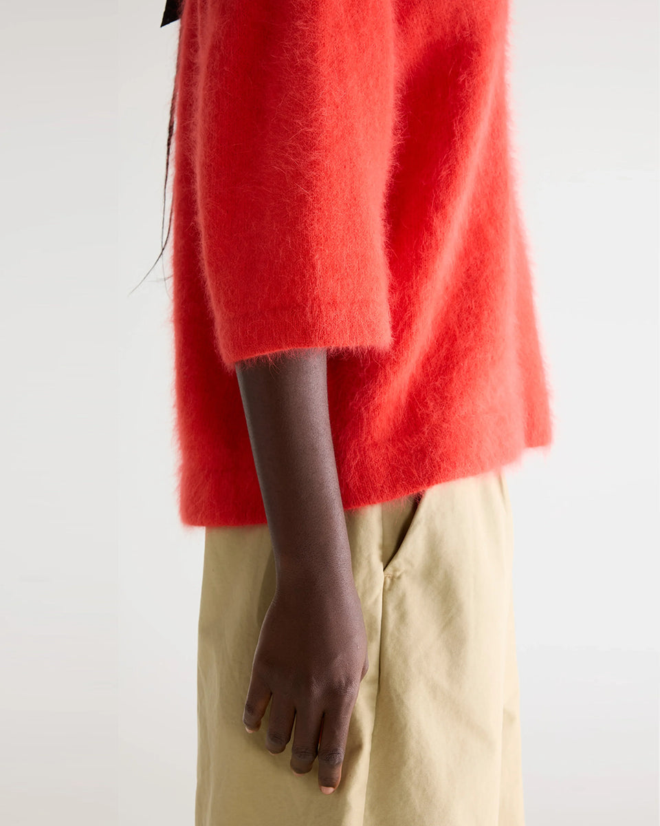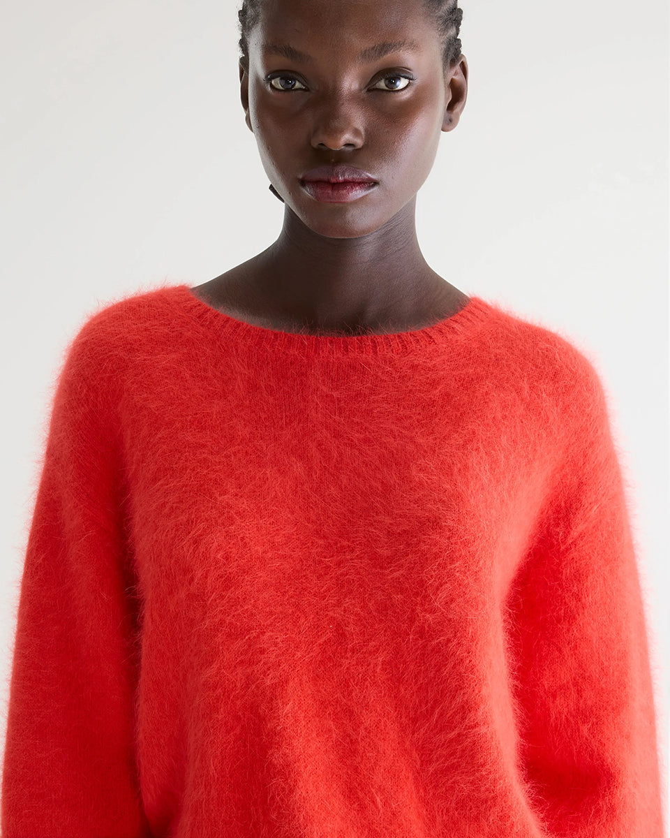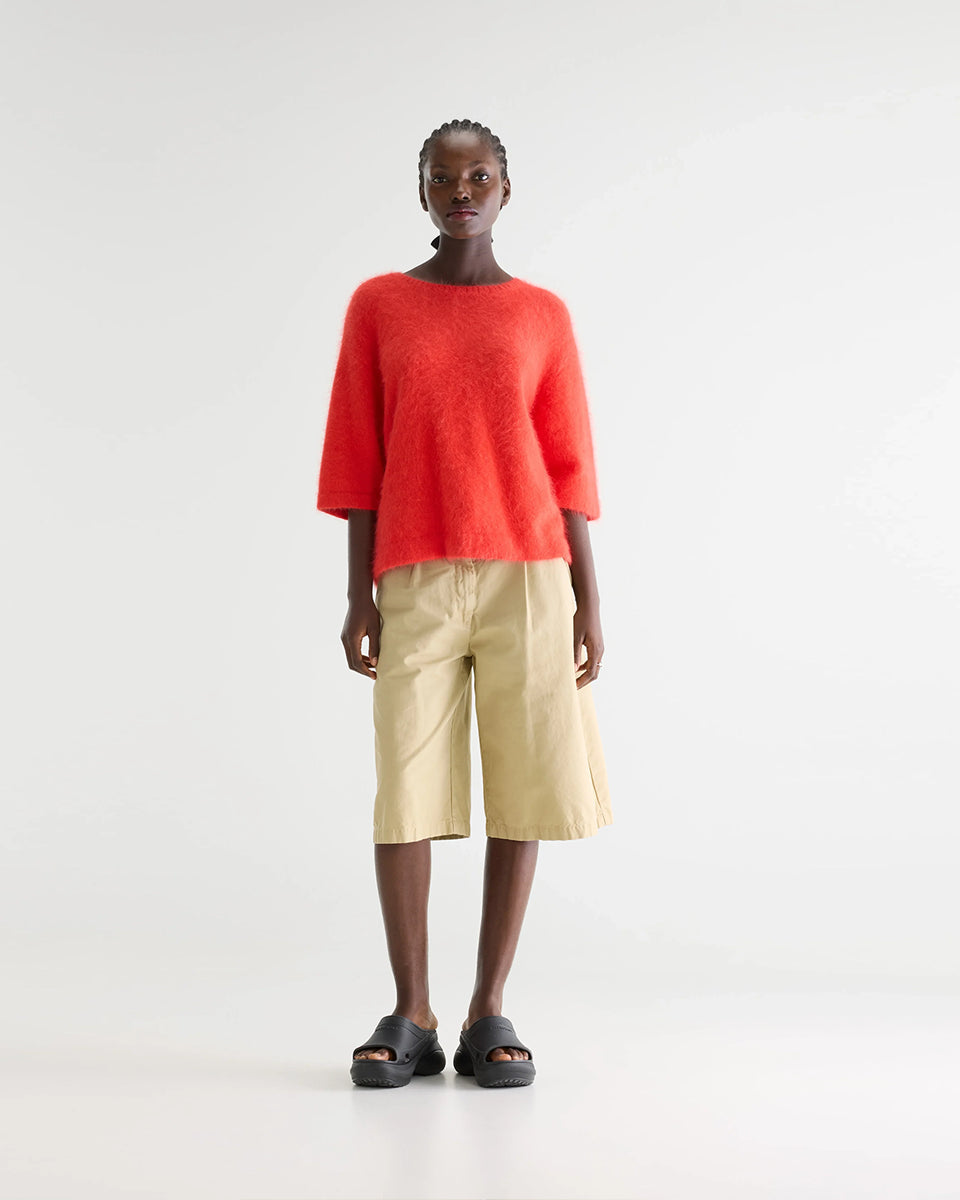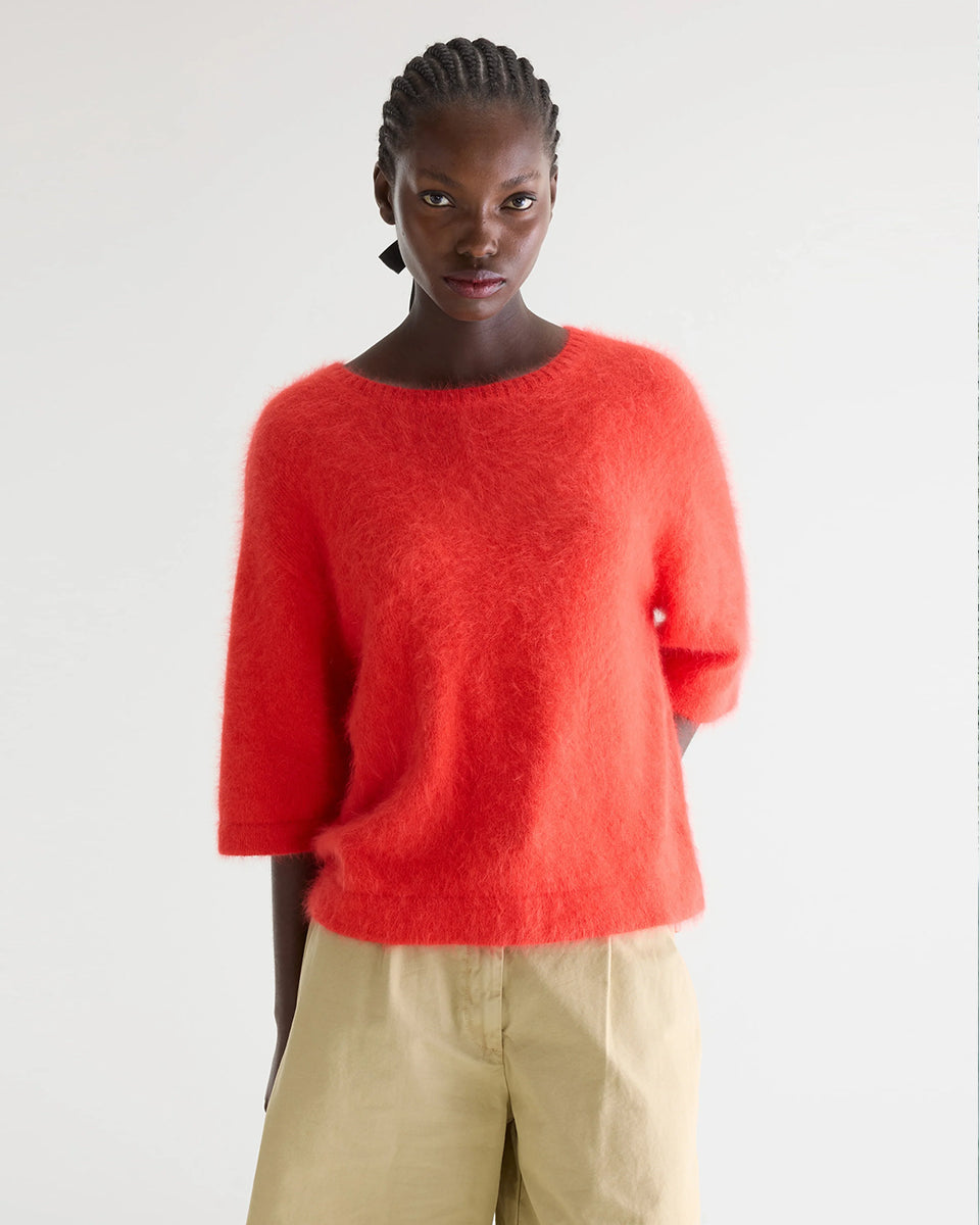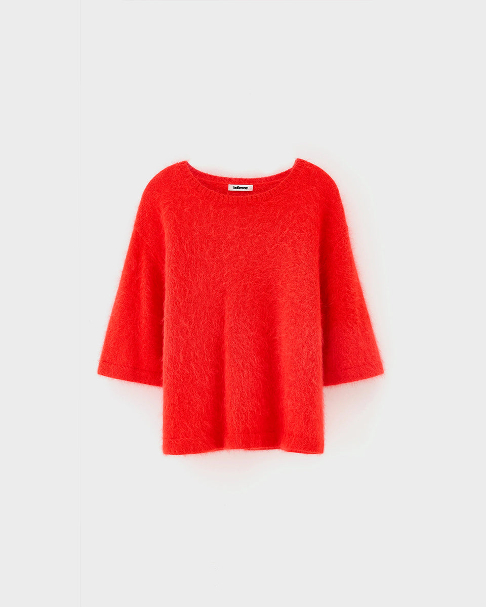 Luźny, pudełkowy sweter Dime Salsa marki BELLEROSE z okrągłym dekoltem typu łódka i rękawami do łokci, co nadaje mu lżejszego, wiosennego charakteru. Wykończony jest delikatnymi ściągaczami. Wykonany z wysokiej jakości dzianiny z angorą.