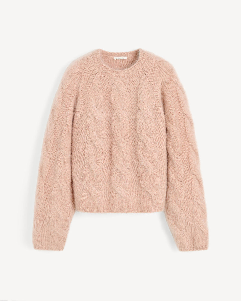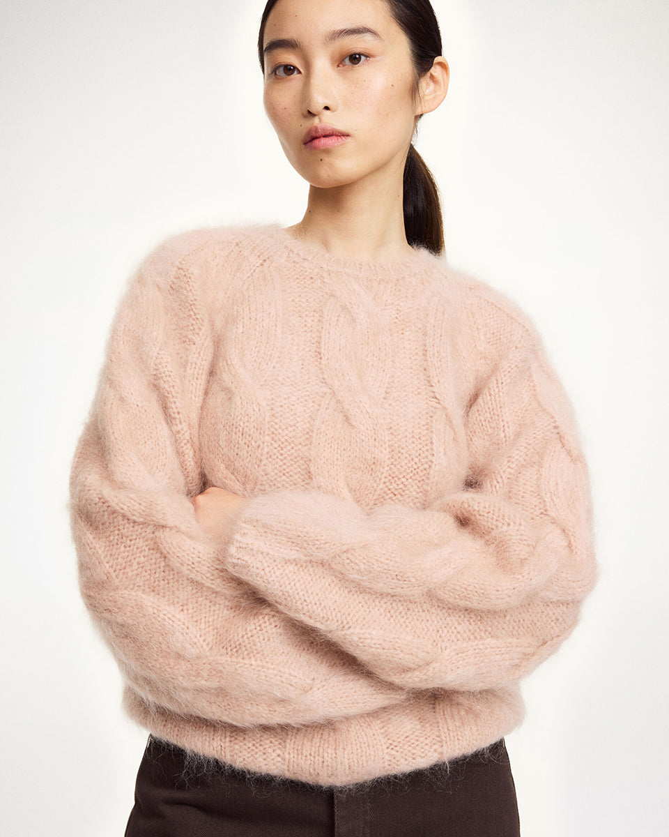 Ciepły, klasyczny sweter Elliot Rose By Malene Birger z okrągłym dekoltem i długimi rękawami w warkoczowy splot. Ma luźny, prosty krój. Wykonany z mieszanki moheru i wełny. Noś go jako element garderoby warstwowej na chłodne dni.