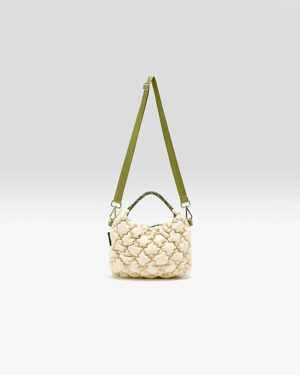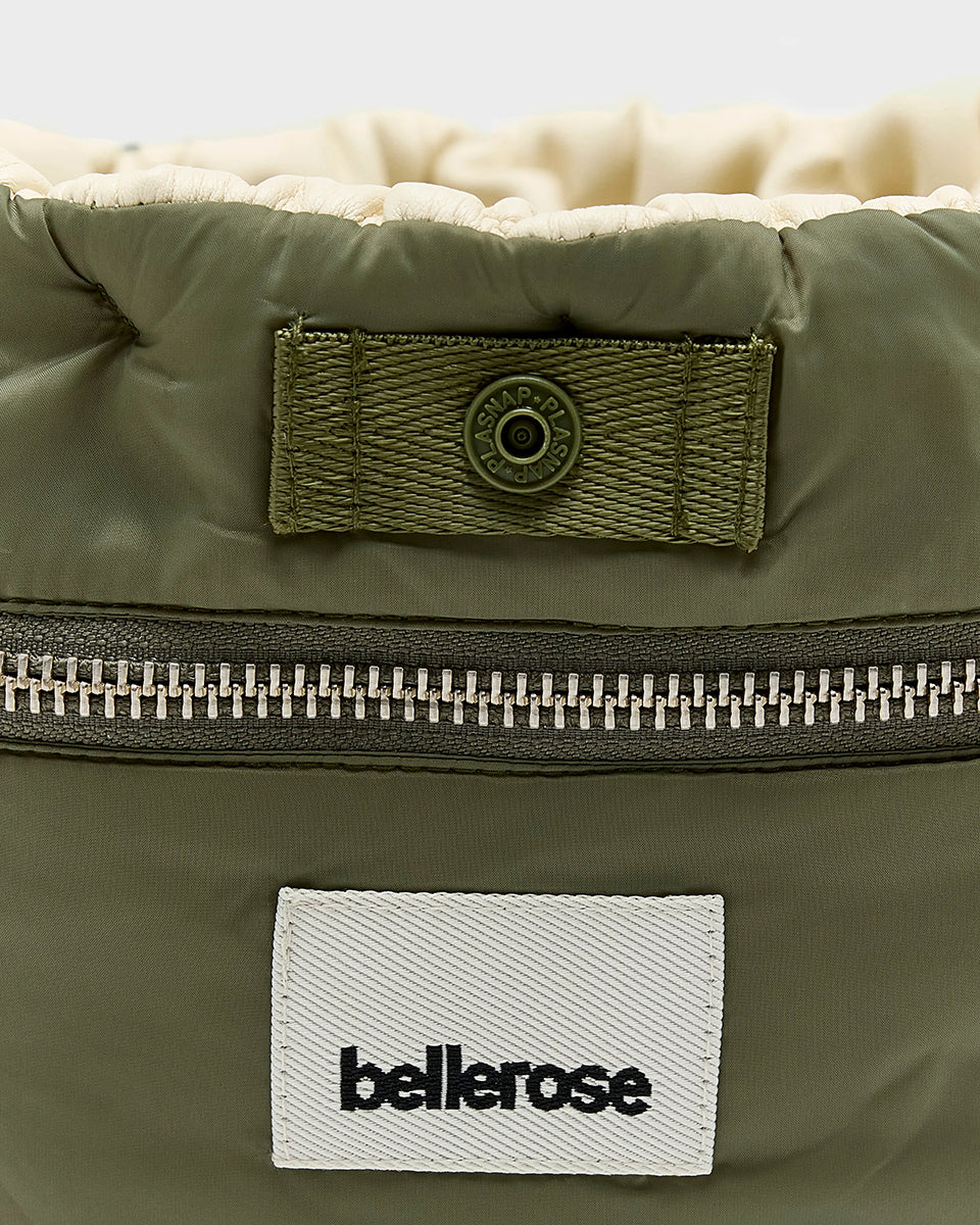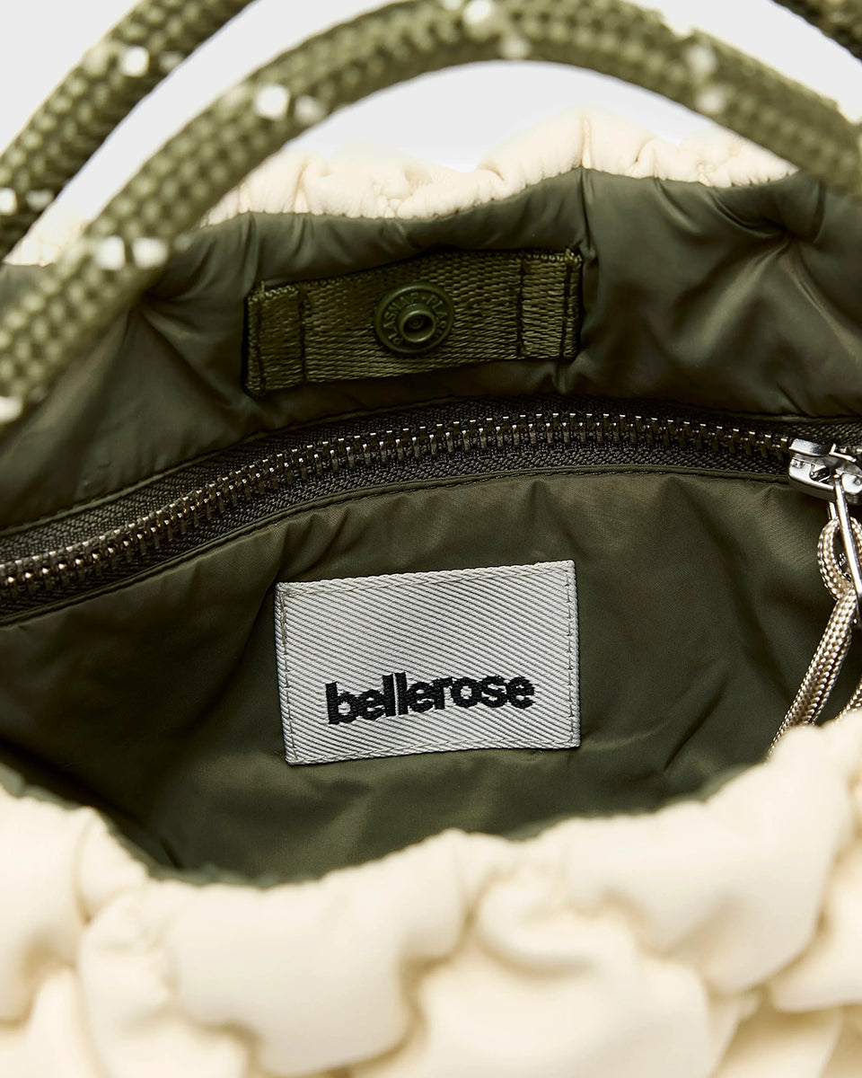 Pikowana torebka na ramię Helcro Cream marki BELLEROSE z kremowej skóry ekologicznej z teksturowanym wykończeniem. Zapinana na zatrzask. Posiada podwójne rączki ze sznurka oraz odpinany, regulowany pasek na ramię. Wewnątrz ma podszewkę w kolorze khaki oraz kieszeń zapinaną na zamek, z naszywką z logo marki.